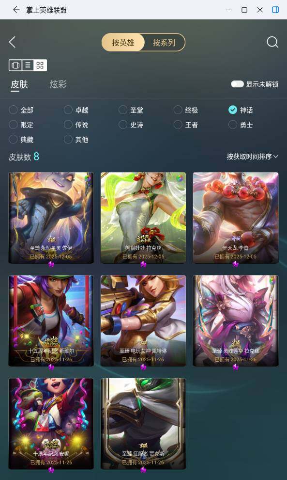 【神话皮肤】:十周年纪念安妮,十五周年纪念希维尔,圣天龙李青,熊猫娃娃拉克丝,至臻征服者贾克斯,至臻电玩女神凯特琳