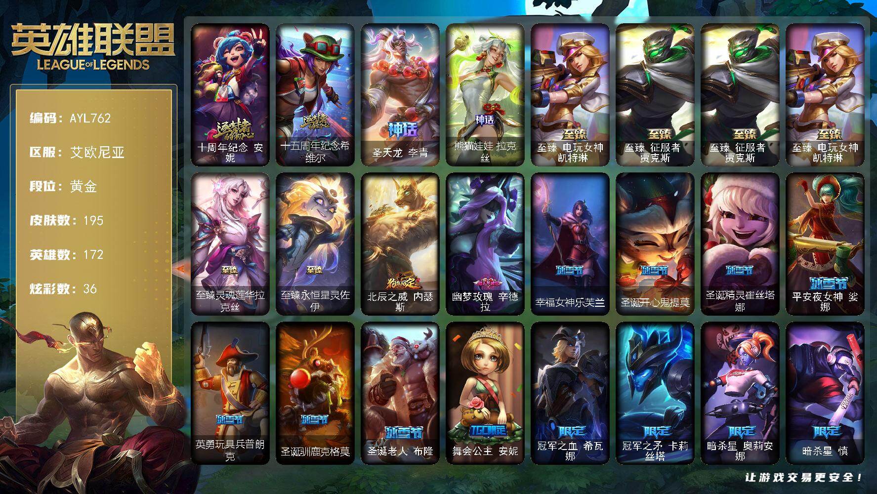 [16891255]黄金段位-172英雄-195皮肤-36炫彩-0终极-8神话-35限定-16传说-56史诗 【神话皮肤】:十周年纪念安妮,十五周年纪念希维尔,圣天龙李青,熊猫娃娃拉克丝,至臻征服者贾克斯,至臻电玩女神凯特琳 【至臻皮肤】:至臻征服者贾克斯,至臻电玩女神凯特琳,至臻灵魂莲华拉克丝,至臻永恒星灵佐伊 【臻彩皮肤】:持七彩冰棍的雪人易 【年限皮肤】:北辰之威内瑟斯 【情人节限定】:幽梦玫瑰辛德拉 【冰雪限定】:幸福女神乐芙兰,圣诞开心鬼提莫,圣诞精灵崔丝塔娜,平安夜女神娑娜,英勇玩具兵普朗克,圣诞驯鹿克格莫,圣诞老人布隆 【限定皮肤】:舞会公主安妮,冠军之血希瓦娜,冠军之矛卡莉丝塔,暗杀星奥莉安娜,暗杀星慎,SSW锤石,安妮梦游仙境,勇敢的心德莱厄斯,胜利女神莫甘娜,胜利女神希维尔,胜利之树茂凯,胜利枪神格雷福斯,胜利女神奥莉安娜,胜利巨口克格莫,胜利剑圣易,胜利之运崔斯特,胜利女神菲奥娜,海贼瑞兹,南瓜头费德提克,无头骑士赫卡里姆,外星装甲库奇,暗影沃里克,玉剑传说星仙子,防暴天使凯尔,惊悚派对费德提克 【传说皮肤】:战地机甲厄加特,大天使长米迦勒凯尔,源计划林易,恶魔男爵瑞兹,烈焰雄心崔丝塔娜,至尊魔女莫甘娜,绅士科加斯,双重冰晶艾尼维亚,太空律动猫猫布里和里茨,地狱行者孙悟空,神龙尊者圣龙李青,黯黑魔龙希瓦娜,宇航员诺提勒斯,女校长菲奥娜,霸天异形卡兹克,蔷薇绅士杰斯 【史诗皮肤】:安伯斯与提妮,摄魂男爵弗拉基米尔,战争机器赛恩,战场公主希维尔,兔宝宝提莫,国王泰达米尔,刀锋女王莫甘娜,黑色荆棘莫甘娜,炼金狂士辛吉德,侏罗纪化石科加斯,熔火之心拉莫斯,飞越疯人院萨科,寒冰女皇迦娜,血石诅咒塔里克,抵抗军天使凯特琳,铁血狙击手凯特琳,沙漠风暴卡特琳娜,蓝焰梦魔魔腾,死亡绽放伊莉丝,腥红之月伊莉丝,V字仇杀者布兰德,至高之拳李青,深海妖姬卡西奥佩娅,战地机甲斯卡纳,军神战甲波比,星之守护者波比,死亡领主莫德凯撒,至高君王玛尔扎哈,兔女郎锐雯,深海怪鱼克格莫,战地机甲克格莫,战国大名慎,沙之守护泽拉斯,海牛猎手菲兹,银河魔装机神菲兹,铁血猎人雷恩加尔,暗黑武士雷恩加尔,白色死神韦鲁斯,暗星韦鲁斯,铁血帝皇德莱厄斯,天启骑士杰斯,源代码丽桑卓,暗黑女武神黛安娜,血羽凤凰奎因,勇敢的心奎因,最后一只恐龙纳尔,萌侦探喵尔摩斯,邪恶魔人扎克,腥红之月亚索,五星大厨塔姆,源计划雷卢