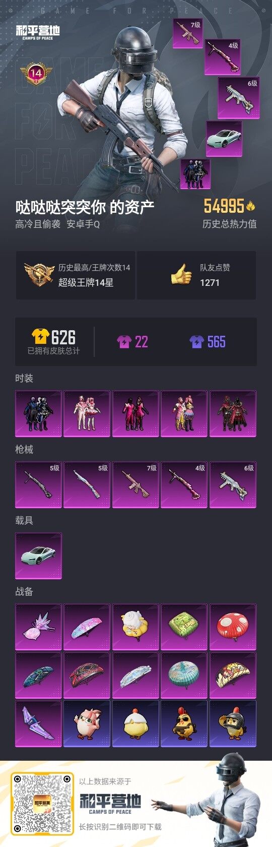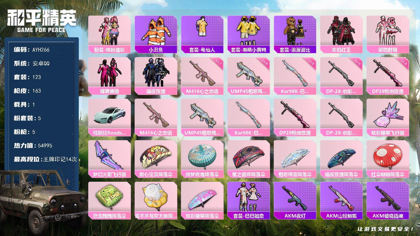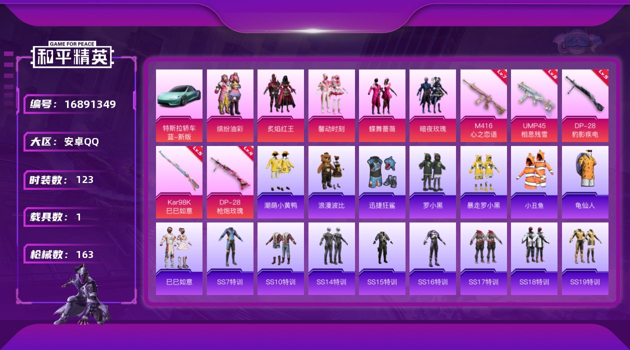 [16891349]安卓 手Q-5粉装-5特效枪-1载具-2粉色飞行器-54995热力值-14王牌印记-123套装-163枪皮
