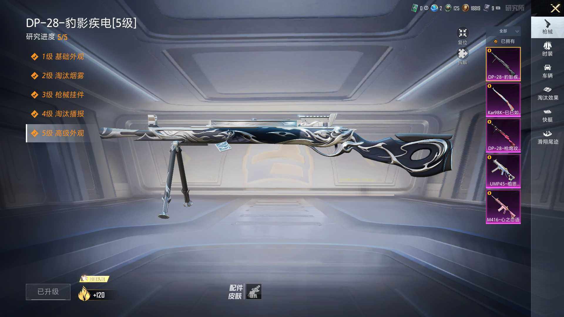 【粉色枪皮等级】:M416-心之恋语(七级),UMP45-相思残雪(六级),Kar98K-巳巳如意(五级),DP-28-枪炮玫瑰(四级),DP-28-豹影疾电(五级)