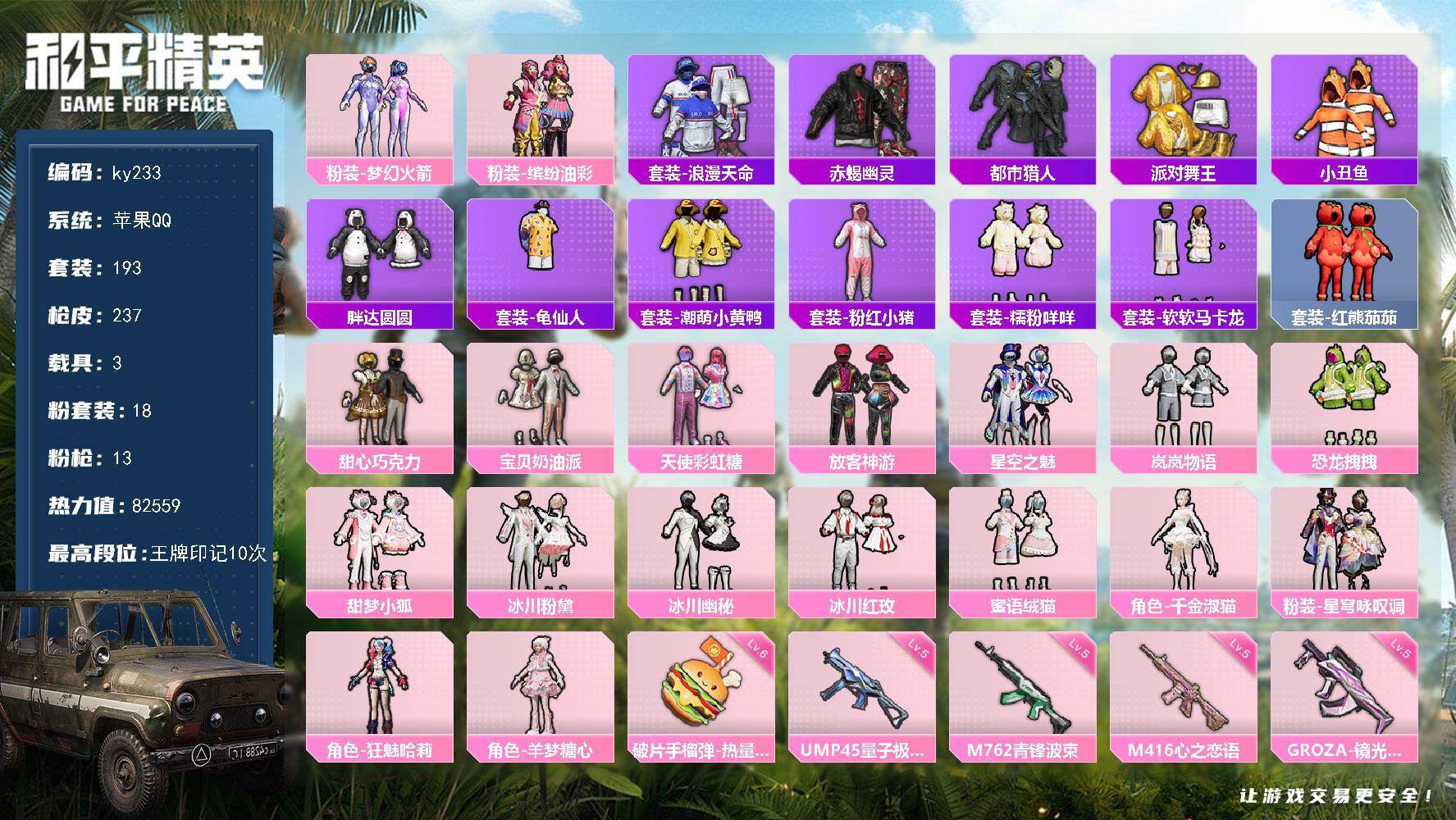 [16891483]苹果 手Q-18粉装-13特效枪-3载具-8粉色飞行器-82559热力值-10王牌印记-193套装-237枪皮