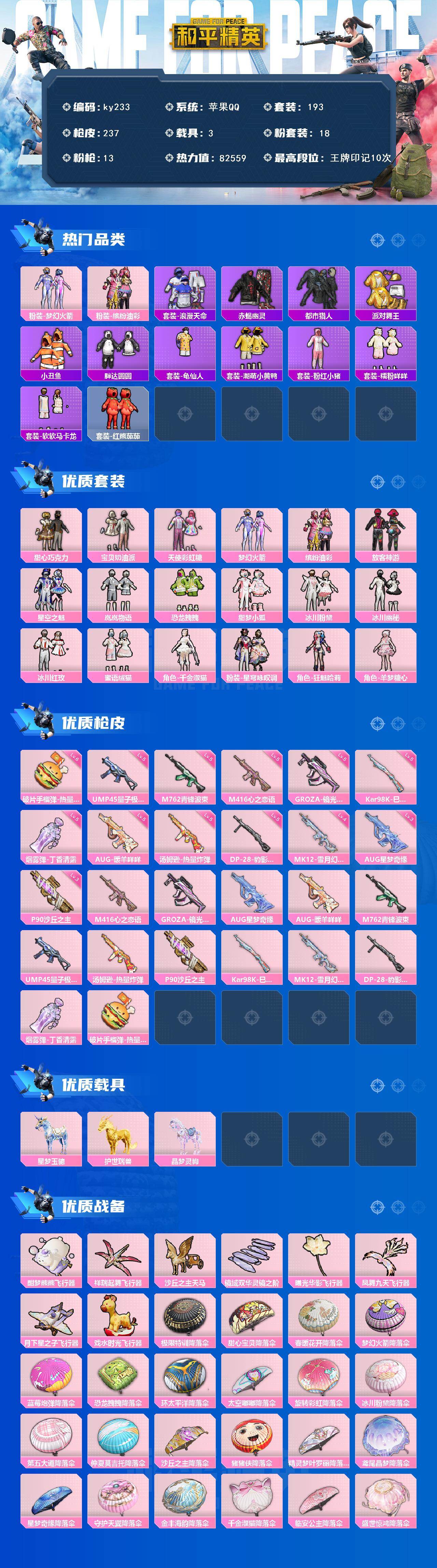 [16891483]苹果 手Q-18粉装-13特效枪-3载具-8粉色飞行器-82559热力值-10王牌印记-193套装-237枪皮 【热门品类】:粉装-梦幻火箭,粉装-缤纷油彩,套装-浪漫天命,套装-赤蝎幽灵,套装-都市猎人,套装-派对舞王,套装-小丑鱼,套装-胖达圆圆,套装-龟仙人,套装-潮萌小黄鸭,套装-粉红小猪,套装-糯粉咩咩,套装-软软马卡龙,套装-红熊茄茄 【粉色套装】:粉装-甜心巧克力,粉装-宝贝奶油派,粉装-天使彩虹糖,粉装-梦幻火箭,粉装-缤纷油彩,粉装-放客神游,粉装-星空之魅,粉装-岚岚物语,粉装-恐龙拽拽,粉装-甜梦小狐,粉装-冰川粉黛,粉装-冰川幽秘,粉装-冰川红玫,粉装-蜜语绒猫,角色-千金淑猫,粉装-星穹咏叹调,角色-狂魅哈莉,角色-羊梦糖心 【粉色枪皮等级】:M416-心之恋语(五级),GROZA-镜光银凌(五级),AUG-星梦奇缘(三级),AUG-暖羊咩咩(五级),M762-青锋波束(五级),UMP45-量子极限(五级),汤姆逊-热量炸弹(五级),P90-沙丘之主(三级),Kar98K-巳巳如意(五级),MK12-雪月幻音(四级),DP-28-豹影疾电(五级),烟雾弹-丁香清露(五级),破片手榴弹-热量炸弹(六级) 【粉色载具】:星梦玉骢,护世瑞兽,晶梦灵驹 【粉色枪皮】:M416-心之恋语,GROZA-镜光银凌,AUG-星梦奇缘,AUG-暖羊咩咩,M762-青锋波束,UMP45-量子极限,汤姆逊-热量炸弹,P90-沙丘之主,Kar98K-巳巳如意,MK12-雪月幻音,DP-28-豹影疾电,烟雾弹-丁香清露,破片手榴弹-热量炸弹 【粉色飞行器】:酣梦熊熊飞行器,祥瑞起舞飞行器,沙丘之主天马,镜域双华-灵镜之阶,曦光华影飞行器,凤舞九天飞行器,月下星之子飞行器,戏水时光飞行器 【粉色降落伞】:极限特训降落伞,甜心宝贝降落伞,春暖花开降落伞,梦幻火箭降落伞,蓝莓炮弹降落伞,恐龙拽拽降落伞,环太平洋降落伞,太空嘟嘟降落伞,旋转彩虹降落伞,冰川粉黛降落伞,第五大道降落伞,仲夏莫吉托降落伞,沙丘之主降落伞,猪猪侠降落伞,精灵梦叶罗丽降落伞,鸢尾晶梦降落伞,星梦奇缘降落伞,守护天翼降落伞,金丰海韵降落伞,千金淑猫降落伞,临安公主降落伞,盛世惊鸿降落伞,雪月幻音降落伞,星穹咏叹调降落伞,双重狂想降落伞,荧海星豚降落伞,炫彩糖果降落伞 【稀有套装】:套装-龟仙人,套装
