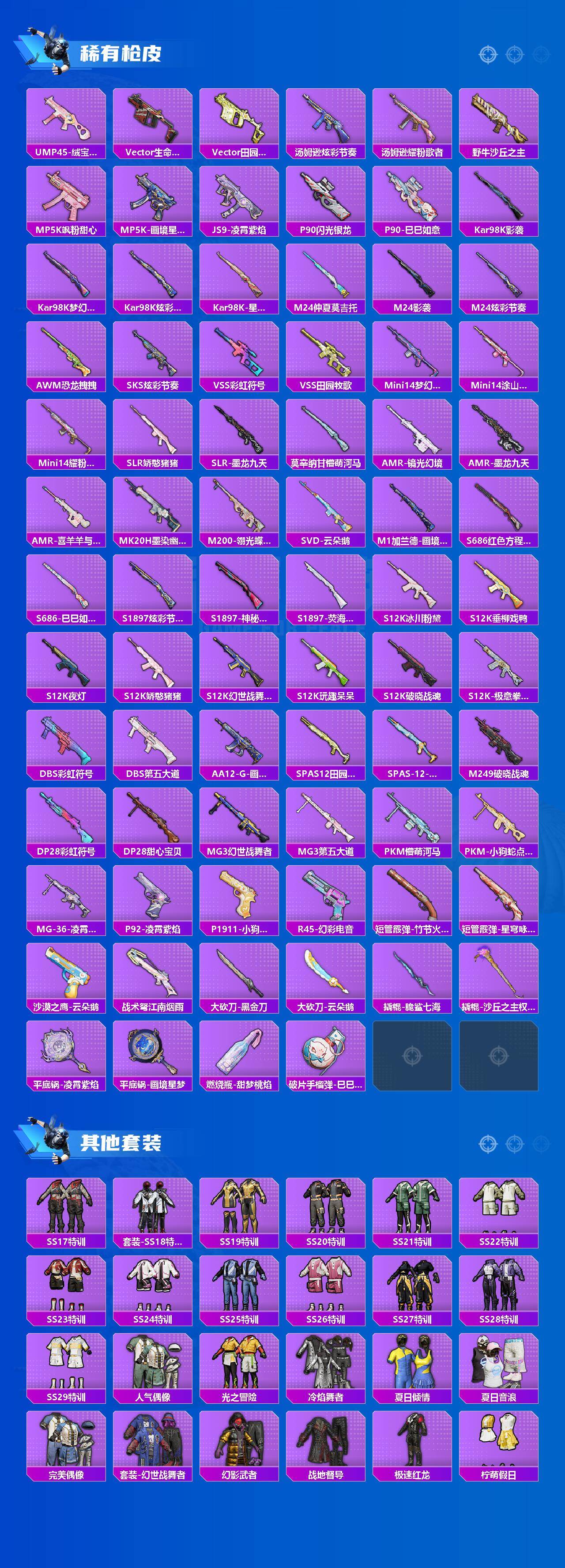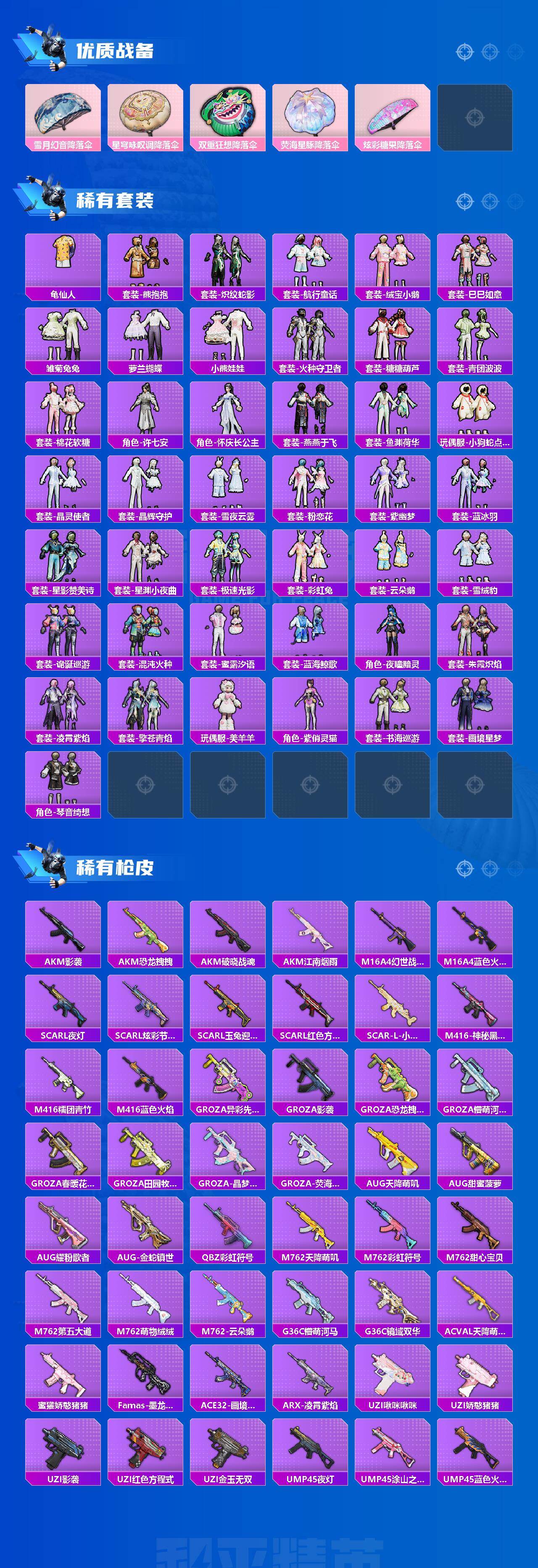 M416-心之恋语,GROZA-镜光银凌,AUG-星梦奇缘,AUG-暖羊咩咩,M762-青锋波束,UMP45-量子极限,P90-沙丘之主,Kar98K-巳巳如意,MK12-雪月幻音,烟雾弹-丁香清露,破片手榴弹-热量炸弹