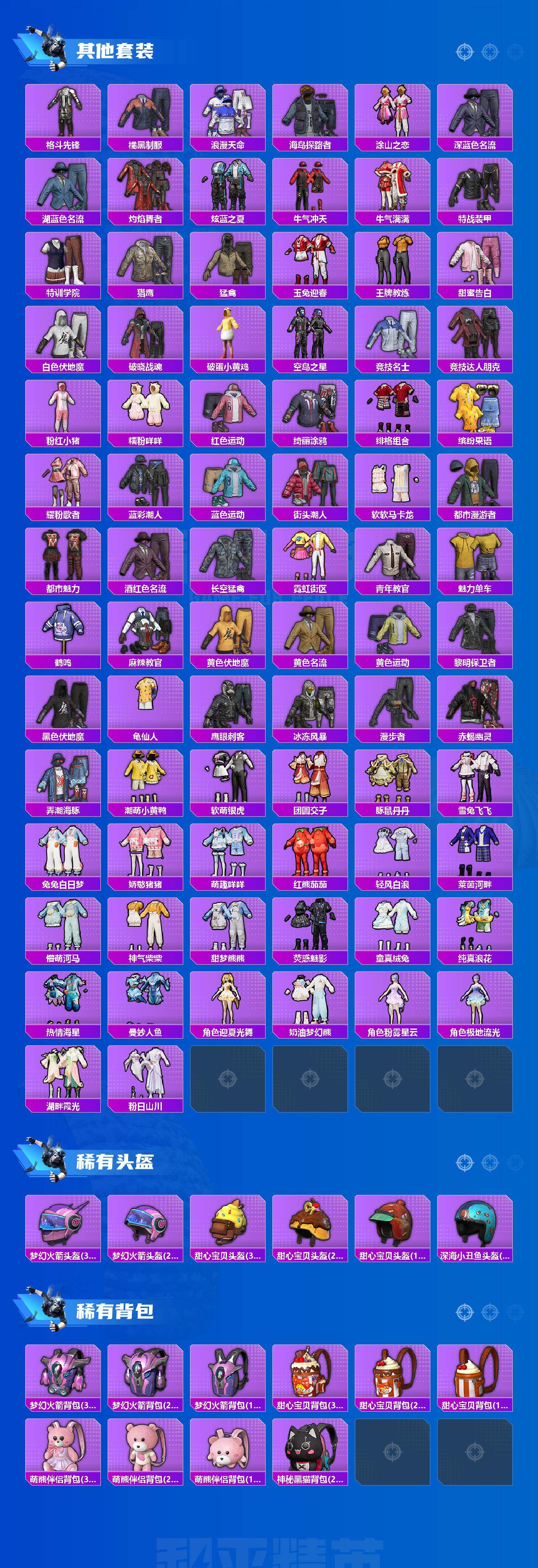 套装-梦幻火箭,套装-缤纷油彩,套装-赤蝎幽灵,套装-都市猎人,套装-派对舞王,套装-胖达圆圆,套装-潮萌小黄鸭,套装-宝贝奶油派,套装-天使彩虹糖,套装-放客神游,套装-星空之魅,岚岚物语套装,恐龙拽拽套装,套装-甜梦小狐,套装-冰川粉黛,套装-冰川幽秘,套装-冰川红玫,套装-蜜语绒猫,角色-千金淑猫,套装-鹰眼刺客,套装-软萌银虎,兔兔白日梦套装
