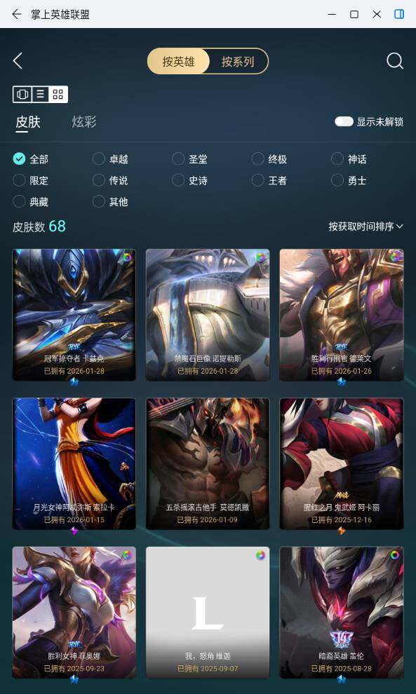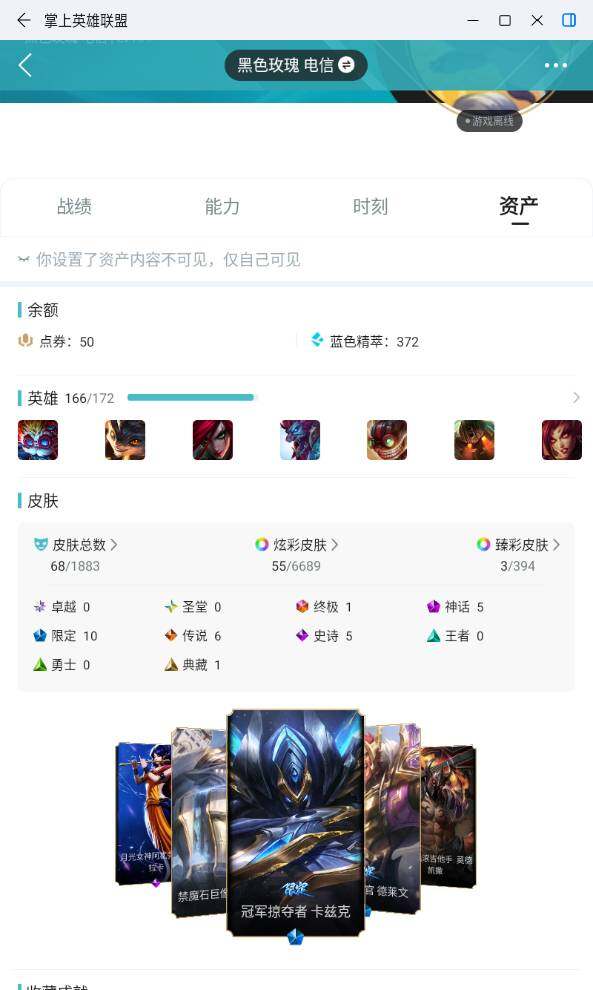 [16891740]铂金段位-166英雄-68皮肤-55炫彩-1终极-5神话-10限定-6传说-5史诗