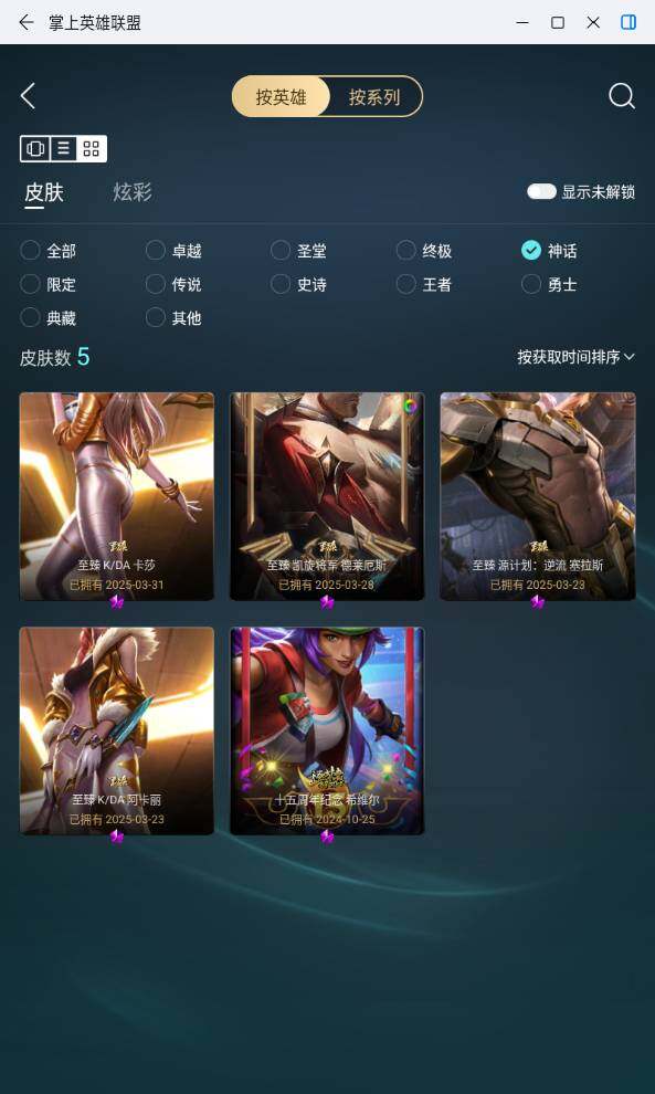 【神话皮肤】:十五周年纪念希维尔,至臻KDA阿卡丽,至臻KDA卡莎,至臻源计划逆流塞拉斯