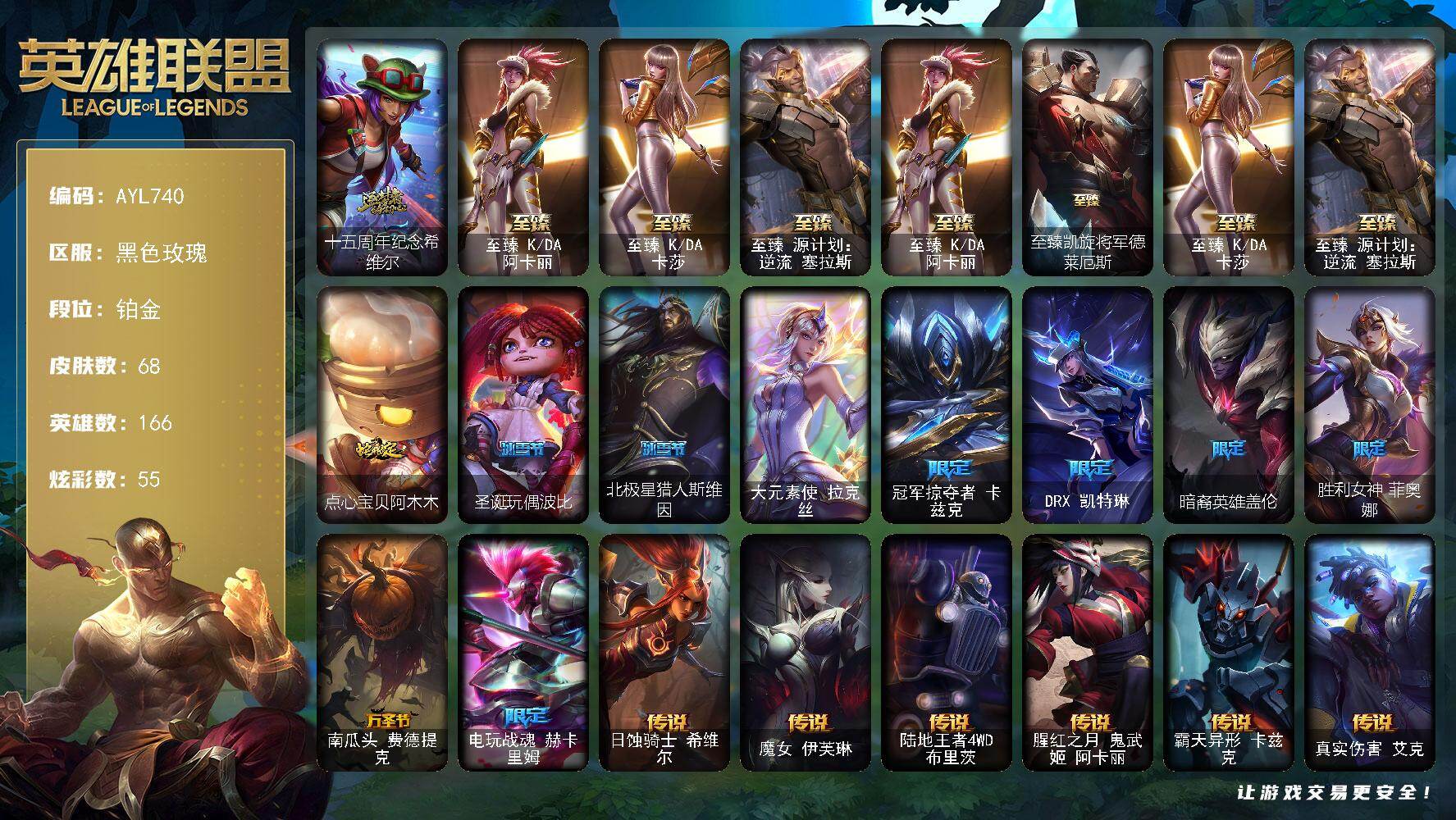 [16891740]铂金段位-166英雄-68皮肤-55炫彩-1终极-5神话-10限定-6传说-5史诗 【神话皮肤】:十五周年纪念希维尔,至臻KDA阿卡丽,至臻KDA卡莎,至臻源计划逆流塞拉斯 【至臻皮肤】:至臻KDA阿卡丽,至臻凯旋将军德莱厄斯,至臻KDA卡莎,至臻源计划逆流塞拉斯 【臻彩皮肤】:冠军之刃锐雯2016凯旋圣装,玉剑传说无极麒麟,灵魂莲华锐雯流火 【年限皮肤】:点心宝贝阿木木 【冰雪限定】:圣诞玩偶波比,北极星猎人斯维因 【终极皮肤】:大元素使拉克丝 【限定皮肤】:冠军掠夺者卡兹克,DRX凯特琳,暗裔英雄盖伦,胜利女神菲奥娜,南瓜头费德提克,电玩战魂赫卡里姆 【传说皮肤】:日蚀骑士希维尔,魔女伊芙琳,陆地王者4WD布里茨,腥红之月鬼武姬阿卡丽,霸天异形卡兹克,真实伤害艾克 【史诗皮肤】:月光女神阿忒弥斯索拉卡,海克斯科技迦娜,源计划火菲奥娜,沙之守护卡兹克,源计划风亚索 【典藏皮肤】:深潜蛙人古拉加斯 【其他皮肤1】:咖啡甜心安妮,黑暗骑士奥拉夫,波江星神弗拉基米尔,沙之守护瑞兹,最高清算赛恩,约德尔海贼团崔丝塔娜,丛林侠盗艾希,我怒角维迦,双城之战凯特琳,战场BOSS布里茨,奥德赛墨菲特,黎明使者雷克顿,黑色玫瑰假面舞会伊莉丝,小蜜蜂奥莉安娜,神龙尊者魔龙布兰德,黑夜使者李青,灵魂莲华薇恩,蛇发女妖卡西奥佩娅,太空律动狗头内瑟斯,枭姬孙尚香,斯巴达之魂潘森,五杀摇滚吉他手莫德凯撒,战斗学院蕾欧娜,最高清算泰隆,杀出重围格雷福斯,禁魔石巨像诺提勒斯,源计划统帅瑟庄妮,西部魔影赫卡里姆,人马星神赫卡里姆,双城之战杰斯,光明骑士奎因,奥德赛金克丝,正义假面卢锡安,任性学霸艾克,玉剑传说寒潭夭夭,花仙骑士卡莉丝塔,永恒之森洛,灵能特工派克,黎明使者薇古丝,正义假面永恩