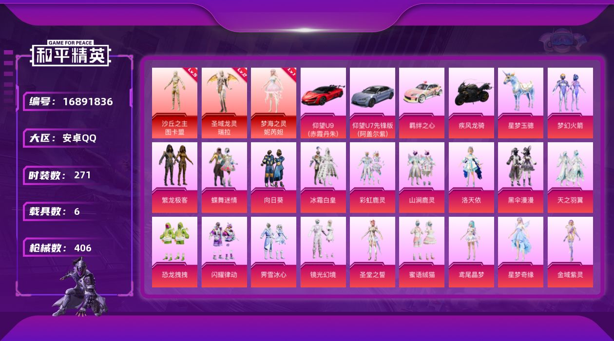 [16891836]安卓 手Q-3神装-23粉装-14特效枪-6载具-18粉色飞行器-152587热力值-18王牌印记-271套装-406枪皮 【红色神装等级】:圣域龙灵-瑞拉(二级),梦海之灵-妮芮妲(一级),沙丘之主-图卡盟(五级) 【红色角色神装】:圣域龙灵-瑞拉,梦海之灵-妮芮妲,沙丘之主-图卡盟 【热门品类】:粉装-梦幻火箭,粉装-繁龙极客,套装-潮萌小黄鸭,套装-浪漫波比,套装-粉红小猪,角色-8号机,角色-Mark.06,角色-六号稻草人 【粉色套装】:粉装-蝶舞迷情,粉装-梦幻火箭,粉装-向日葵,粉装-冰霜白皇,粉装-彩虹鹿灵,粉装-山涧鹿灵,角色-洛天依,粉装-黑伞漫漫,粉装-天之羽翼,粉装-恐龙拽拽,粉装-闪耀律动,粉装-霁雪冰心,粉装-镜光幻境,角色-圣堂之誓,粉装-繁龙极客,粉装-蜜语绒猫,角色-鸢尾晶梦,角色-星梦奇缘,角色-金域紫灵,粉装-金丰海韵,角色-千金淑猫,粉装-星穹咏叹调,粉装-幻彩电音 【粉色枪皮等级】:AKM-暮色玫影(三级),SCAR-L-锦绣绵绵(五级),M416-墨龙九天(三级),AUG-星梦奇缘(三级),Vector-最终圣卫者(三级),P90-沙丘之主(三级),Kar98K-巳巳如意(五级),Kar98K-圣域龙灵(一级),Mk14-甜梦熊击(五级),AMR-智耀战神(六级),M200-梦海之灵(三级),DP-28-豹影疾电(五级),MG3-洛神天依(六级),MG-36-沧焰双生(五级) 【粉色载具】:仰望U9(赤霞丹朱),仰望U7(阿盖尔紫),羁绊之心,疾风龙骑,星梦玉骢,暮色幽蹄 【粉色枪皮】:AKM-暮色玫影,SCAR-L-锦绣绵绵,M416-墨龙九天,AUG-星梦奇缘,Vector-最终圣卫者,P90-沙丘之主,Kar98K-巳巳如意,Kar98K-圣域龙灵,Mk14-甜梦熊击,AMR-智耀战神,M200-梦海之灵,DP-28-豹影疾电,MG3-洛神天依,MG-36-沧焰双生 【粉色飞行器】:炫彩糖果飞行器,梦幻火箭飞行器,绚金瑰梦飞行器,天之羽翼飞行器,沙丘之主天马,龙翔九天飞行器,幻海精灵飞行器,星梦奇缘飞行器,初号机 觉醒Ver.飞行器,深渊漩涡飞行器,英伦信使飞行器,曦光华影飞行器,圣域金龙飞行器,绯果甜心飞行器,雀灵庇佑飞行器,终晖之翼飞行器,灵猫魔法师飞行器,暮色之舞飞行器 【粉色降落伞】:绝对恒星降落伞,粉色回