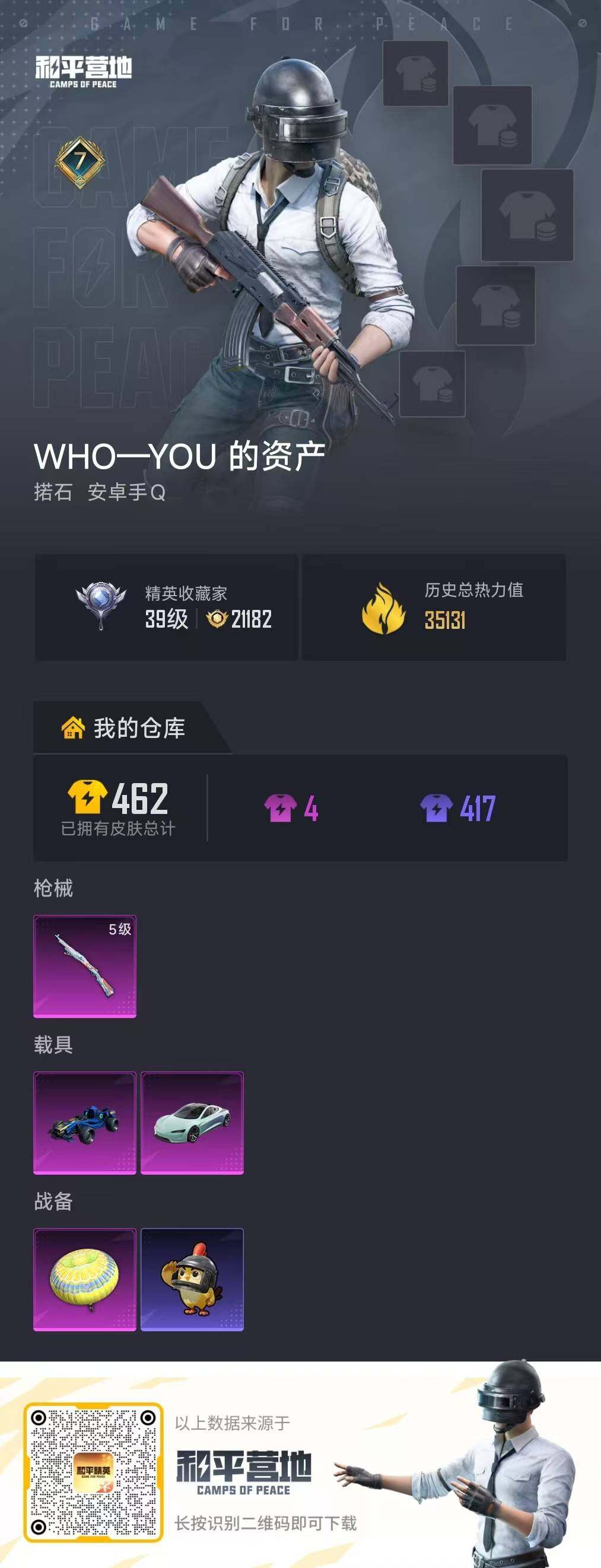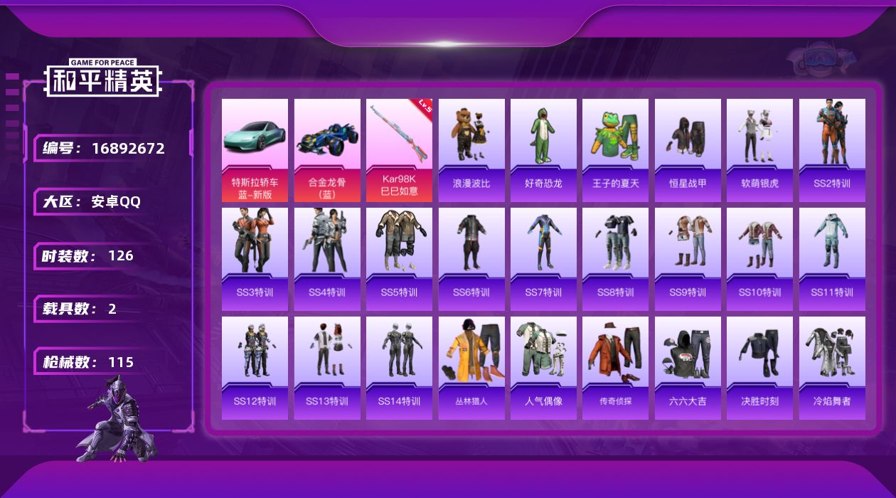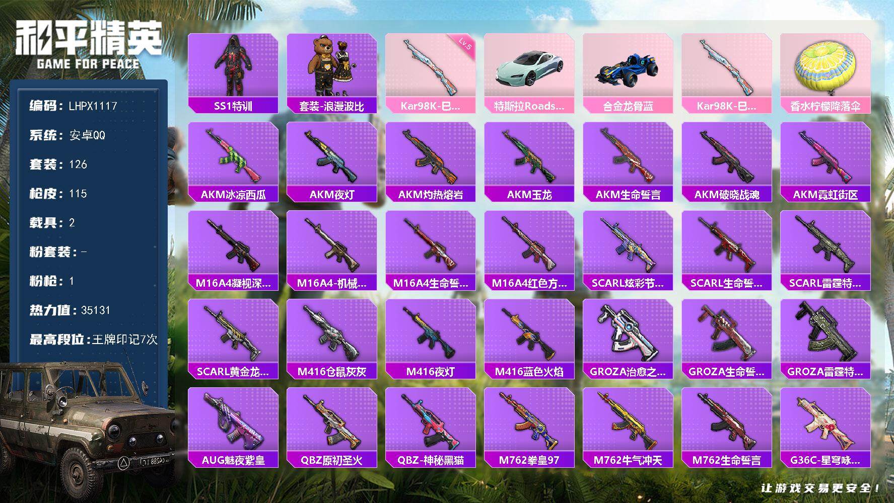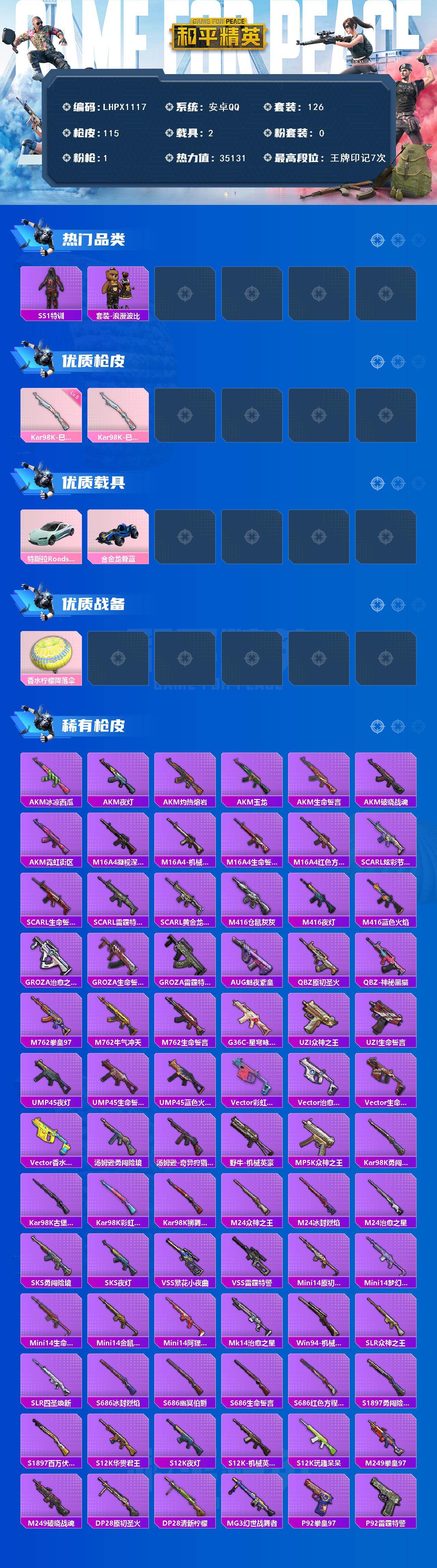 [16892672]【特价出售/店主推荐】安卓 手Q-0粉装-1特效枪-2载具-0粉色飞行器-35131热力值-7王牌印记-126套装-115枪皮 【热门品类】:套装-SS1特训,套装-浪漫波比 【粉色枪皮等级】:Kar98K-巳巳如意(五级) 【粉色载具】:特斯拉Roadster(水滴蓝),合金龙骨(蓝) 【粉色枪皮】:Kar98K-巳巳如意 【粉色降落伞】:香水柠檬降落伞 【稀有枪皮】:AKM-冰凉西瓜,AKM-夜灯,AKM-灼热熔岩,AKM-玉龙,AKM-生命誓言,AKM-破晓战魂,AKM-霓虹街区,M16A4-凝视深渊,M16A4-机械英豪,M16A4-生命誓言,M16A4-红色方程式,SCAR-L-炫彩节奏,SCAR-L-生命誓言,SCAR-L-雷霆特警,SCAR-L-黄金龙骨,M416-仓鼠灰灰,M416-夜灯,M416-蓝色火焰,GROZA-治愈之星,GROZA-生命誓言,GROZA-雷霆特警,AUG-魅夜紫皇,QBZ-原初圣火,QBZ-神秘黑猫,M762-拳皇97,M762-牛气冲天,M762-生命誓言,G36C-星穹咏叹调,UZI-众神之王,UZI-生命誓言,UMP45-夜灯,UMP45-生命誓言,UMP45-蓝色火焰,Vector-彩虹符号,Vector-治愈之星,Vector-生命誓言,Vector-香水柠檬,汤姆逊-勇闯险境,汤姆逊-奇异狩猎者,野牛-机械英豪,MP5K-众神之王,Kar98K-勇闯险境,Kar98K-古堡领主,Kar98K-彩虹符号,Kar98K-狮舞迎春,M24-治愈之星,M24-众神之王,M24-冰封烈焰,SKS-勇闯险境,SKS-夜灯,VSS-繁花小夜曲,VSS-雷霆特警,Mini14-原初圣火,Mini14-梦幻火箭,Mini14-生命誓言,Mini14-金鼠迎春,Mini14-阿狸红,Mk14-治愈之星,Win94-机械英豪,SLR-众神之王,SLR-四圣焕新,S686-冰封烈焰,S686-幽冥伯爵,S686-生命誓言,S686-红色方程式,S1897-勇闯险境,S1897-百万伏特,S12K-玩趣呆呆,S12K-华贵君王,S12K-夜灯,S12K-机械英豪,M249-拳皇97,M249-破晓战魂,DP-28-原初圣火,DP-28-清新柠檬,MG3-幻世战舞者,P92-拳皇97,P92-雷霆特警,P1911-冰封烈焰,P18C-原初