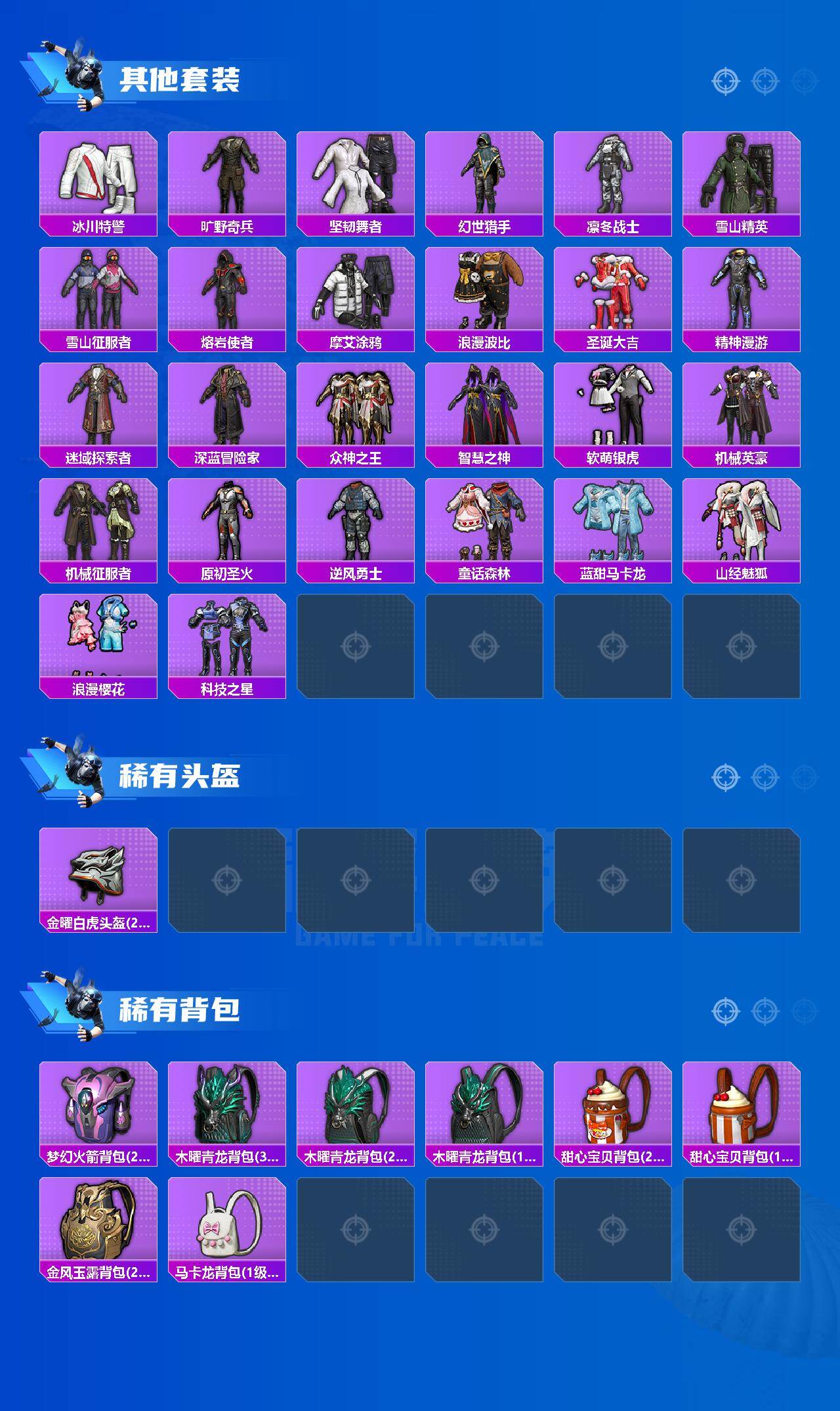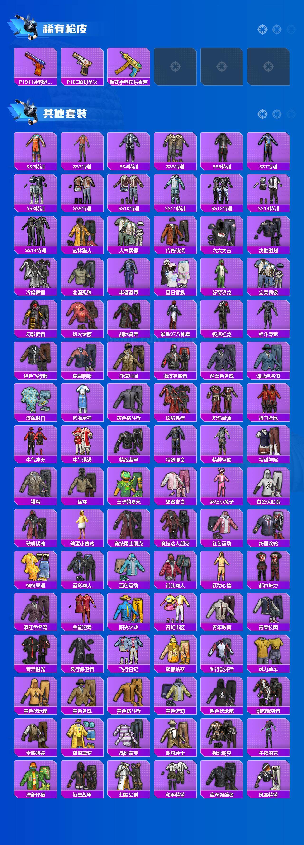 【稀有枪皮】:AKM-冰凉西瓜,AKM-夜灯,AKM-灼热熔岩,AKM-玉龙,AKM-生命誓言,AKM-破晓战魂,AKM-霓虹街区,M16A4-凝视深渊,M16A4-机械英豪,M16A4-生命誓言,M16A4-红色方程式,SCAR-L-炫彩节奏,SCAR-L-生命誓言,SCAR-L-雷霆特警,SCAR-L-黄金龙骨,M416-仓鼠灰灰,M416-夜灯,M416-蓝色火焰,GROZA-治愈之星,GROZA-生命誓言,GROZA-雷霆特警,AUG-魅夜紫皇,QBZ-原初圣火,QBZ-神秘黑猫,M762-拳皇97,M762-牛气冲天,M762-生命誓言,G36C-星穹咏叹调,UZI-众神之王,UZI-生命誓言,UMP45-夜灯,UMP45-生命誓言,UMP45-蓝色火焰,Vector-彩虹符号,Vector-治愈之星,Vector-生命誓言,Vector-香水柠檬,汤姆逊-勇闯险境,汤姆逊-奇异狩猎者,野牛-机械英豪,MP5K-众神之王,Kar98K-勇闯险境,Kar98K-古堡领主,Kar98K-彩虹符号,Kar98K-狮舞迎春,M24-治愈之星,M24-众神之王,M24-冰封烈焰,SKS-勇闯险境,SKS-夜灯,VSS-繁花小夜曲,VSS-雷霆特警,Mini14-原初圣火,Mini14-梦幻火箭,Mini14-生命誓言,Mini14-金鼠迎春,Mini14-阿狸红,Mk14-治愈之星,Win94-机械英豪,SLR-众神之王,SLR-四圣焕新,S686-冰封烈焰,S686-幽冥伯爵,S686-生命誓言,S686-红色方程式,S1897-勇闯险境,S1897-百万伏特,S12K-玩趣呆呆,S12K-华贵君王,S12K-夜灯,S12K-机械英豪,M249-拳皇97,M249-破晓战魂,DP-28-原初圣火,DP-28-清新柠檬,MG3-幻世战舞者,P92-拳皇97,P92-雷霆特警,P1911-冰封烈焰,P18C-原初