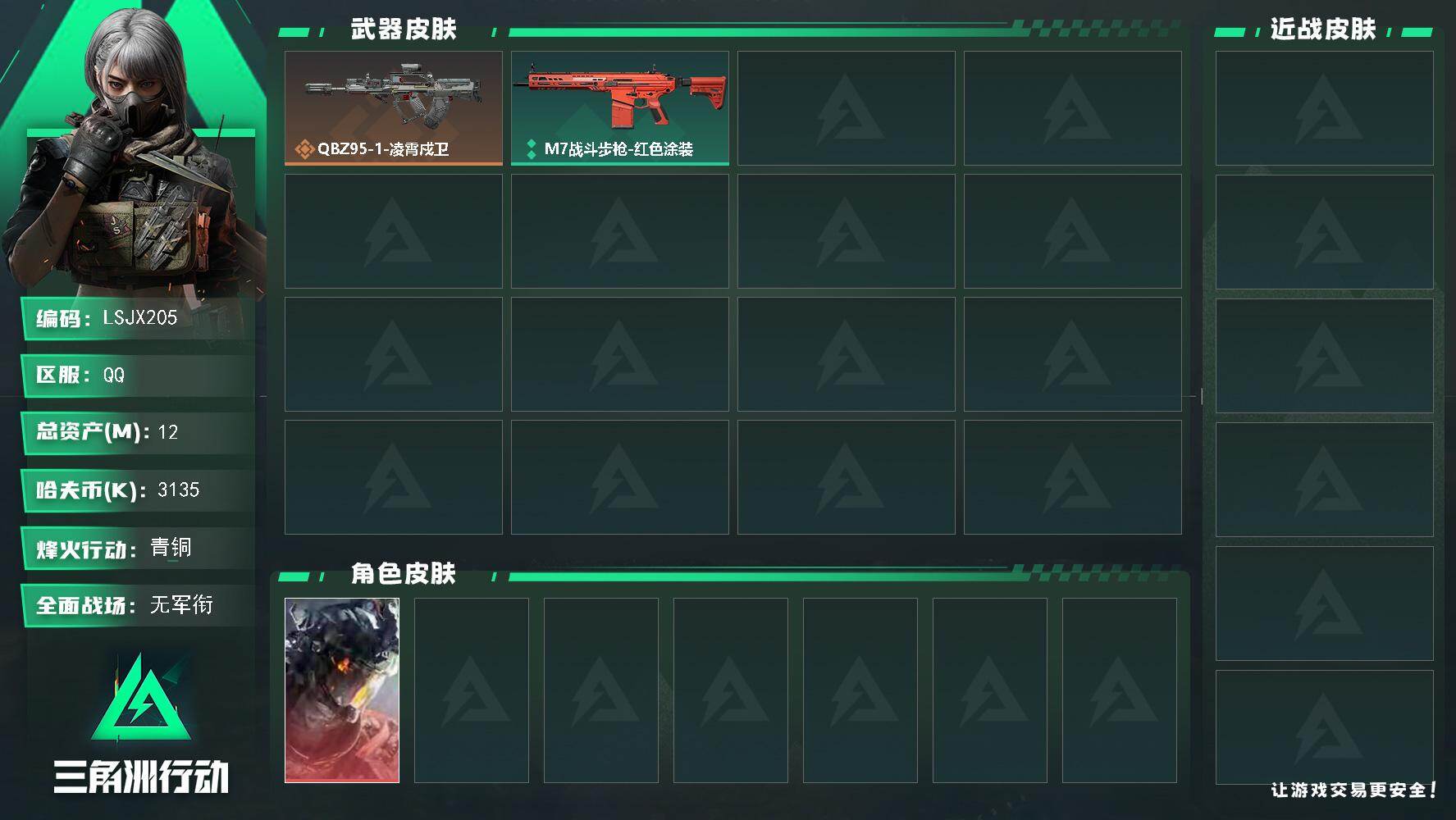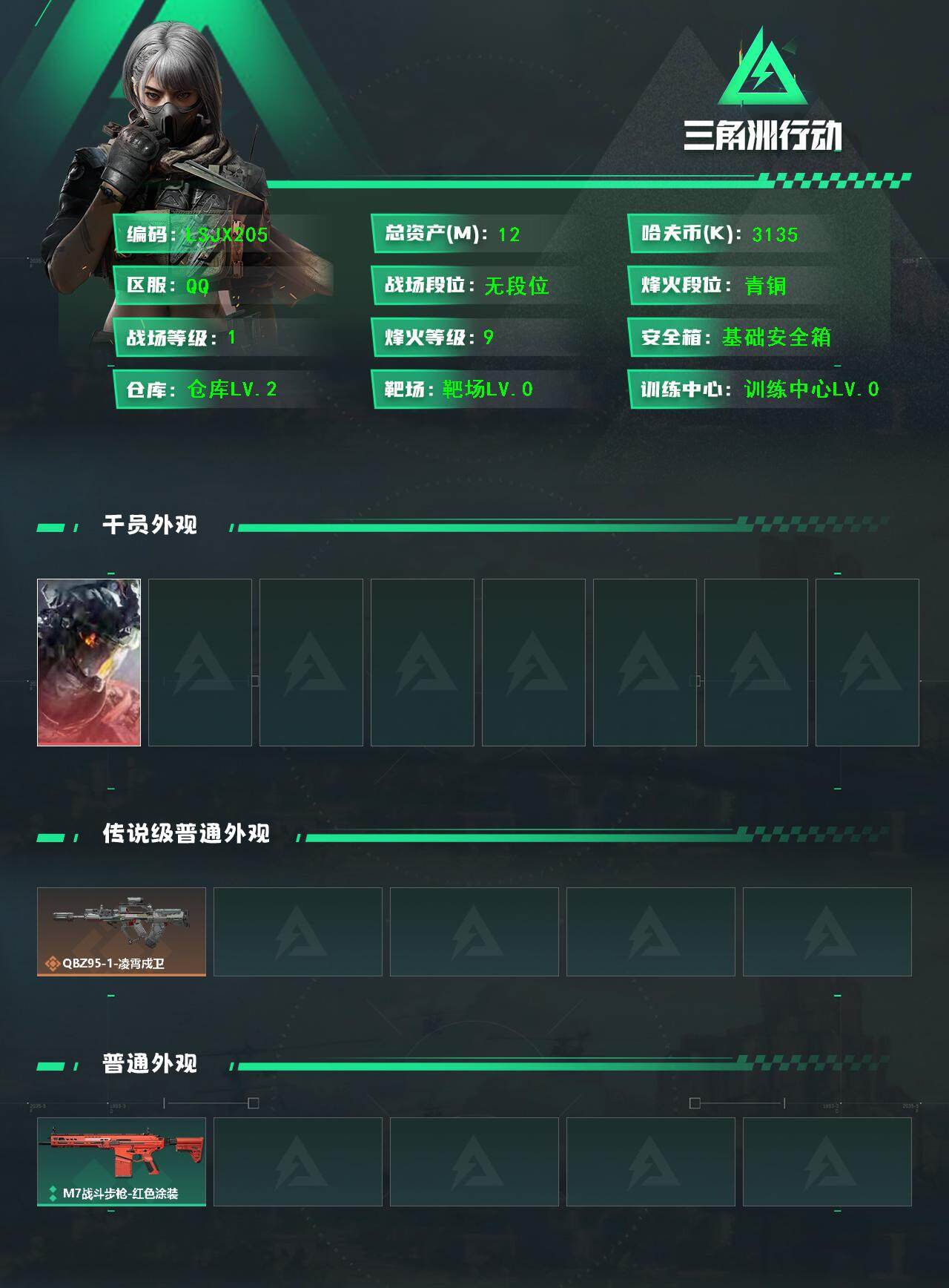 [16892761]【特价出售/店主推荐】12m总资产-3135k哈伏币-9烽火等级-青铜-1战场等级-无军衔 【干员外观】:威龙-凌霄戍卫 【传说外观】:QBZ95-1突击步枪-凌霄戍卫 【普通外观】:M7战斗步枪-红色涂装