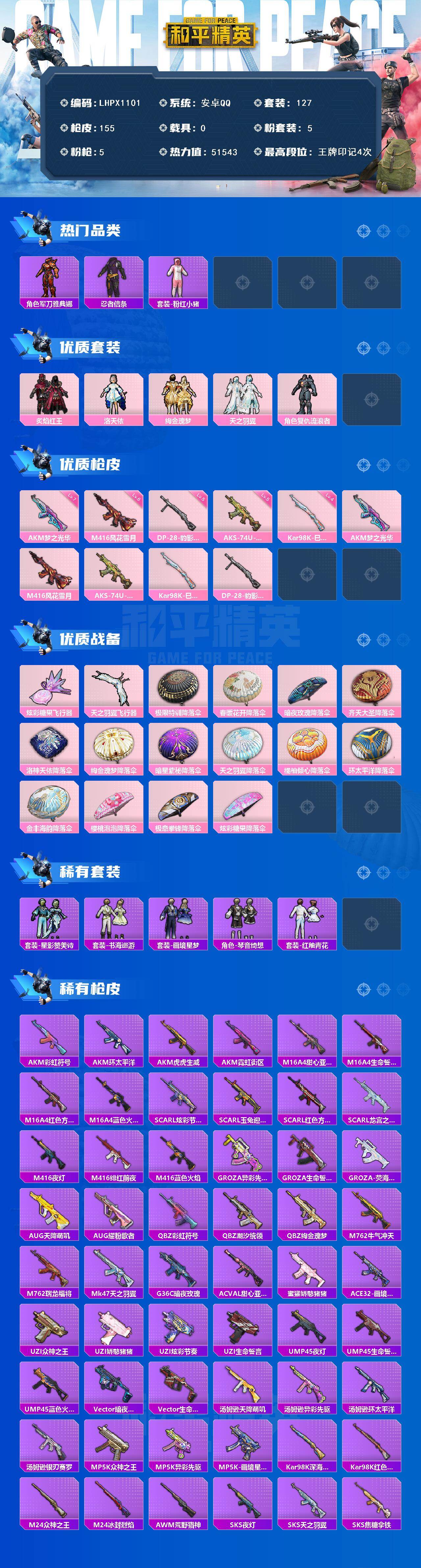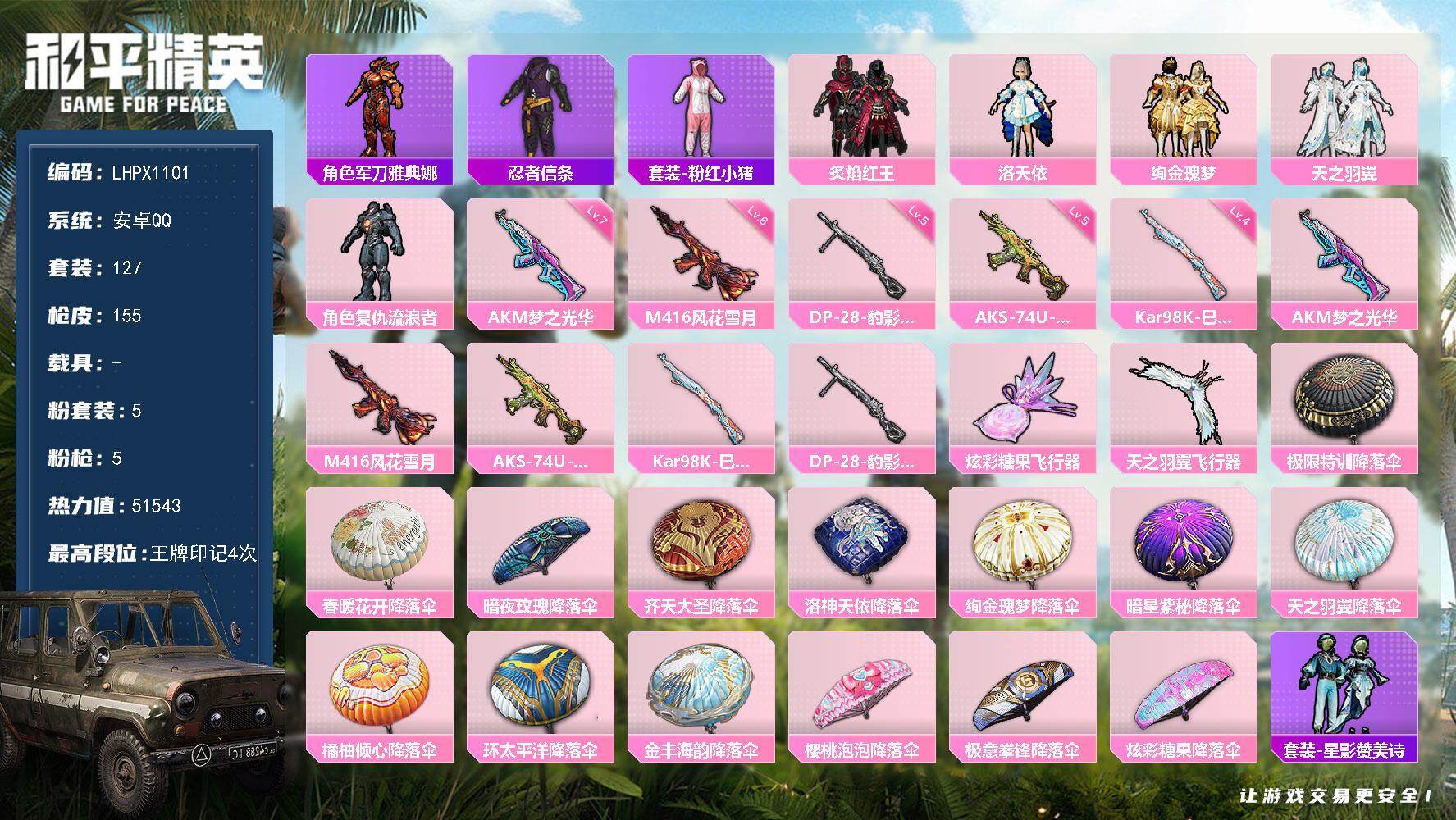[16892756]【特价出售/店主推荐】安卓 手Q-5粉装-5特效枪-0载具-2粉色飞行器-51543热力值-4王牌印记-127套装-155枪皮 【热门品类】:角色-军刀雅典娜,套装-忍者信条,套装-粉红小猪 【粉色套装】:粉装-炙焰红王,角色-洛天依,粉装-绚金瑰梦,粉装-天之羽翼,角色-复仇流浪者 【粉色枪皮等级】:AKM-梦之光华(七级),M416-风花雪月(六级),AKS-74U-森灵之息(五级),Kar98K-巳巳如意(四级),DP-28-豹影疾电(五级) 【粉色枪皮】:AKM-梦之光华,M416-风花雪月,AKS-74U-森灵之息,Kar98K-巳巳如意,DP-28-豹影疾电 【粉色飞行器】:炫彩糖果飞行器,天之羽翼飞行器 【粉色降落伞】:极限特训降落伞,春暖花开降落伞,暗夜玫瑰降落伞,齐天大圣降落伞,洛神天依降落伞,绚金瑰梦降落伞,暗星紫秘降落伞,天之羽翼降落伞,橘柚倾心降落伞,环太平洋降落伞,金丰海韵降落伞,樱桃泡泡降落伞,极意拳锋降落伞,炫彩糖果降落伞 【稀有套装】:套装-雪国风尚,套装-炫彩糖果,套装-星影赞美诗,套装-书海巡游,套装-画境星梦,套装-琴音绮想,套装-红釉青花 【稀有枪皮】:AUG-冰晶雪宝,AKM-彩虹符号,AKM-环太平洋,AKM-虎虎生威,AKM-霓虹街区,M16A4-甜心亚梦,M16A4-生命誓言,M16A4-红色方程式,M16A4-蓝色火焰,SCAR-L-炫彩节奏,SCAR-L-玉兔迎春,SCAR-L-红色方程式,SCAR-L-龙宫之主,M416-夜灯,M416-绯红前夜,M416-蓝色火焰,GROZA-异彩先驱,GROZA-生命誓言,GROZA-荧海星豚,AUG-天降萌叽,AUG-耀粉歌者,QBZ-彩虹符号,QBZ-潮汐统领,QBZ-绚金瑰梦,M762-牛气冲天,M762-瑞龙福将,Mk47-天之羽翼,G36C-暗夜玫瑰,AC-VAL-甜心亚梦,蜜獾-娇憨猪猪,ACE32-画境星梦,UZI-众神之王,UZI-娇憨猪猪,UZI-炫彩节奏,UZI-生命誓言,UMP45-夜灯,UMP45-生命誓言,UMP45-蓝色火焰,Vector-暗夜玫瑰,Vector-生命誓言,汤姆逊-天降萌叽,汤姆逊-异彩先驱,汤姆逊-环太平洋,汤姆逊-银刃赛罗,MP5K-众神之王,MP5K-异彩先驱,MP5K-画境星梦,Kar98K-深海曼妙,Kar98K-红色方