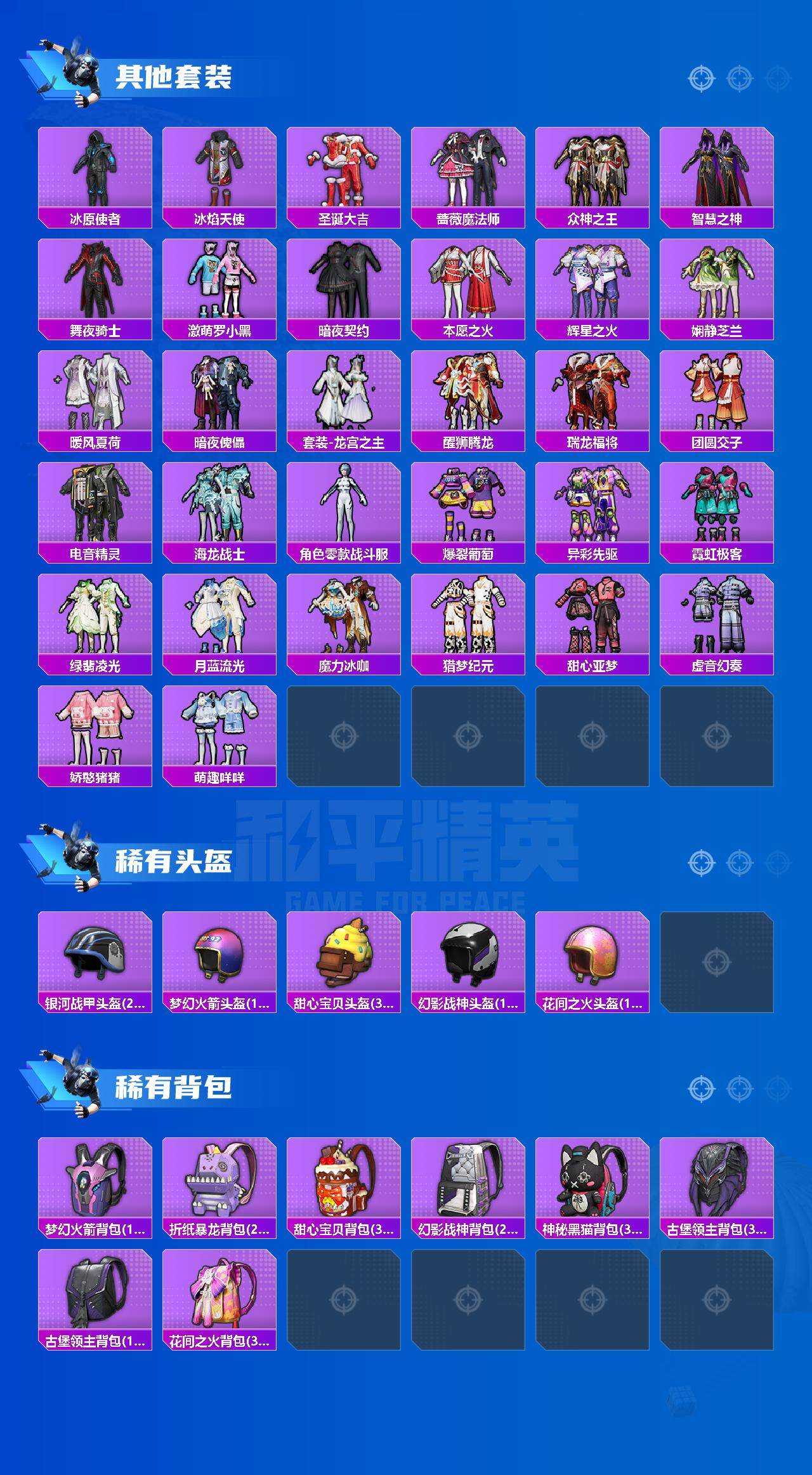 【稀有枪皮】:AUG-冰晶雪宝,AKM-彩虹符号,AKM-环太平洋,AKM-虎虎生威,AKM-霓虹街区,M16A4-甜心亚梦,M16A4-生命誓言,M16A4-红色方程式,M16A4-蓝色火焰,SCAR-L-炫彩节奏,SCAR-L-玉兔迎春,SCAR-L-红色方程式,SCAR-L-龙宫之主,M416-夜灯,M416-绯红前夜,M416-蓝色火焰,GROZA-异彩先驱,GROZA-生命誓言,GROZA-荧海星豚,AUG-天降萌叽,AUG-耀粉歌者,QBZ-彩虹符号,QBZ-潮汐统领,QBZ-绚金瑰梦,M762-牛气冲天,M762-瑞龙福将,Mk47-天之羽翼,G36C-暗夜玫瑰,AC-VAL-甜心亚梦,蜜獾-娇憨猪猪,ACE32-画境星梦,UZI-众神之王,UZI-娇憨猪猪,UZI-炫彩节奏,UZI-生命誓言,UMP45-夜灯,UMP45-生命誓言,UMP45-蓝色火焰,Vector-暗夜玫瑰,Vector-生命誓言,汤姆逊-天降萌叽,汤姆逊-异彩先驱,汤姆逊-环太平洋,汤姆逊-银刃赛罗,MP5K-众神之王,MP5K-异彩先驱,MP5K-画境星梦,Kar98K-深海曼妙,Kar98K-红色方
