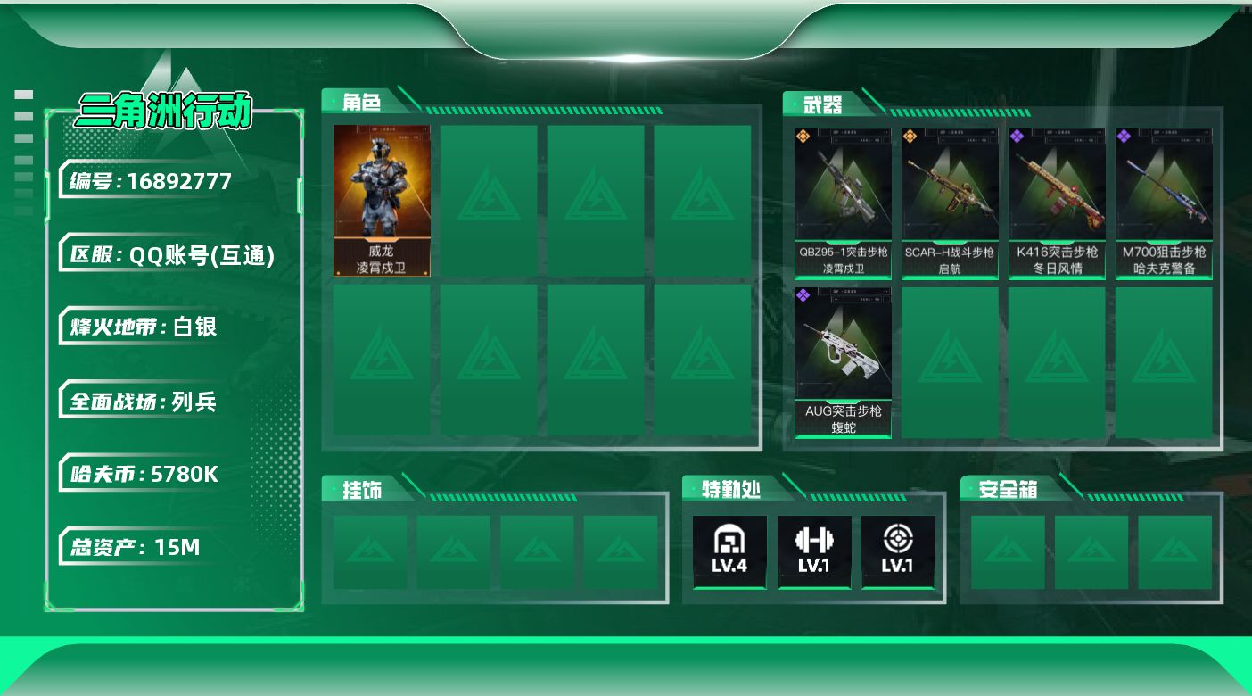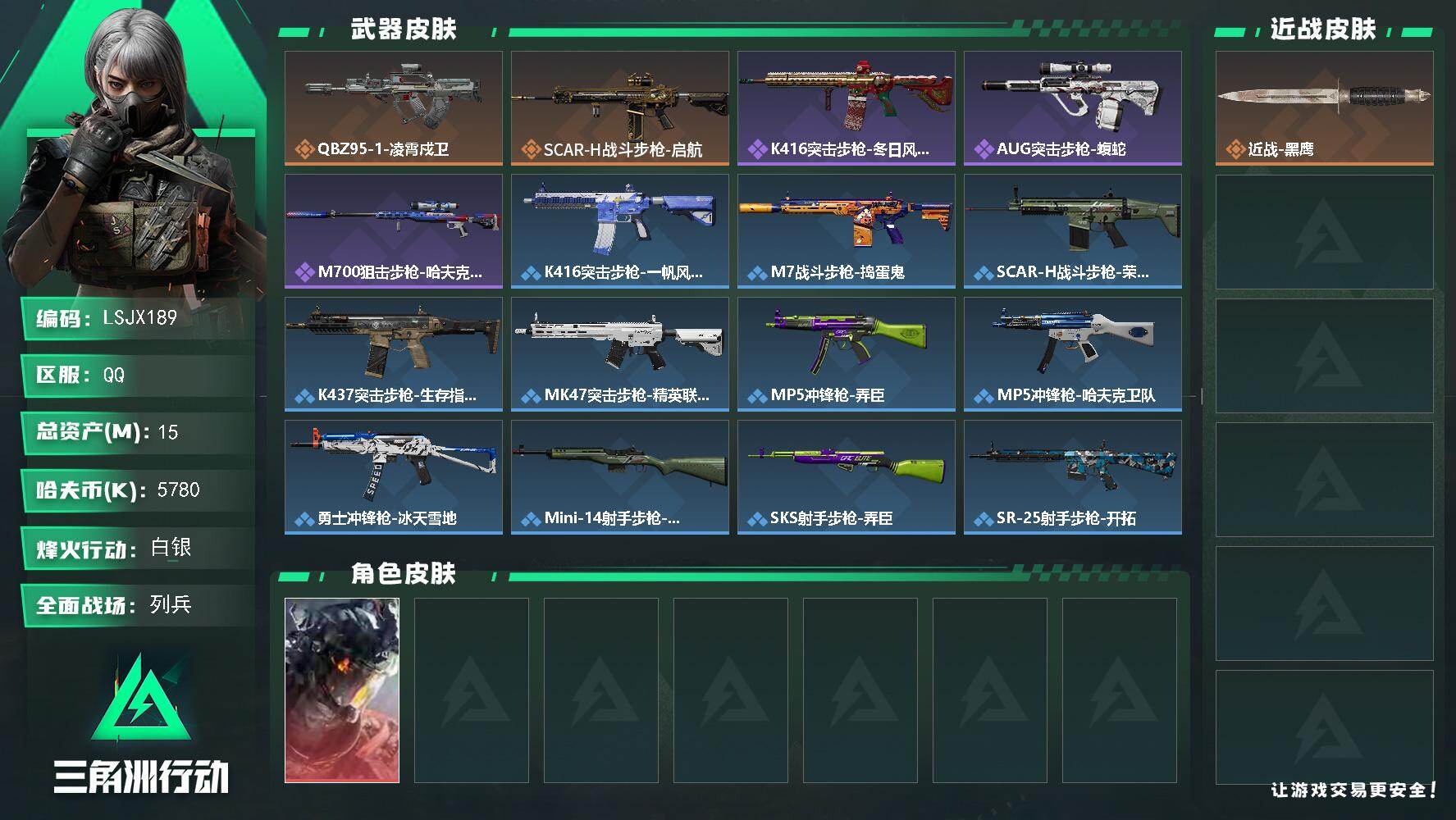 [16892777]【特价出售/店主推荐】15m总资产-5780k哈伏币-23烽火等级-白银-14战场等级-列兵 【干员外观】:威龙-凌霄戍卫 【近战皮肤】:近战-黑鹰 【传说外观】:QBZ95-1突击步枪-凌霄戍卫,SCAR-H战斗步枪-启航 【史诗外观】:K416突击步枪-冬日风情,AUG突击步枪-蝮蛇,M700狙击步枪-哈夫克警备 【稀有外观】:K416突击步枪-一帆风顺,M7战斗步枪-捣蛋鬼,SCAR-H战斗步枪-荣耀列队,K437突击步枪-生存指令,MK47突击步枪-精英联盟,MP5冲锋枪-弄臣,MP5冲锋枪-哈夫克卫队,勇士冲锋枪-冰天雪地,Mini-14射手步枪-荣耀列队,SKS射手步枪-弄臣,SR-25射手步枪-开拓 【普通外观】:M4A1突击步枪-粉色涂装,M4A1突击步枪-高雅黑,QBZ95-1突击步枪-海色,QBZ95-1突击步枪-2026,K416突击步枪-几何迷彩,K416突击步枪-高雅黑,M16A4突击步枪-高雅黑,M7战斗步枪-红色涂装,SCAR-H战斗步枪-数码迷彩,G3战斗步枪-高雅黑,PTR-32突击步枪-黄蜂,Vector冲锋枪-几何迷彩,UZI冲锋枪-海色,M1014霰弹枪-海浪,M249轻机枪-黄蜂,M250通用机枪-雪松,SR-25射手步枪-黄蜂,SV-98狙击步枪-红色涂装,沙漠之鹰-海浪,G17-2026 【载具外观】:轮式突击炮-荣耀 【挂饰】:挂饰-赤霄游龙,挂饰-维什戴尔,挂饰-诡影狙击兵,挂饰-崩岩重炮*5,挂饰-暗行哨兵*8,挂饰-启程,挂饰-关山难越,挂饰-紧急撤离*5