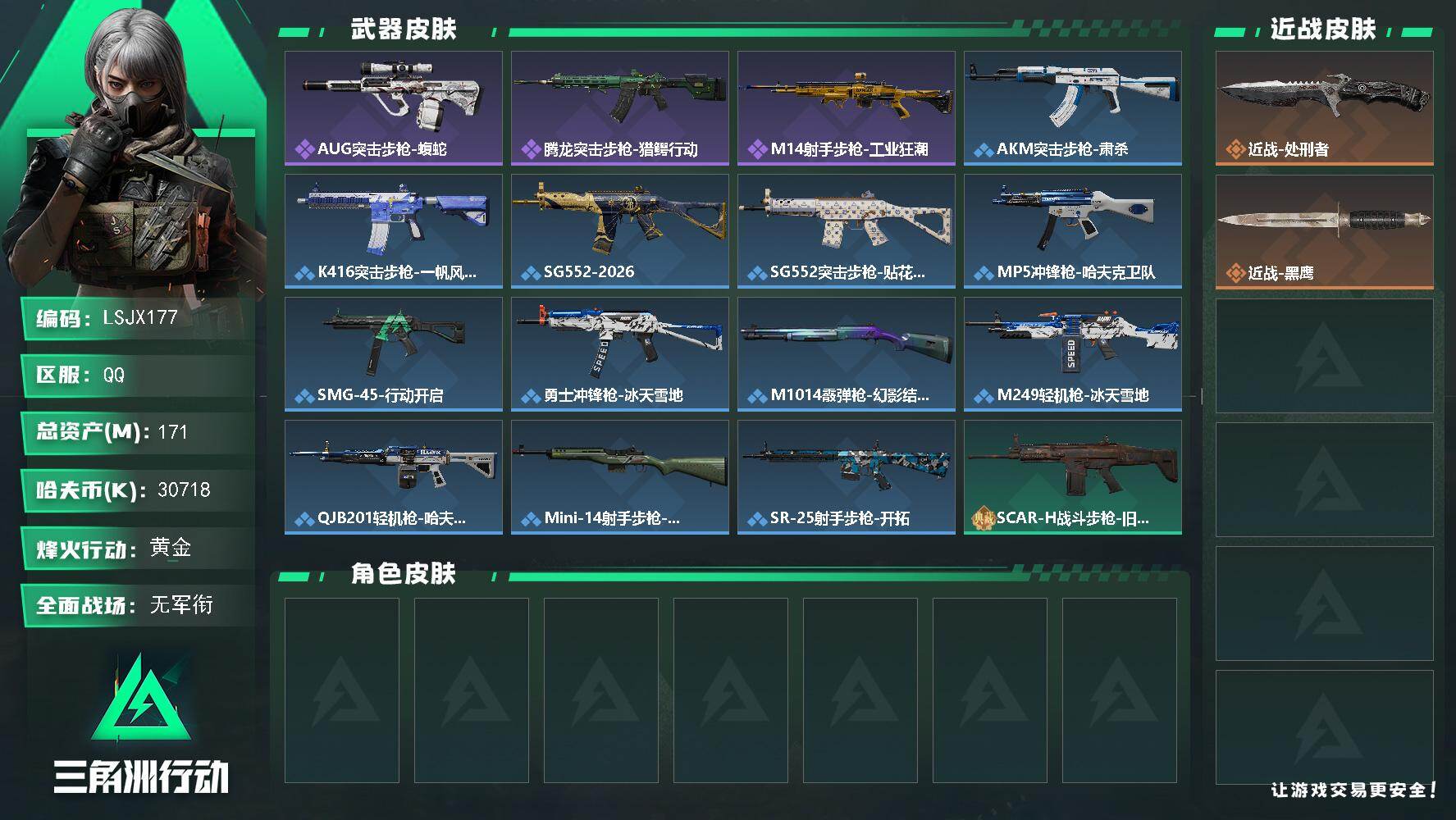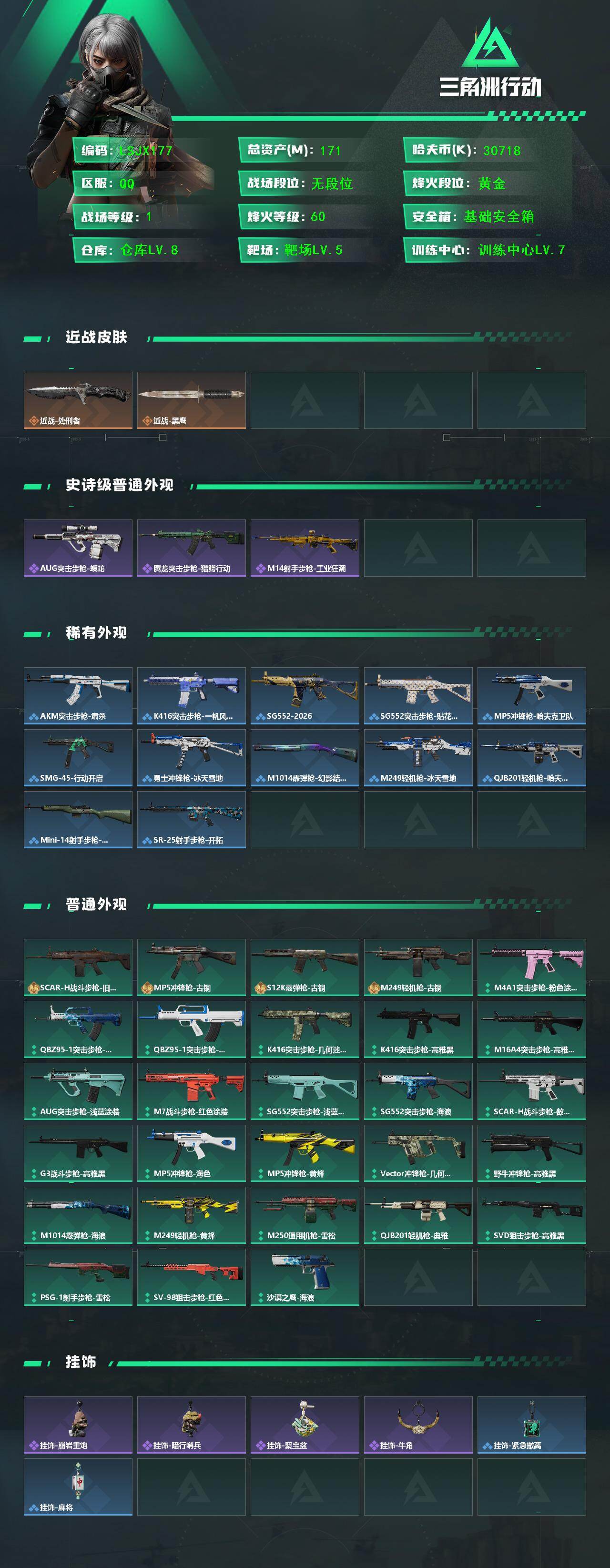 [16892791]【特价出售/店主推荐】171m总资产-30718k哈伏币-60烽火等级-黄金-1战场等级-无军衔 【近战皮肤】:近战-处刑者,近战-黑鹰 【史诗外观】:AUG突击步枪-蝮蛇,腾龙突击步枪-猎鳄行动,M14射手步枪-工业狂潮 【稀有外观】:AKM突击步枪-肃杀,K416突击步枪-一帆风顺,SG552突击步枪-2026,SG552突击步枪-贴花艺术,MP5冲锋枪-哈夫克卫队,SMG-45-行动开启,勇士冲锋枪-冰天雪地,M1014霰弹枪-幻影结构,M249轻机枪-冰天雪地,QJB201轻机枪-哈夫克卫队,Mini-14射手步枪-荣耀列队,SR-25射手步枪-开拓 【普通外观】:SCAR-H战斗步枪-旧工业*2,MP5冲锋枪-古铜,S12K霰弹枪-古铜,M249轻机枪-古铜,M4A1突击步枪-粉色涂装,QBZ95-1突击步枪-海浪,QBZ95-1突击步枪-海色,QBZ95-1突击步枪-2026,K416突击步枪-几何迷彩,K416突击步枪-高雅黑,M16A4突击步枪-高雅黑,AUG突击步枪-浅蓝涂装,M7战斗步枪-红色涂装,SG552突击步枪-浅蓝涂装,SG552突击步枪-海浪,SCAR-H战斗步枪-数码迷彩,G3战斗步枪-高雅黑,MP5冲锋枪-海色,MP5冲锋枪-黄蜂,Vector冲锋枪-几何迷彩,野牛冲锋枪-高雅黑,M1014霰弹枪-海浪,M249轻机枪-黄蜂,M250通用机枪-雪松,QJB201轻机枪-典雅,SVD狙击步枪-高雅黑,PSG-1射手步枪-雪松,SV-98狙击步枪-红色涂装,沙漠之鹰-海浪,G17-2026 【挂饰】:挂饰-崩岩重炮*5,挂饰-暗行哨兵*2,挂饰-聚宝盆*2,挂饰-牛角,挂饰-紧急撤离*23,挂饰-麻将*8