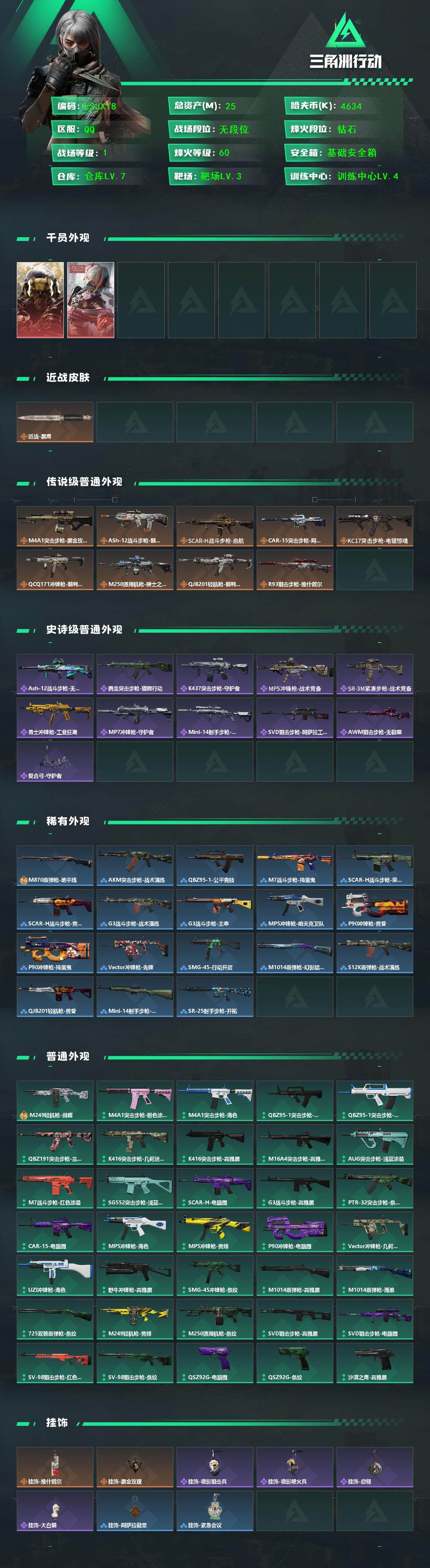 [16892822]【特价出售/店主推荐】25m总资产-4634k哈伏币-60烽火等级-钻石-1战场等级-无军衔 【干员外观】:红狼-蚀金玫瑰,骇爪-维什戴尔 【近战皮肤】:近战-黑鹰 【传说外观】:M4A1突击步枪-蚀金玫瑰,ASh-12战斗步枪-鹅鸭杀,SCAR-H战斗步枪-启航,CAR-15突击步枪-阿米娅,KC17突击步枪-电锯惊魂,QCQ171冲锋枪-鹅鸭杀,M250通用机枪-骑士之心,QJB201轻机枪-鹅鸭杀,R93狙击步枪-维什戴尔 【史诗外观】:ASh-12战斗步枪-无极限,腾龙突击步枪-猎鳄行动,K437突击步枪-守护者,MP5冲锋枪-战术竞备,SR-3M紧凑突击步枪-战术竞备,勇士冲锋枪-工业狂潮,MP7冲锋枪-守护者,Mini-14射手步枪-守护者,SVD狙击步枪-阿萨拉工艺,AWM狙击步枪-无极限,复合弓-守护者 【稀有外观】:M870霰弹枪-地平线,AKM突击步枪-战术演练,QBZ95-1突击步枪-公平竞技,M7战斗步枪-捣蛋鬼,SCAR-H战斗步枪-荣耀列队,SCAR-H战斗步枪-黄昏,G3战斗步枪-战术演练,G3战斗步枪-主宰,MP5冲锋枪-哈夫克卫队,P90冲锋枪-黄昏,P90冲锋枪-捣蛋鬼,Vector冲锋枪-先锋,SMG-45-行动开启,M1014霰弹枪-幻影结构,S12K霰弹枪-战术演练,QJB201轻机枪-黄昏,Mini-14射手步枪-荣耀列队,SR-25射手步枪-开拓 【普通外观】:M249轻机枪-蝴蝶,M4A1突击步枪-粉色涂装,M4A1突击步枪-海色,QBZ95-1突击步枪-高雅黑,QBZ95-1突击步枪-海色,QBZ191突击步枪-三角洲力量,K416突击步枪-几何迷彩,K416突击步枪-高雅黑,M16A4突击步枪-高雅黑,AUG突击步枪-浅蓝涂装,M7战斗步枪-红色涂装,SG552突击步枪-浅蓝涂装,SCAR-H战斗步枪-电路图,G3战斗步枪-高雅黑,PTR-32突击步枪-条纹,CAR-15突击步枪-电路图,MP5冲锋枪-海色,MP5冲锋枪-黄蜂,P90冲锋枪-电路图,Vector冲锋枪-几何迷彩,UZI冲锋枪-海色,野牛冲锋枪-高雅黑,SMG-45冲锋枪-条纹,M1014霰弹枪-高雅黑,M1014霰弹枪-海浪,725双管霰弹枪-条纹,M249轻机枪-黄蜂,M250通用机枪-条纹,SVD狙击步枪-高雅黑,SVD狙击步枪-电路图,SV