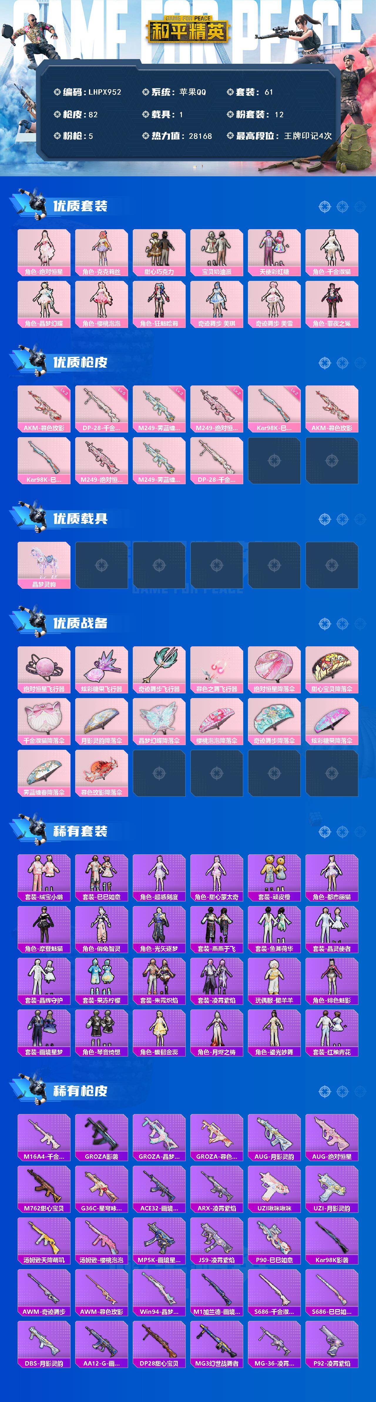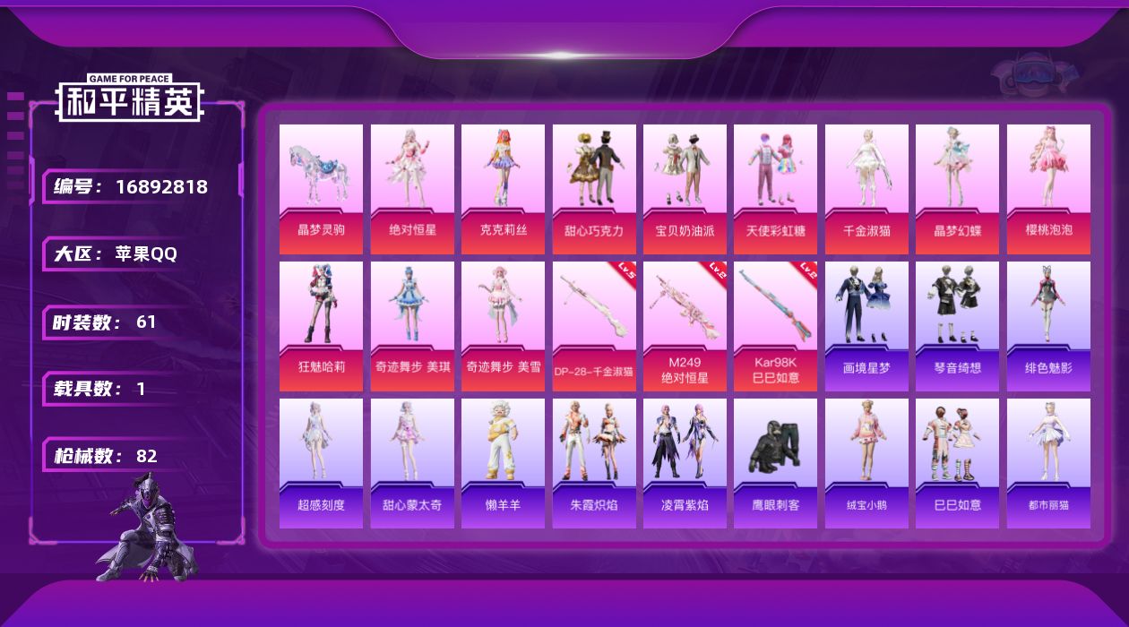 [16892818]【特价出售/店主推荐】苹果 手Q-12粉装-5特效枪-1载具-4粉色飞行器-28168热力值-4王牌印记-61套装-82枪皮
