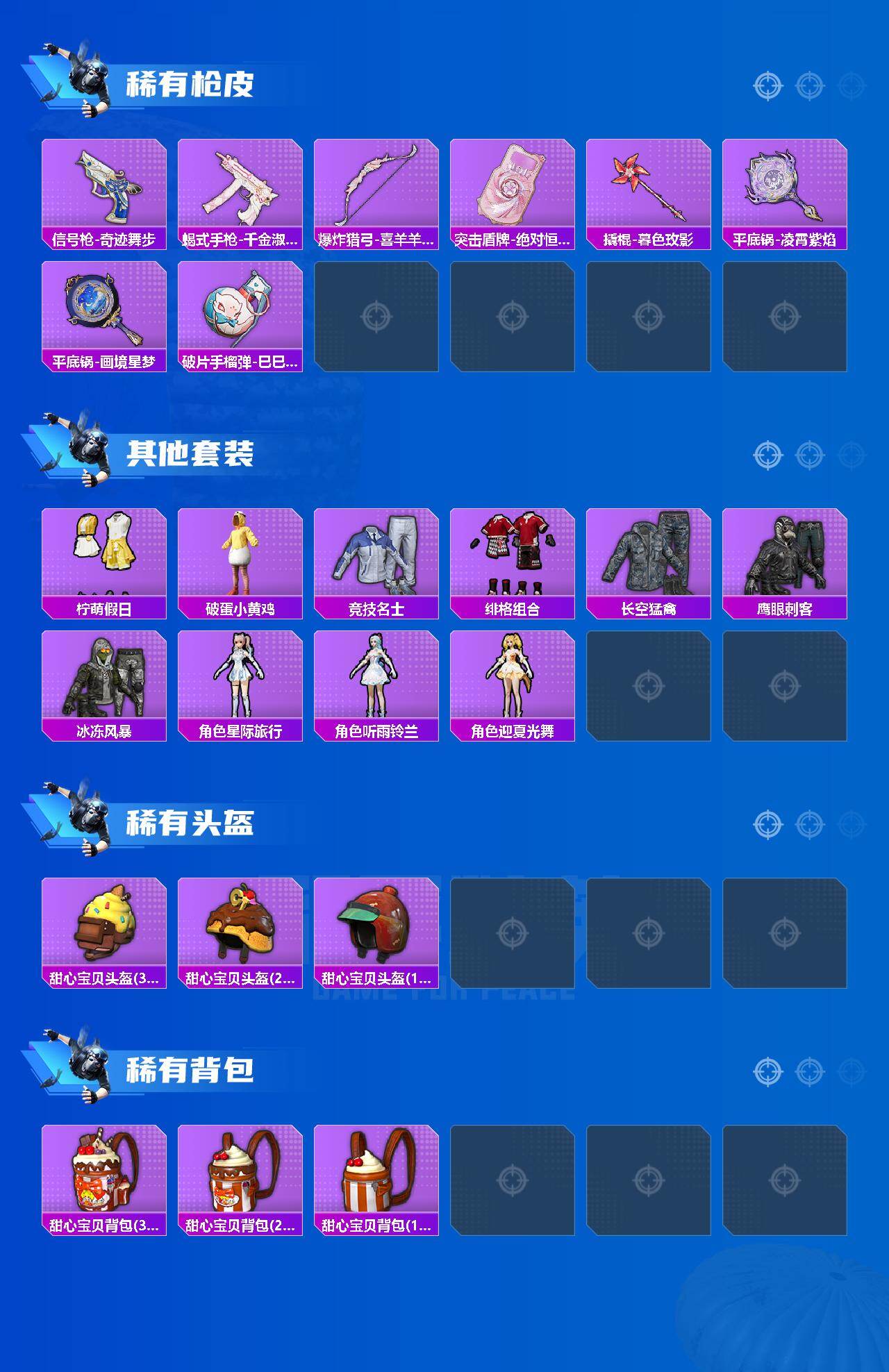 【稀有枪皮】:M16A4-千金淑猫,GROZA-影袭,GROZA-暮色玫影,GROZA-晶梦幻蝶,AUG-月影灵韵,AUG-绝对恒星,M762-甜心宝贝,G36C-星穹咏叹调,ACE32-画境星梦,ARX-凌霄紫焰,UZI-啾咪啾咪,UZI-月影灵韵,汤姆逊-天降萌叽,汤姆逊-樱桃泡泡,MP5K-画境星梦,JS9-凌霄紫焰,P90-巳巳如意,Kar98K-影袭,AWM-奇迹舞步,AWM-暮色玫影,Win94-晶梦幻蝶,M1加兰德-画境星梦,S686-巳巳如意,S686-千金淑猫,DBS-月影灵韵,AA12-G-画境星梦,DP-28-甜心宝贝,MG3-幻世战舞者,MG-36-凌霄紫焰,P92-凌霄紫焰,信号枪-奇迹舞步,蝎式手枪-千金淑猫,爆炸猎弓-喜羊羊与灰太狼,突击盾牌-绝对恒星