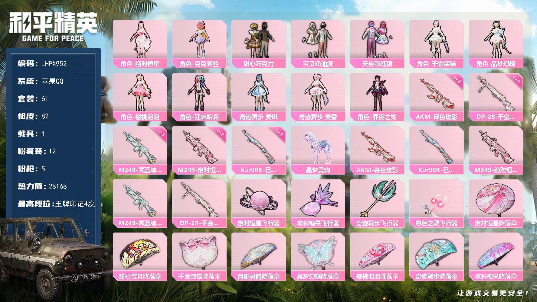 [16892818]【特价出售/店主推荐】苹果 手Q-12粉装-5特效枪-1载具-4粉色飞行器-28168热力值-4王牌印记-61套装-82枪皮 【粉色套装】:角色-绝对恒星,角色-克克莉丝,粉装-甜心巧克力,粉装-宝贝奶油派,粉装-天使彩虹糖,角色-千金淑猫,角色-晶梦幻蝶,角色-樱桃泡泡,角色-狂魅哈莉,角色-奇迹舞步 美琪,角色-奇迹舞步 美雪,角色-罪夜之冕 【粉色枪皮等级】:AKM-暮色玫影(三级),Kar98K-巳巳如意(二级),M249-绝对恒星(二级),M249-霁蓝缠春(三级),DP-28-千金淑猫(五级) 【粉色载具】:晶梦灵驹 【粉色枪皮】:AKM-暮色玫影,Kar98K-巳巳如意,M249-绝对恒星,M249-霁蓝缠春,DP-28-千金淑猫 【粉色飞行器】:绝对恒星飞行器,炫彩糖果飞行器,奇迹舞步飞行器,暮色之舞飞行器 【粉色降落伞】:绝对恒星降落伞,甜心宝贝降落伞,千金淑猫降落伞,月影灵韵降落伞,晶梦幻蝶降落伞,樱桃泡泡降落伞,奇迹舞步降落伞,炫彩糖果降落伞,霁蓝缠春降落伞,暮色玫影降落伞 【稀有套装】:套装-绒宝小鹅,套装-巳巳如意,角色-超感刻度,角色-甜心蒙太奇,套装-顽皮橙,角色-都市丽猫,角色-摩登魅猫,角色-俏兔智灵,角色-光矢逐梦,套装-燕燕于飞,套装-鱼渊荷华,套装-晶灵使者,套装-晶辉守护,套装-果冻柠檬,套装-朱霞炽焰,套装-凌霄紫焰,玩偶服-懒羊羊,角色-绯色魅影,套装-画境星梦,套装-琴音绮想,角色-馥郁金蕊,角色-月烬之祷,角色-鎏光妙舞,套装-红釉青花 【稀有枪皮】:M16A4-千金淑猫,GROZA-影袭,GROZA-暮色玫影,GROZA-晶梦幻蝶,AUG-月影灵韵,AUG-绝对恒星,M762-甜心宝贝,G36C-星穹咏叹调,ACE32-画境星梦,ARX-凌霄紫焰,UZI-啾咪啾咪,UZI-月影灵韵,汤姆逊-天降萌叽,汤姆逊-樱桃泡泡,MP5K-画境星梦,JS9-凌霄紫焰,P90-巳巳如意,Kar98K-影袭,AWM-奇迹舞步,AWM-暮色玫影,Win94-晶梦幻蝶,M1加兰德-画境星梦,S686-巳巳如意,S686-千金淑猫,DBS-月影灵韵,AA12-G-画境星梦,DP-28-甜心宝贝,MG3-幻世战舞者,MG-36-凌霄紫焰,P92-凌霄紫焰,信号枪-奇迹舞步,蝎式手枪-千金淑猫,爆炸猎弓-喜羊羊与灰太狼,突击盾牌-绝对恒星