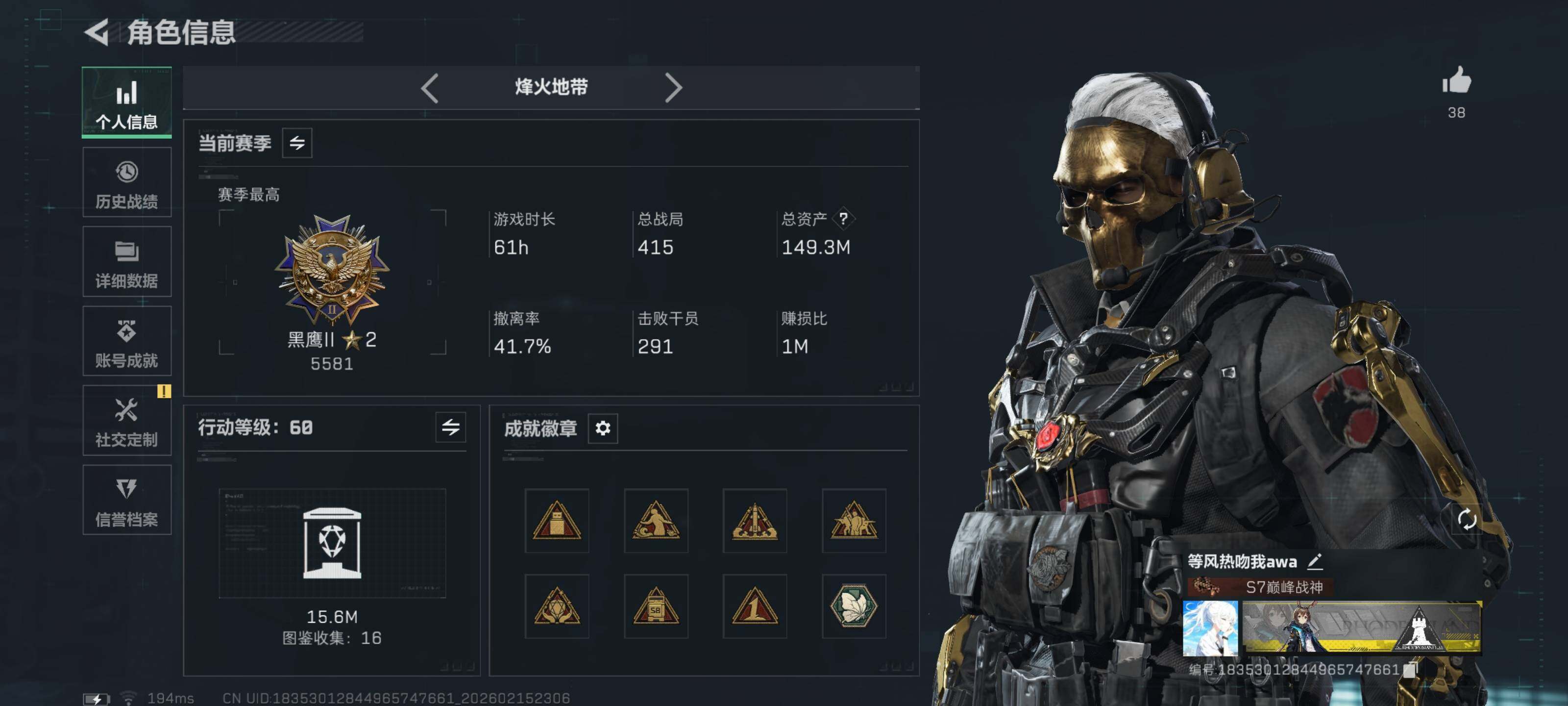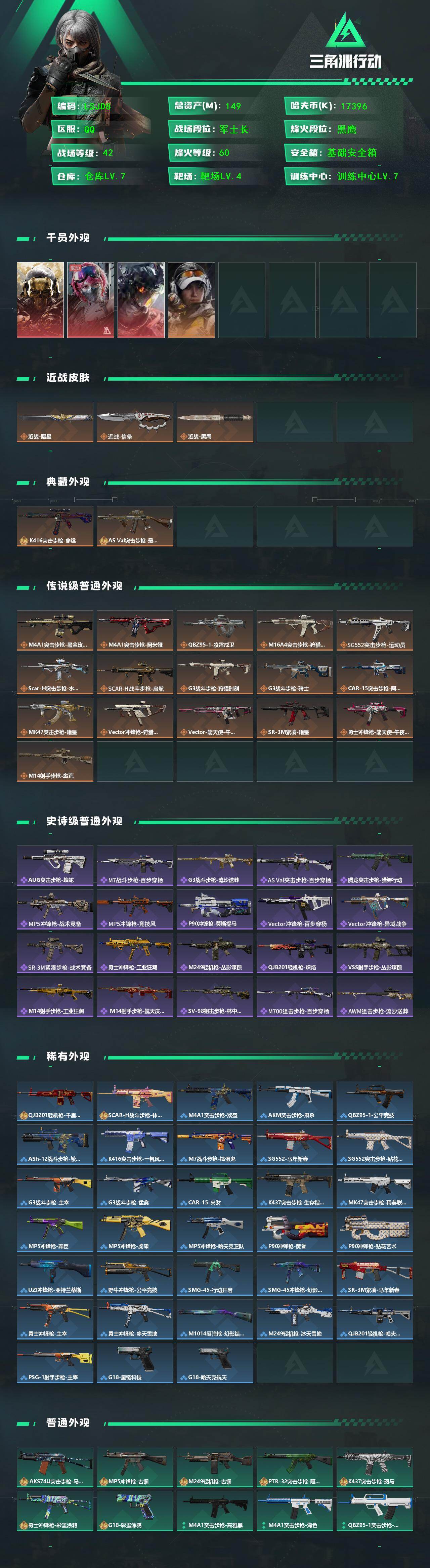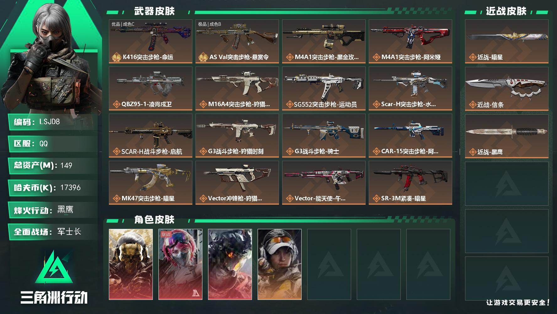 - [15228266]【特价出售/店主推荐】128m总资产-57338k哈伏币-60烽火等级-钻石-50战场等级-将军 【干员外观】:骇爪-维什戴尔,红狼-电锯惊魂 【近战皮肤】:近战-黑鹰 【传说外观】:M4A1突击步枪-阿米娅,ASh-12战斗步枪-鹅鸭杀,SCAR-H战斗步枪-启航,G3战斗步枪-骑士,CAR-15突击步枪-阿米娅,KC17突击步枪-电锯惊魂,QCQ171冲锋枪-鹅鸭杀,QJB201轻机枪-鹅鸭杀,R93狙击步枪-维什戴尔 【史诗外观】:AUG突击步枪-蝮蛇,SG552突击步枪-深海恐惧,PTR-32突击步枪-工业狂潮,腾龙突击步枪-猎鳄行动,MP5冲锋枪-战术竞备,MP5冲锋枪-竞技风,勇士冲锋枪-工业狂潮,SV-98狙击步枪-猎鳄行动,M700狙击步枪-哈夫克警备 【稀有外观】:AKM突击步枪-肃杀,QBZ95-1突击步枪-公平竞技,AKS-74U突击步枪-精英联盟,K416突击步枪-碳纤维,AUG突击步枪-全金属外壳,M7战斗步枪-精英联盟,M7战斗步枪-捣蛋鬼,AK-12突击步枪-零点,SCAR-H战斗步枪-荣耀列队,CAR-15突击步枪-精英联盟,AS Val突击步枪-哈夫克科技,腾龙突击步枪-冰天雪地,MP5冲锋枪-弄臣,MP5冲锋枪-哈夫克卫队,P90冲锋枪-医疗协议,P90冲锋枪-黄昏,P90冲锋枪-捣蛋鬼,Vector冲锋枪-先锋,UZI冲锋枪-亚特兰蒂斯,野牛冲锋枪-公平竞技,SMG-45-行动开启,SMG-45冲锋枪-幻影结构,SR-3M紧凑突击步枪-精英联盟,勇士冲锋枪-冰天雪地,MP7冲锋枪-精英联盟,M1014霰弹枪-幻影结构,M249轻机枪-毛鲁斯之力,M249轻机枪-战损,QJB201轻机枪-哈夫克卫队,Mini-14射手步枪-荣耀列队,M14射手步枪-出厂配置,SR9射手步枪-肃杀,AWM狙击步枪-精英联盟,G18-星链科技,G18-哈夫克航天 【普通外观】:SKS射手步枪-蝴蝶,PKM通用机枪-旧工业,M4A1突击步枪-高雅黑,M4A1突击步枪-海色,QBZ95-1突击步枪-高雅黑,QBZ95-1突击步枪-海浪,QBZ95-1突击步枪-三角洲力量,QBZ95-1突击步枪-海色,QBZ191突击步枪-三角洲力量,K416突击步枪-高雅黑,M16A4突击步枪-高雅黑,AUG突击步枪-浅蓝涂装,M7战斗步枪-红色涂装,SG552突击步