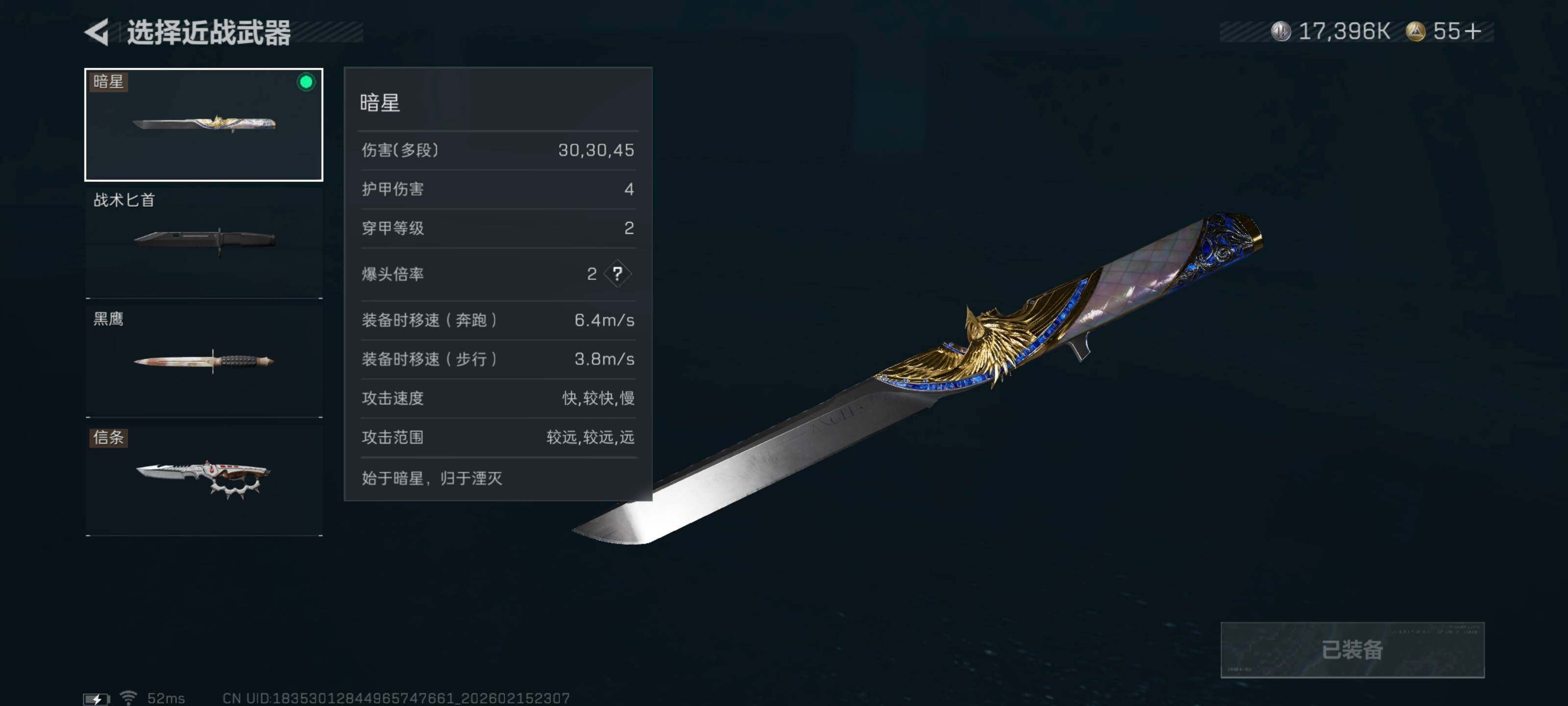 【近战皮肤】:近战-暗星,近战-信条,近战-黑鹰