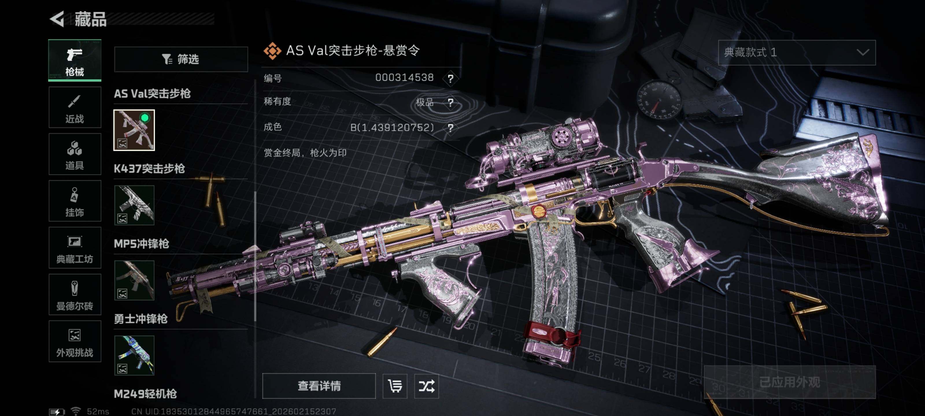 【典藏外观成色】:K416突击步枪-命运(优品C),AS Val突击步枪-悬赏令(极品B)