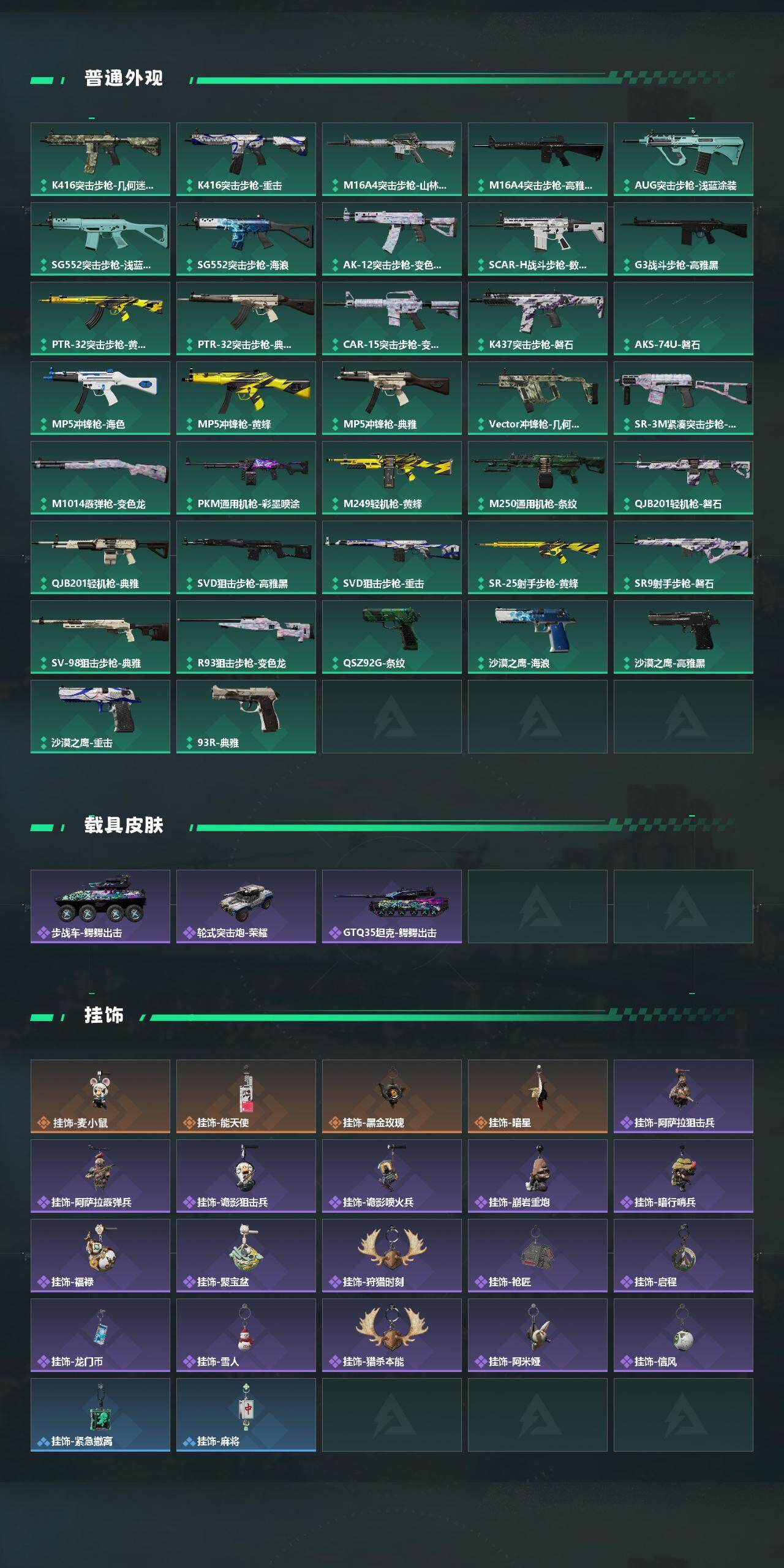 【稀有外观】:QJB201轻机枪-千里骏骨,SCAR-H战斗步枪-休闲时光,M4A1突击步枪-繁盛,AKM突击步枪-肃杀,QBZ95-1突击步枪-公平竞技,ASh-12战斗步枪-繁盛,K416突击步枪-一帆风顺,M7战斗步枪-捣蛋鬼,SG552突击步枪-马年新春,SG552突击步枪-贴花艺术,G3战斗步枪-主宰,G3战斗步枪-猛禽,CAR-15突击步枪-来财,K437突击步枪-生存指令,MK47突击步枪-精英联盟,MP5冲锋枪-弄臣,MP5冲锋枪-虎啸,MP5冲锋枪-哈夫克卫队,P90冲锋枪-黄昏,P90冲锋枪-贴花艺术,UZI冲锋枪-亚特兰蒂斯,野