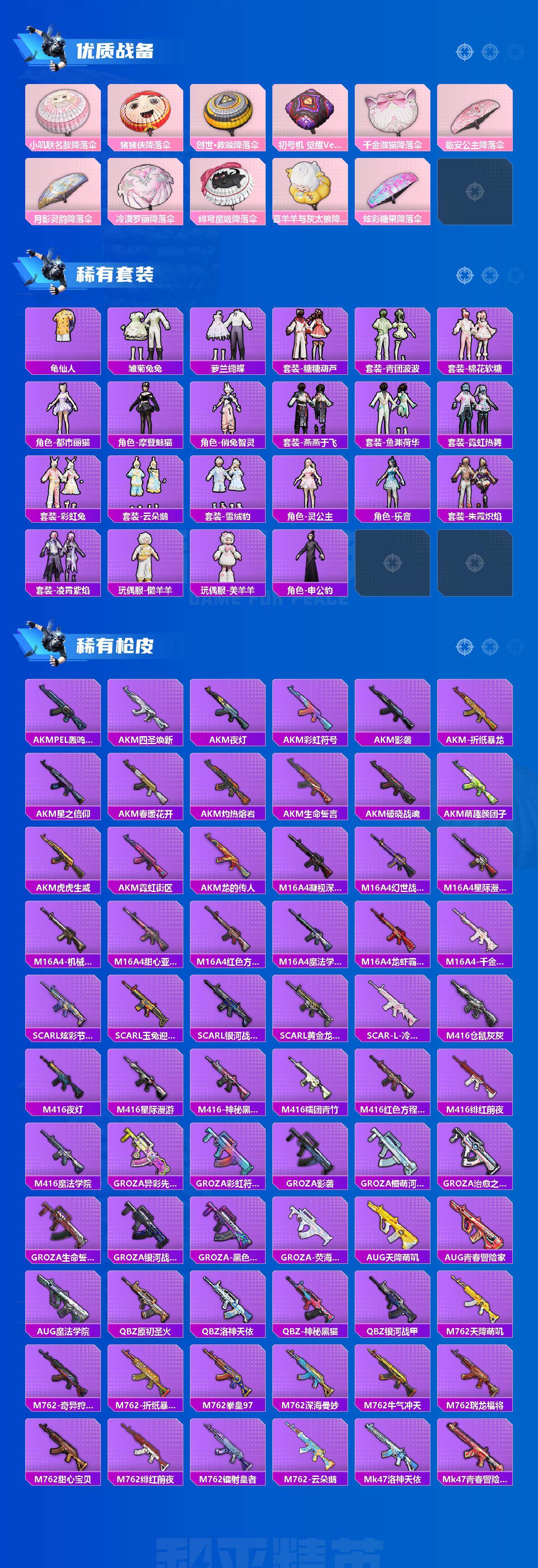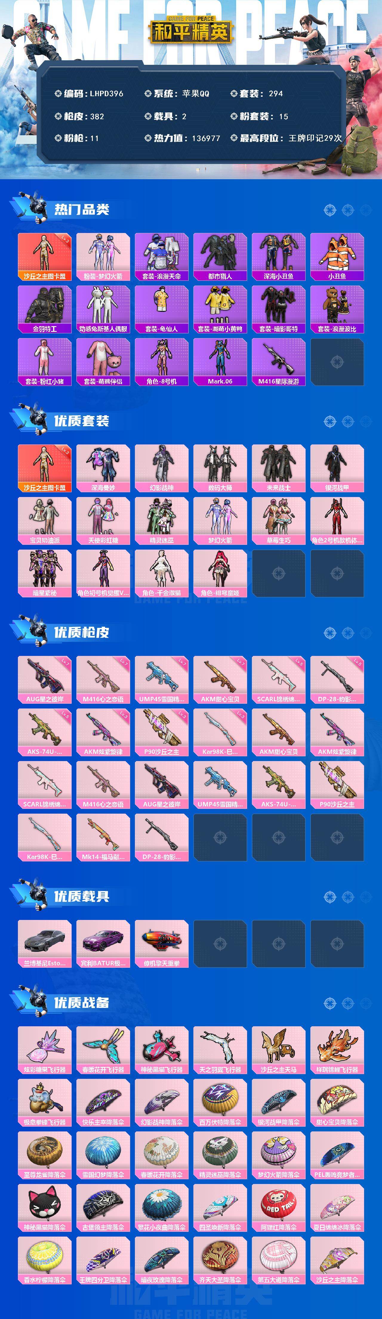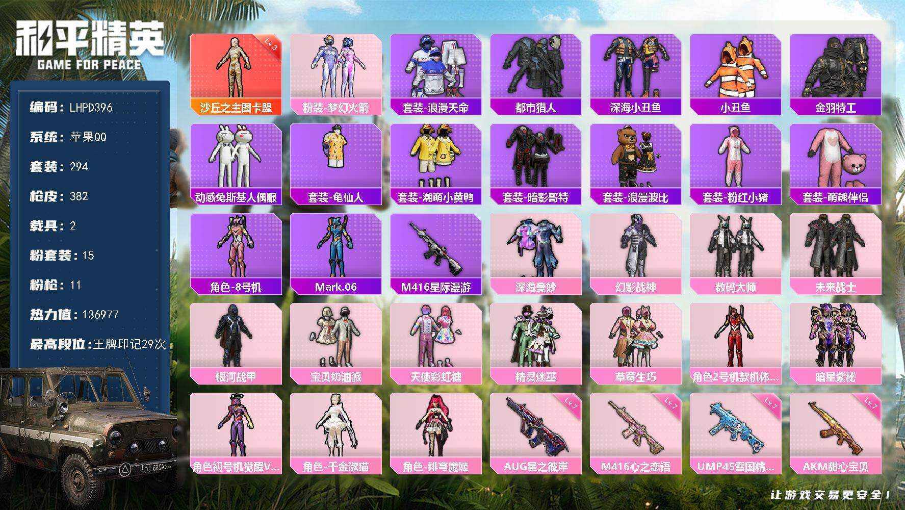 [16892876]【店主推荐捡漏号!可直接换绑】苹果 手Q-1神装-15粉装-11特效枪-2载具-7粉色飞行器-136977热力值-29王牌印记-294套装-382枪皮【红色神装等级】:沙丘之主-图卡盟(三级)【红色角色神装】:沙丘之主-图卡盟【热门品类】:粉装-梦幻火箭,套装-浪漫天命,套装-都市猎人,套装-深海小丑鱼,套装-小丑鱼,套装-金羽特工,套装-动感兔斯基人偶服,套装-龟仙人,套装-潮萌小黄鸭,套装-暗影哥特,套装-浪漫波比,套装-粉红小猪,套装-萌熊伴侣,角色-8号机,角色-Mark.06,M416-星际漫游【粉色套装】:粉装-深海曼妙,粉装-幻影战神,粉装-数码大师,粉装-未来战士,粉装-银河战甲,粉装-宝贝奶油派,粉装-天使彩虹糖,粉装-精灵迷巫,粉装-梦幻火箭,粉装-草莓生巧,角色-2号机款机体服,粉装-暗星紫秘,角色-初号机 觉醒Ver.,角色-千金淑猫,角色-绯穹魔姬【粉色枪皮等级】:AKM-甜心宝贝(七级),AKM-炫紫旋律(三级),SCAR-L-锦绣绵绵(五级),M416-心之恋语(七级),AUG-星之彼岸(七级),UMP45-雪国精灵(七级),AKS-74U-森灵之息(五级),P90-沙丘之主(三级),Kar98K-巳巳如意(三级),DP-28-豹影疾电(五级)【粉色载具】:兰博基尼Estoque(银翼灰),宾利BATUR(极速紫),僚机-擎天重拳【粉色枪皮】:AKM-甜心宝贝,AKM-炫紫旋律,SCAR-L-锦绣绵绵,M416-心之恋语,AUG-星之彼岸,UMP45-雪国精灵,AKS-74U-森灵之息,P90-沙丘之主,Kar98K-巳巳如意,Mk14-福马献瑞,DP-28-豹影疾电【粉色飞行器】:炫彩糖果飞行器,春暖花开飞行器,神秘黑猫飞行器,天之羽翼飞行器,沙丘之主天马,祥瑞锦鲤飞行器,极意拳锋飞行器