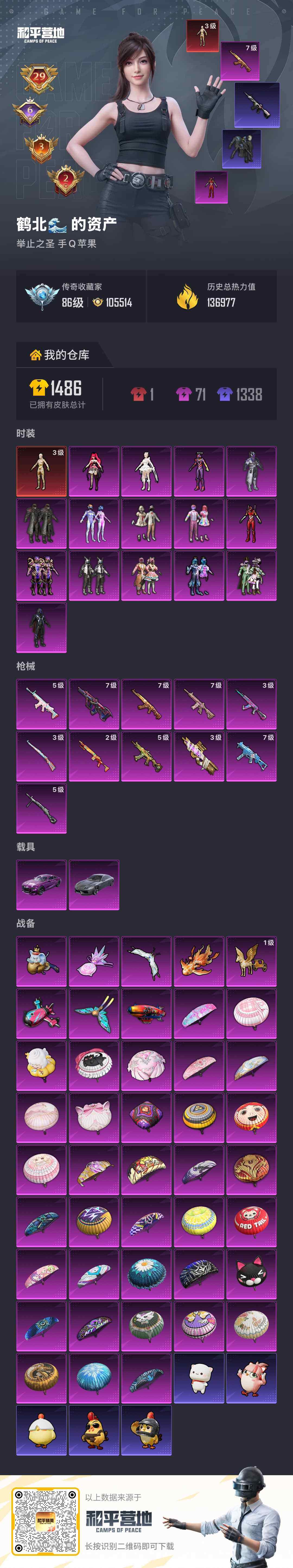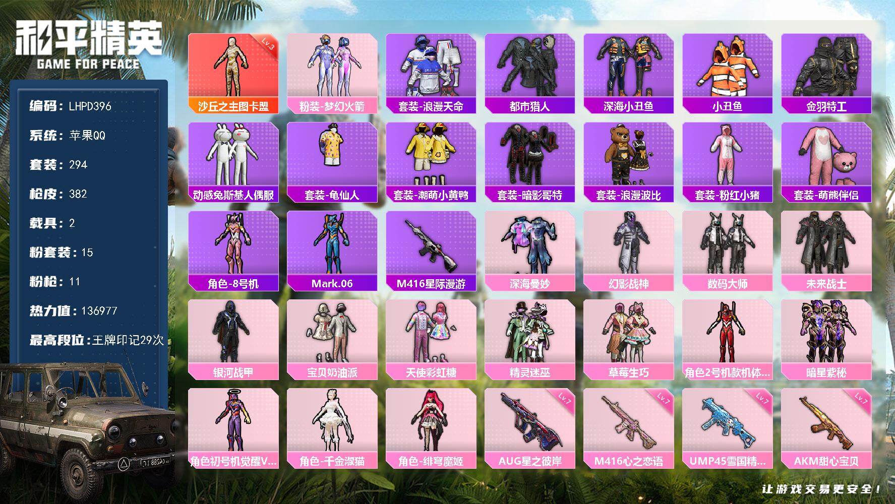 - [15155416]【店主推荐捡漏号!可直接换绑】安卓 手Q-无敌战神框-9粉装-14特效枪-4载具-3粉色飞行器-86790热力值-17王牌印记-177套装-240枪皮【热门品类】:粉装-雪国幻梦,粉装-梦幻火箭,套装-奇异狩猎者,套装-胖达圆圆,套装-浪客战士,套装-粉红小猪【粉色套装】:粉装-雪国幻梦,粉装-梦幻火箭,粉装-天禅智恒,粉装-彗云及圣,粉装-向日葵,粉装-甜蜜誓约,粉装-俏皮狐尾,粉装-暗夜玫瑰,角色-千金淑猫【粉色枪皮等级】:AKM-炫紫旋律(五级),SCAR-L-梦幻火箭(五级),M416-五爪金龙(七级),M416-心之恋语(七级),M416-电玩时刻(四级),GROZA-镜光银凌(五级),M762-甜蜜誓约(五级),M762-激战未来(一级),UMP45-量子极限(五级),Kar98K-伏魔团(四级),Kar98K-巳巳如意(五级),AWM-花间之火(五级),Mk14-甜梦熊击(五级),MG3-洛神天依(五级)【粉色载具】:兰博基尼Estoque(银翼灰),阿斯顿马丁DBX(橙),幽澜尊爵(静谧蓝),合金龙骨(蓝)【粉色枪皮】:AKM-炫紫旋律,SCAR-L-梦幻火箭,M416-五爪金龙,M416-心之恋语,M416-电玩时刻,GROZA-镜光银凌,M762-甜蜜誓约,M762-激战未来,UMP45-量子极限,Kar98K-伏魔团,Kar98K-巳巳如意,AWM-花间之火,Mk14-甜梦熊击,MG3-洛神天依【粉色飞行器】:梦幻火箭飞行器,炫紫旋律飞行器,齐天大圣飞行器