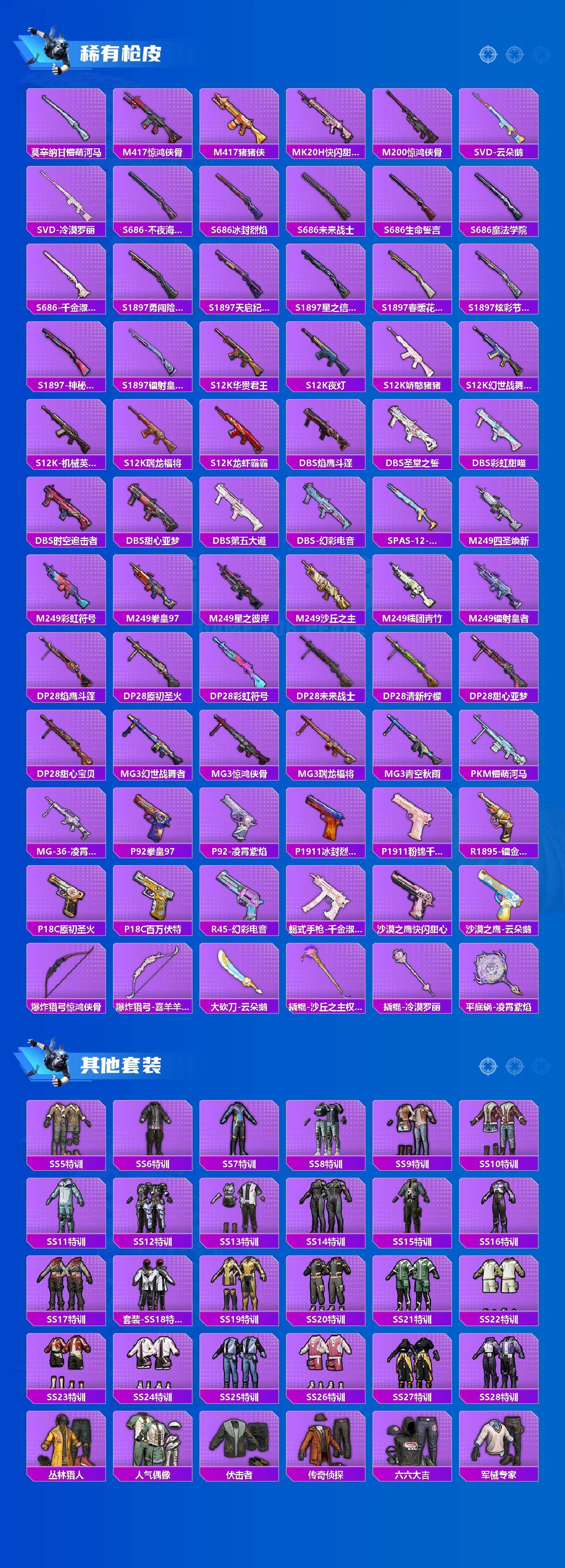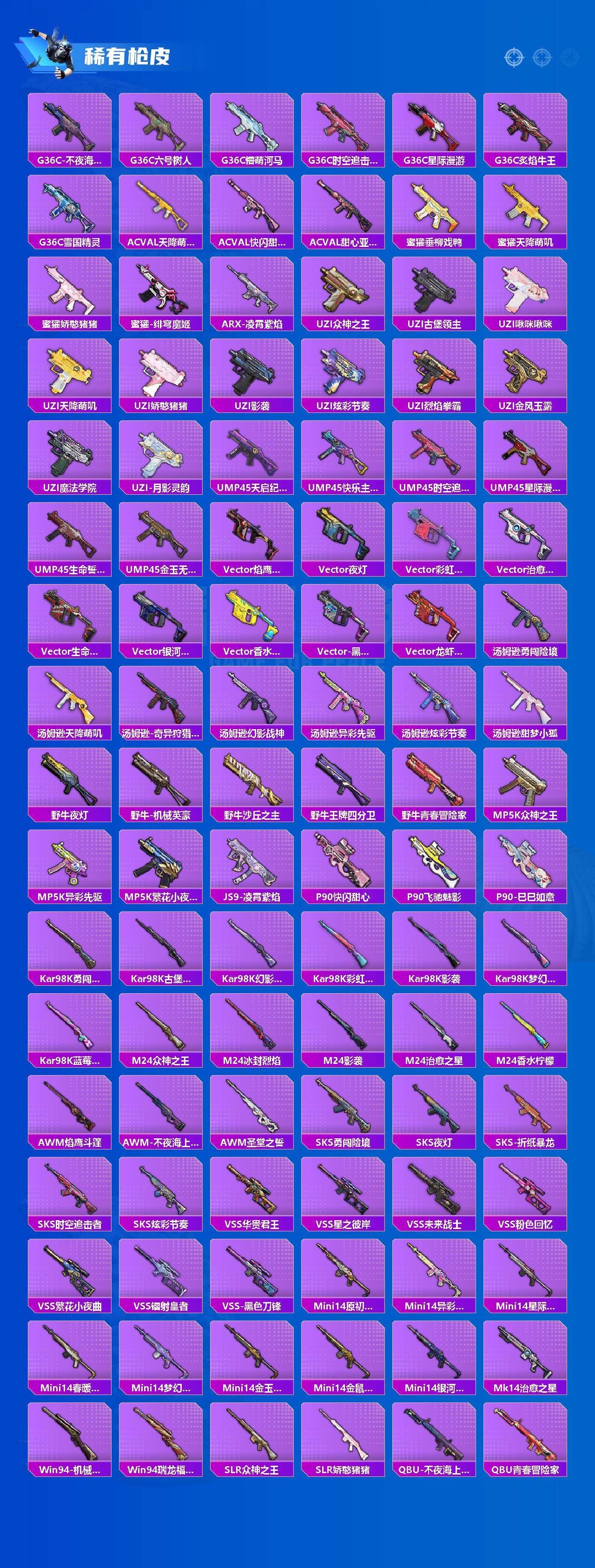 AKM-甜心宝贝,AKM-炫紫旋律,SCAR-L-锦绣绵绵,M416-心之恋语,AUG-星之彼岸,UMP45-雪国精灵,P90-沙丘之主,Kar98K-巳巳如意