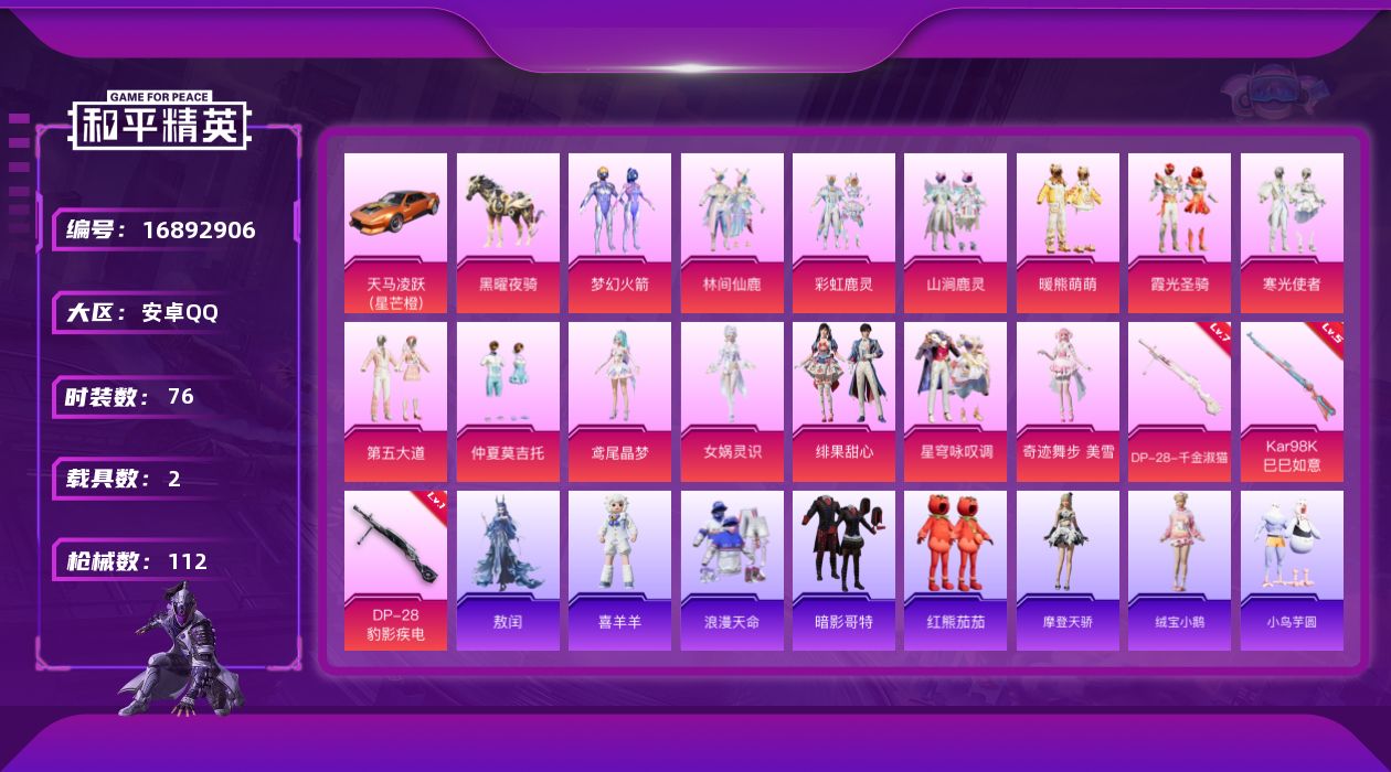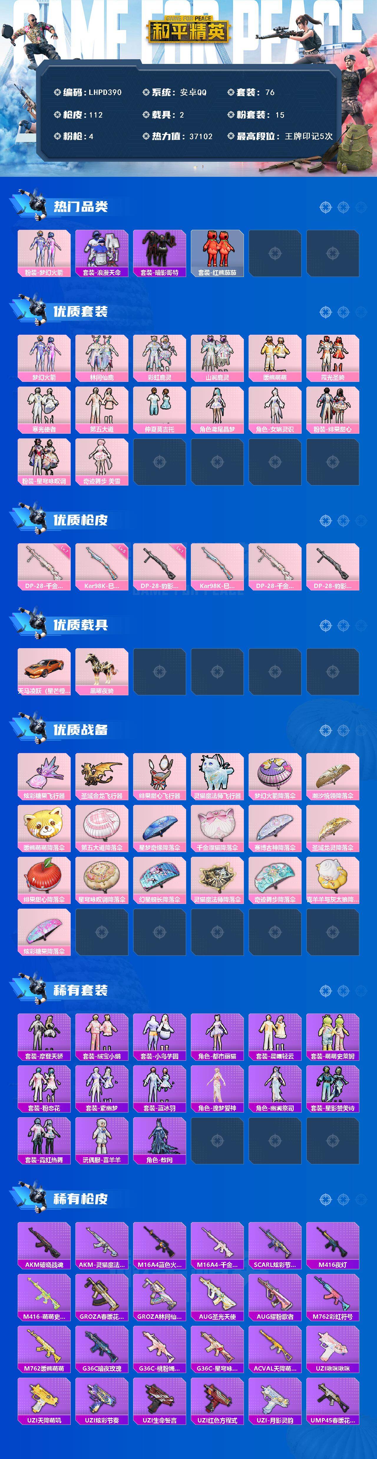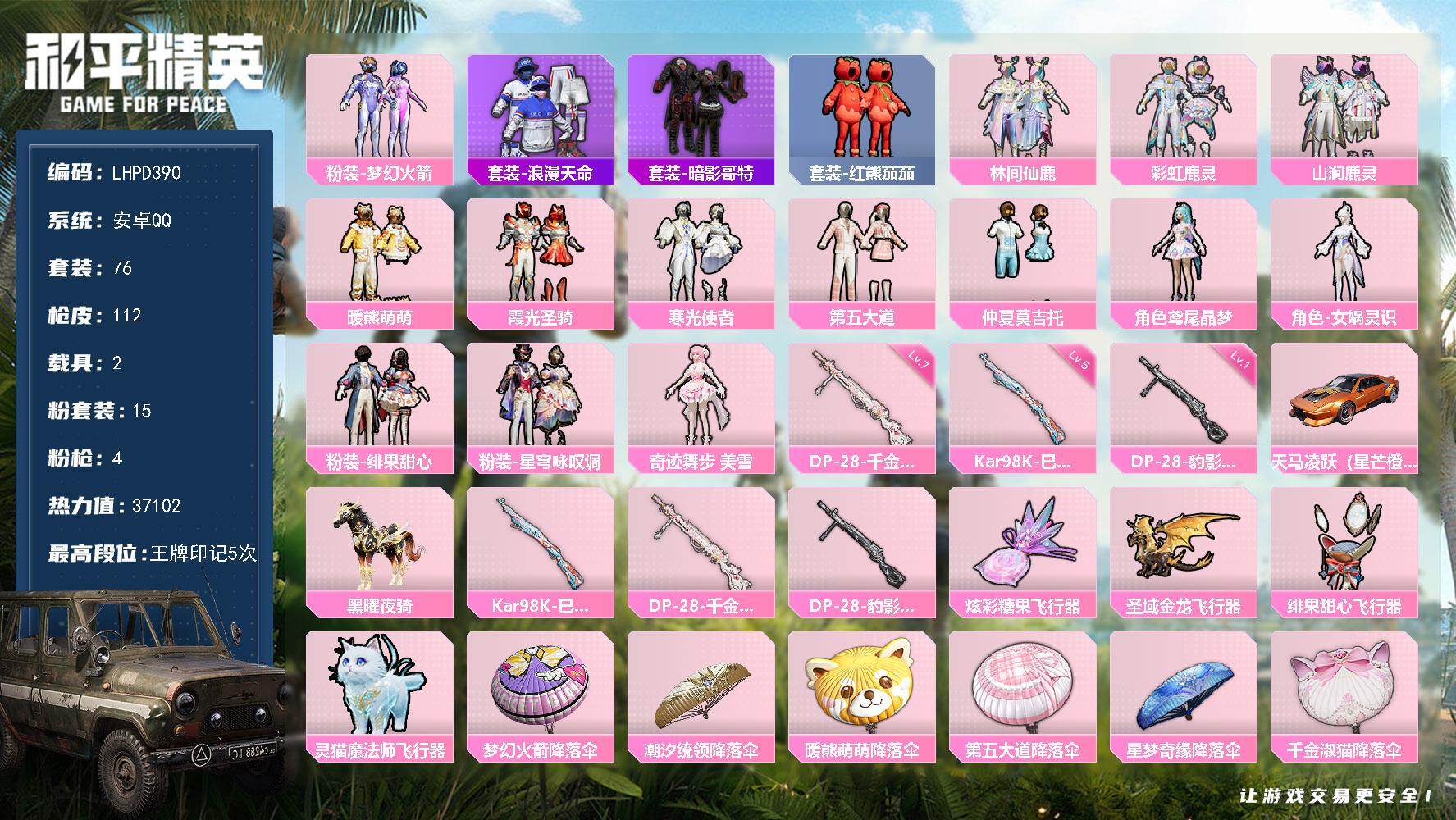 [16892906]【店主推荐捡漏号!可直接换绑】安卓 手Q-15粉装-4特效枪-2载具-5粉色飞行器-37102热力值-5王牌印记-76套装-112枪皮【热门品类】:粉装-梦幻火箭,套装-浪漫天命,套装-暗影哥特,套装-红熊茄茄【粉色套装】:粉装-梦幻火箭,粉装-林间仙鹿,粉装-彩虹鹿灵,粉装-山涧鹿灵,粉装-暖熊萌萌,粉装-霞光圣骑,粉装-寒光使者,粉装-第五大道,粉装-仲夏莫吉托,角色-鸢尾晶梦,角色-女娲灵识,粉装-绯果甜心,粉装-星穹咏叹调,角色-奇迹舞步 美雪【粉色枪皮等级】:Kar98K-巳巳如意(五级),DP-28-千金淑猫(七级),DP-28-豹影疾电(一级)【粉色载具】:天马凌跃(星芒橙),黑曜夜骑【粉色枪皮】:SCAR-L-灵驹仙姬,Kar98K-巳巳如意,DP-28-千金淑猫,DP-28-豹影疾电【粉色飞行器】:炫彩糖果飞行器,圣域金龙飞行器,绯果甜心飞行器,灵猫魔法师飞行器,云梦轻舟飞行器