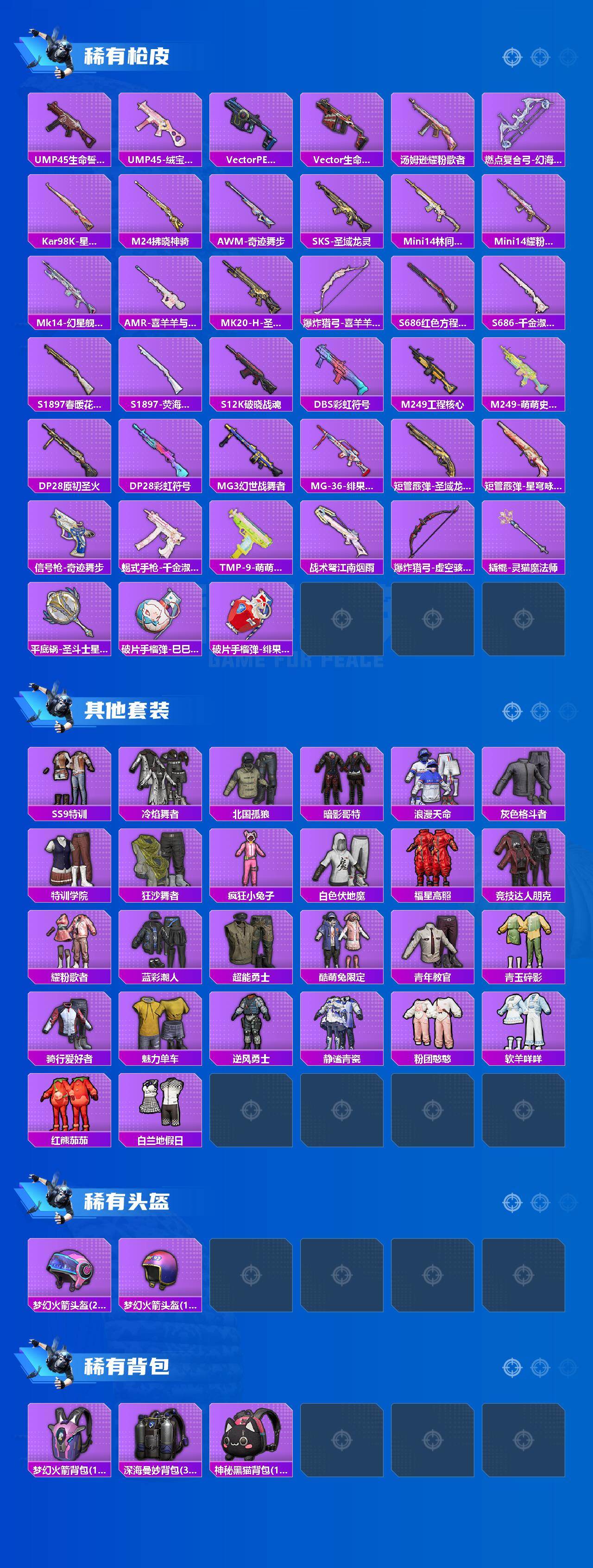 - [16173855]云南一区-17V-0王者-0炫金 【热门武器】:Kar98K-星神,C.A.T,M4A1-黑骑士,汤姆逊-烈龙,沙鹰-修罗*2 【皮肤】:火麒麟-平天大圣,战神-粉色甜心皮肤,战神-紫绶金章皮肤,修罗-冠军之魂 【角色】:零,葵,妮妮,修道士,风暴女,零-水下丽影,潘多拉-甜心教官,蛇姬,铁骑荣耀,雪莉杨,樱-战斗天使,影武者-X 【人偶武器】:C.A.T,灵狐娃娃手雷 【英雄级武器】:AK47-火麒麟,M4A1-黑骑士,AWM-天龙,Kar98K-星神,汤姆逊-烈龙,沙鹰-修罗*2,沙鹰-天神*3,屠龙,龙啸*2,擎天,高爆手雷-古蛇迷踪,烟雾弹-古蛇迷踪 【道具】:CFS限定背包,古蛇迷踪炫彩背包,超级背包,女皇终结者-魔龙之吻,绿色巨人,灵魂忍者,迷雾幽灵,夺命之镰,防化服*3,枪王排位28赛季金色流光,枪王排位29赛季金色流光,古蛇迷踪打击特效,蛇隐宗表情,电玩兔兔表情,EP战队名片,EP战队喷图,EP战队击杀图标,防弹头盔*6,防弹衣*6,C4工具钳*7,手雷包*7 【特殊枪械】:1黑骑士,1烈龙
