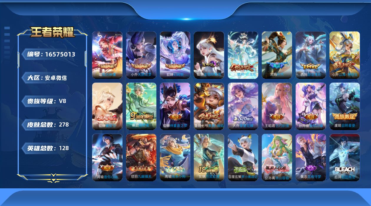 [16575013]安卓WX-V8-最强王者段位-128英雄-278皮肤-3典藏皮肤-13传说-99史诗