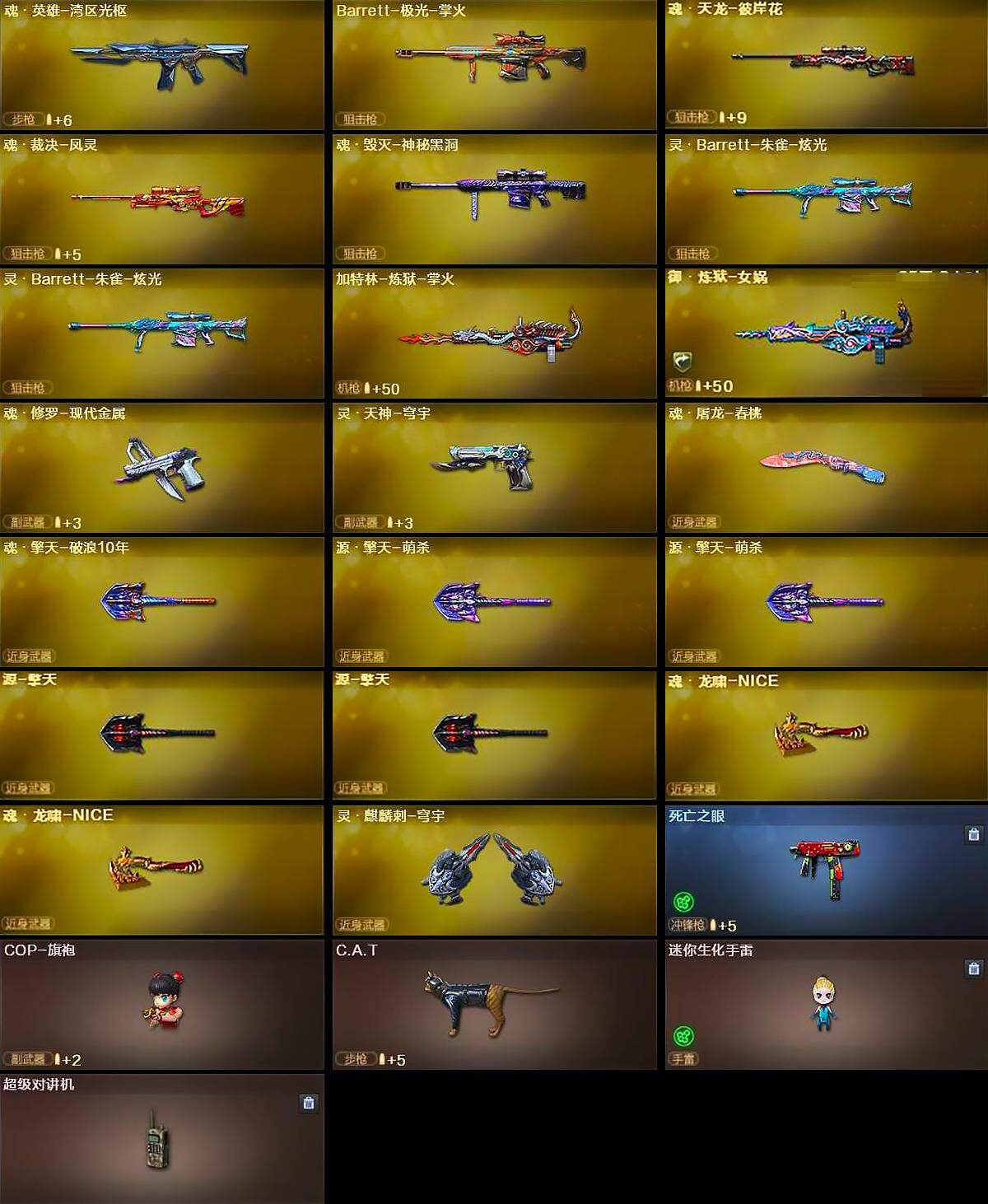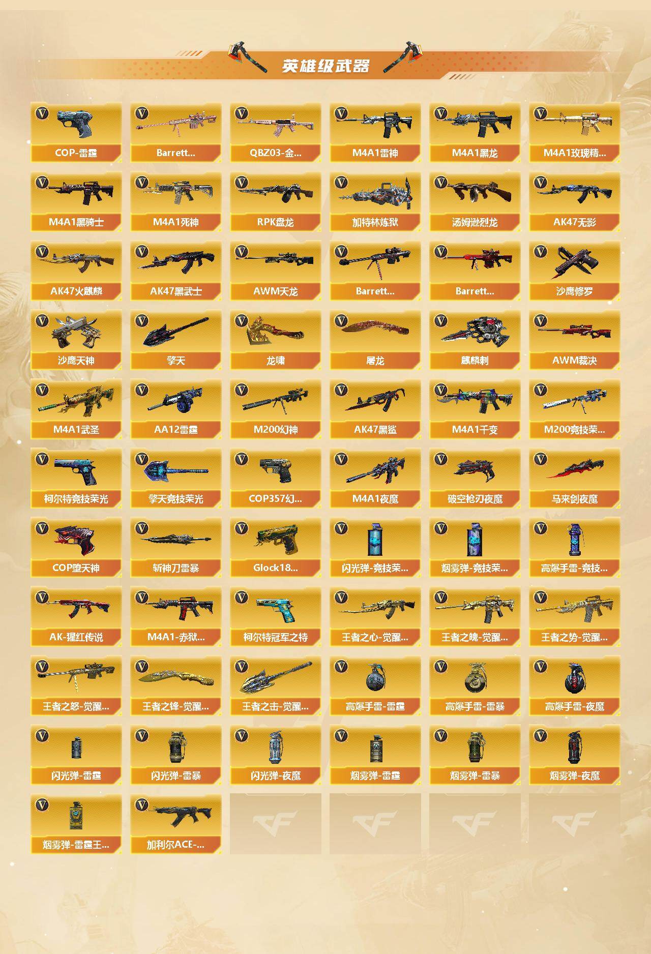 【英雄级武器】:M4A1-千变*2,AK47-火麒麟*3,M4A1-黑龙*2,M4A1-雷神*3,M4A1-黑骑士,AK47-无影,M4A1-死神*2,AK47-黑武士*3,M4A1-武圣*3,AK47-黑鲨,M4A1-夜魔*2,M4A1-玫瑰精灵,QBZ03-金色蔷薇,王者之心-觉醒版,王者之魄-觉醒版,王者之势-觉醒版,AK-47-猩红传说,加利尔ACE-天袭,AWM-天龙*5,Barrett-毁灭*6,Barrett-极光,AWM-裁决,M200-幻神,M200-竞技荣光,Barrett-金色蔷薇,王者之怒-觉醒版,RPK-盘龙,加特林-炼狱*3,汤姆逊-烈