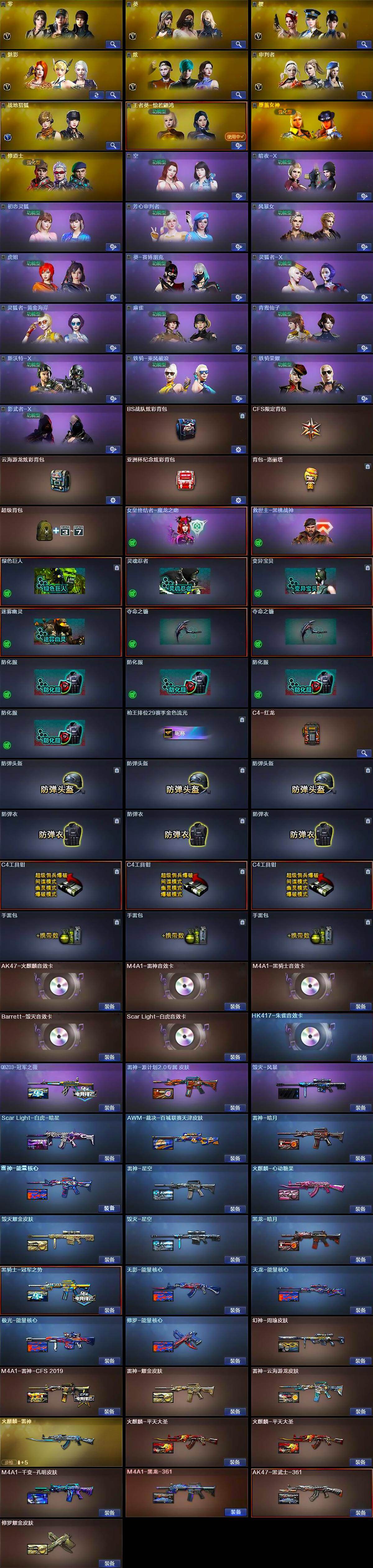 【皮肤】:幻神-周瑜皮肤,Scar Light-白虎-暗星,QBZ03-冠军之薇,AWM-裁决-百城联赛天津皮肤,雷神-暗月,雷神-能量核心,雷神-星空,M4A1-雷神-CFS 2019,雷神-耀金皮肤,雷神-云海游龙皮肤,雷神-源计划2.0专属 皮肤,火麒麟-雷神,火麒麟-平天大圣*2,火麒麟-心动糖果,毁灭耀金皮肤,毁灭-星空,毁灭-风暴,M4A1-千变-孔明皮肤,黑龙-暗月,M4A1-黑龙-361,黑骑士-冠军之势,无影-能量核心,AK47-黑武士-361,天龙-能量核心,极光-能量核心,修罗-能量核心,修罗耀金皮肤