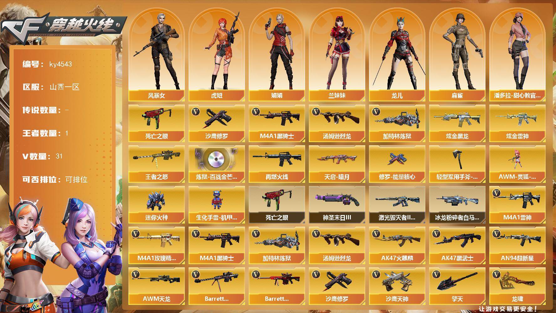 [16755362]山西一区-31V-1王者-2炫金 【热门武器】:死亡之眼*2,M4A1-黑骑士,汤姆逊-烈龙*4,加特林-炼狱,沙鹰-修罗*4 【王者炫金武器】:王者之怒,炫金黑龙,炫金雷神 【音效卡】:炼狱-百战金芒-庆典舞曲音效卡 【皮肤】:M4A1-再燃火线,天启-暗月,修罗-能量核心,轻型军用手斧-再燃火线 【角色】:风暴女,虎妞,娟娟,兰妹妹,龙儿,麻雀,潘多拉-甜心教官,雪莉杨,影武者-X 【人偶武器】:AWM-灵狐-15周年嘉年华,迷你火种,生化手雷-机甲核心 【暴走生化】:死亡之眼*2 【挑战大师】:冰龙粉碎者-白马银枪,激光毁灭者III-白马银枪*2,神圣爆裂者-末日III 【英雄级武器】:AK47-火麒麟,M4A1-雷神*2,M4A1-黑骑士,AK47-黑武士*2,AN94-超新星,M4A1-玫瑰精灵,AWM-天龙,Barrett-毁灭,Barrett-极光,AWM-裁决,加特林-炼狱,炼狱-百战金芒,汤姆逊-烈龙*4,沙鹰-修罗*4,沙鹰-天神,屠龙,龙啸,擎天,麒麟刺,麒麟刺-百战金芒 【道具】:BS战队炫彩背包,炫彩背包,百战金芒炫彩背包,女皇终结者-魔龙之吻,绿色巨人,灵魂忍者,迷雾幽灵,夺命之镰,防化服*3,金色流光-枪王排位,流光-鎏金之域,语音特效-盛典烟火,萌萌小葵表情,防弹头盔*4,防弹衣*5,C4工具钳*4,手雷包*4 【特殊枪械】:1黑骑士,4烈龙,1炼狱