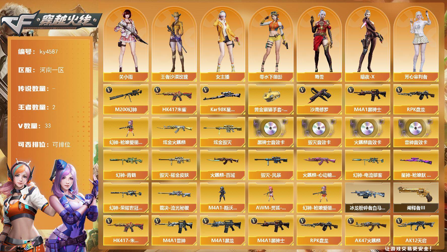 [16756608]河南一区-33V-2王者-2炫金 【热门武器】:HK417-朱雀,M200-幻神,Kar98K-星神,M4A1-黑骑士*2,RPK-盘龙,幻神-枪娘爱丽丝,沙鹰-修罗,黄金猫猫手套-白鲨 【王者炫金武器】:炫金火麒麟,炫金毁灭 【音效卡】:AK47-火麒麟音效卡,M4A1-雷神音效卡,M4A1-黑骑士音效卡,Barrett-毁灭音效卡 【皮肤】:幻神-青鹤,幻神-电流骇客 皮肤,幻神-荣耀世冠白鲨2023 皮肤,裁决-流光秘银,星神-枪娘默 皮肤,火麒麟-百城,火麒麟-心动糖果,毁灭耀金皮肤,毁灭-风暴 【角色】:关小雨,王者沙漠玫瑰,暗夜-X,芳心审判者,嘉年华灵狐,娟娟,兰-海滩派对,零-水下丽影,灵狐者-X,灵狐者-七夕宝贝,女主播,潘多拉-X,潘多拉-甜心教官,斯沃特-X,蜀雪,影武者-X 【人偶武器】:幻神-枪娘爱丽丝,AWM-灵狐-15周年嘉年华,M4A1-斯沃特 【挑战大师】:冰龙粉碎者-白马银枪,阐释者III 【英雄级武器】:AK47-火麒麟*2,M4A1-黑龙*2,M4A1-雷神*2,M4A1-黑骑士*2,AK12-天启,AK47-黑鲨,HK417-朱雀,无影-神兵利器,AWM-天龙,Barrett-毁灭,AWM-裁决,M200-幻神,Kar98K-星神,RPK-盘龙,沙鹰-修罗,屠龙,龙啸,擎天,麒麟刺*2,王者之锋-觉醒版*2,高爆手雷-竞技荣光*3,闪光弹-竞技荣光,烟雾弹-竞技荣光*3,M4A1-赤狱骑士 【道具】:神秘礼盒背包,BS战队炫彩背包,全能枪王背包,冰冰企鹅背包-猛男专用,炫彩背包,背包-葫芦兄弟,女皇终结者-魔龙之吻,绿色巨人,灵魂忍者,迷雾幽灵,夺命之镰,防化服*3,金色流光-枪王排位,枪王排位29赛季金色流光,防弹头盔*4,防弹衣*4,C4工具钳*3,手雷包*3 【特殊枪械】:2黑骑士,1盘龙