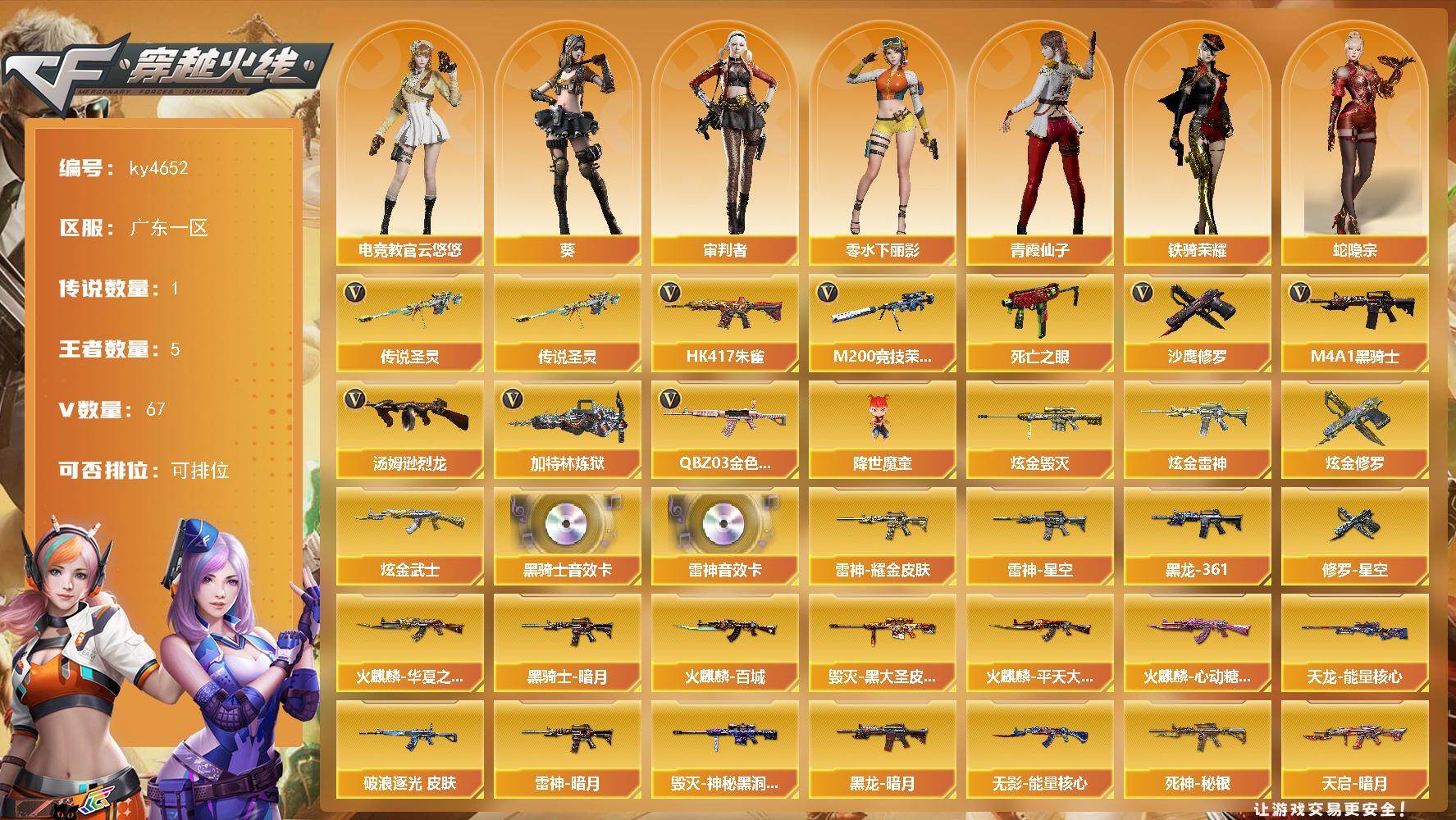 [16759439]广东一区-67V-5王者-4炫金 【传说武器】:传说圣灵 【热门武器】:传说圣灵,QBZ03-金色蔷薇,HK417-朱雀,M200-竞技荣光,死亡之眼,M4A1-黑骑士,汤姆逊-烈龙,加特林-炼狱,降世魔童,沙鹰-修罗*2 【王者炫金武器】:炫金雷神,炫金武士,炫金毁灭,炫金修罗 【音效卡】:M4A1-雷神音效卡,M4A1-黑骑士音效卡 【皮肤】:金色蔷薇-破浪逐光 皮肤,雷神-暗月,雷神-星空,雷神-耀金皮肤,火麒麟-华夏之心,火麒麟-平天大圣*2,火麒麟-百城,火麒麟-心动糖果,毁灭-黑大圣皮肤,毁灭-神秘黑洞皮肤,黑龙-暗月,M4A1-黑龙-361,黑骑士-暗月*3,无影-能量核心,死神-秘银,天启-暗月*2,AK47-B-常胜将军-曹操,AK47-B-常胜将军-刘备,天龙-能量核心,极光-能量核心,Barrett-金色蔷薇-蛇姬 皮肤,修罗-能量核心,修罗-星空,屠龙-破浪逐光 皮肤*2,龙啸-蛇姬 皮肤 【角色】:葵,电竞教官-云悠悠,审判者,蛇隐宗,乔伊教练,修道士,空,暗夜-X,初恋灵狐,芳心审判者,风暴女,嘉年华灵狐,娟娟,猎狐者-追月,零-水下丽影,灵狐者-七夕宝贝,潘多拉-X,青霞仙子,蛇姬,斯沃特-X,铁骑荣耀,维纳斯,新娜塔莎,雪莉杨-摸金校尉,夜玫瑰-宠粉,影武者-X,智影 【人偶武器】:AWM-灵狐-15周年嘉年华,迷你深渊冰龙,迷你裂空之翼*2,迷你波特博士*2,迷你牛牛,降世魔童 【暴走生化】:死亡之眼,超级对讲机 【挑战大师】:冰龙粉碎者-白马银枪,激光毁灭者III-白马银枪,激光毁灭者III*2,机甲撕裂者III,试炼破坏者III,神圣爆裂者-末日III*3,阐释者III 【英雄级武器】:AK47-火麒麟,M4A1-黑龙,M4A1-雷神*2,M4A1-黑骑士,AK47-无影,M4A1-死神,AK47-黑武士,AK12-天启,AN94-超新星,HK417-朱雀,无影-神兵利器,黑武士-锦绣游龙,QBZ03-金色蔷薇,王者火魄-觉醒版,黑武士-CF网剧冠军,AWM-天龙,Barrett-毁灭,Barrett-极光,Barrett-朱雀,M200-竞技荣光,Barrett-金色蔷薇,加特林-炼狱,汤姆逊-烈龙,沙鹰-修罗*2,沙鹰-天神*2,柯尔特-竞技荣光,USP-神工天巧,天神-CF网剧冠军,屠龙,龙啸,擎天,擎天-竞技荣光,唐刀
