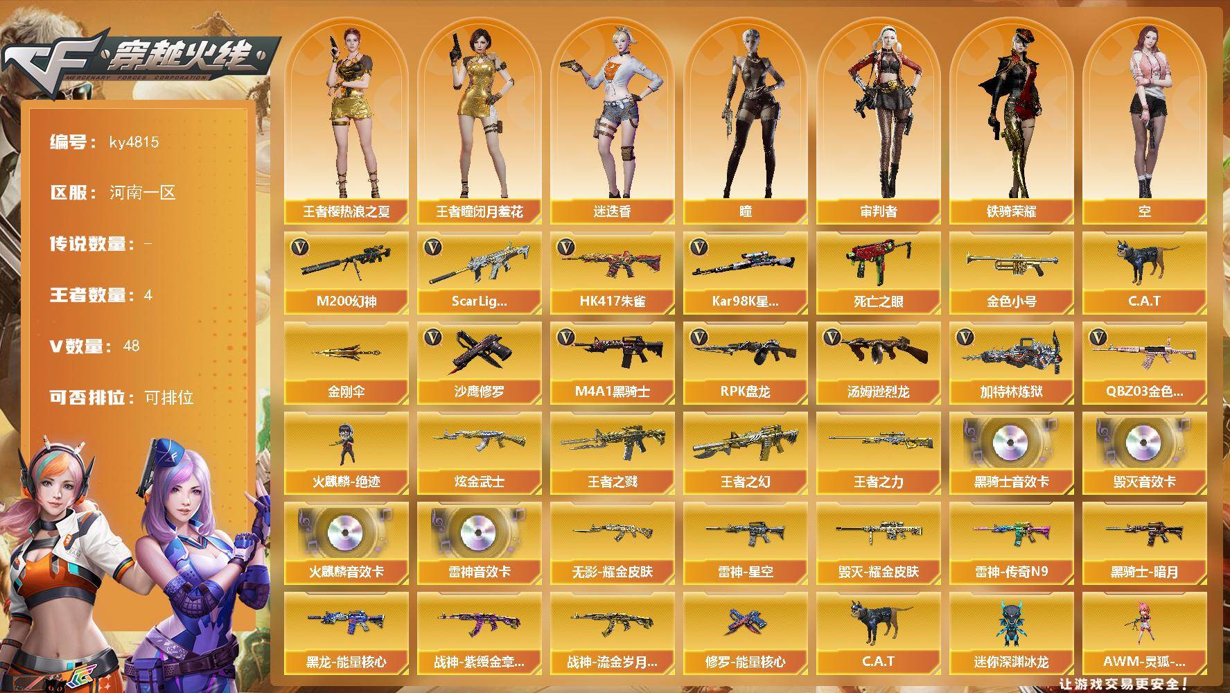 [16760759]河南一区-48V-4王者-1炫金 【热门武器】:QBZ03-金色蔷薇,Scar Light-白虎,HK417-朱雀,M200-幻神,死亡之眼,Kar98K-星神,金色小号,C.A.T,M4A1-黑骑士*2,汤姆逊-烈龙*6,RPK-盘龙*2,加特林-炼狱*5,火麒麟-绝迹,沙鹰-修罗,金刚伞*2 【王者炫金武器】:王者之戮,王者之幻,王者之力,炫金武士 【音效卡】:AK47-火麒麟音效卡,M4A1-雷神音效卡,M4A1-黑骑士音效卡,Barrett-毁灭音效卡 【皮肤】:雷神-星空,雷神-传奇N9,毁灭耀金皮肤,黑龙-能量核心,黑骑士-暗月,无影耀金皮肤,战神-紫绶金章皮肤*3,战神-流金岁月皮肤*2,修罗-能量核心 【角色】:瞳,迷迭香,审判者,王者-瞳-闭月羞花,王者樱-热浪之夏,空,嘉年华灵狐,兰妹妹,龙儿,潘多拉-X,潜龙队-X,铁骑荣耀,兔囡囡,新娜塔莎,影武者-X 【人偶武器】:火麒麟-绝迹,M4A1-雷神-精英刀锋,AWM-灵狐-15周年嘉年华,C.A.T,迷你深渊冰龙*3,迷你牛魔王,迷你波特博士*3,夺魂,迷你火种*2,生化手雷-机甲核心*2,深渊终结者手雷,闪光弹-小乔 【暴走生化】:死亡之眼 【挑战大师】:火狱乱世-超越Max,神圣爆裂者III,冰龙粉碎者-白马银枪,激光毁灭者III-白马银枪,机甲撕裂者III,试炼破坏者III,惩戒者III 【英雄级武器】:AK47-火麒麟,M4A1-雷神,M4A1-黑骑士*2,AK47-无影,AK47-黑武士,AN94-超新星,HK417-朱雀,Scar Light-白虎,无影-神兵利器,QBZ03-金色蔷薇,王者之武-觉醒版,AK-47-猩红传说*6,AK47-B-战神,黑骑士-海王,Barrett-毁灭,AWM-裁决,M200-幻神,Kar98K-星神,RPK-盘龙*2,加特林-炼狱*5,汤姆逊-烈龙*6,AA-12-雷霆,沙鹰-修罗,屠龙*3,擎天,麒麟刺 【道具】:AG战队炫彩背包,全能枪王背包,冰冰企鹅背包-猛男专用,炫彩背包,超级背包,灵魂忍者,变异宝贝,生化弹匣,夺命之镰,防化服,金色流光-枪王排位*2,星辰流光-枪王排位,防弹头盔*7,防弹衣*4,C4工具钳*3,手雷包*2 【特殊枪械】:1白虎,2黑骑士,6烈龙,2盘龙,5炼狱