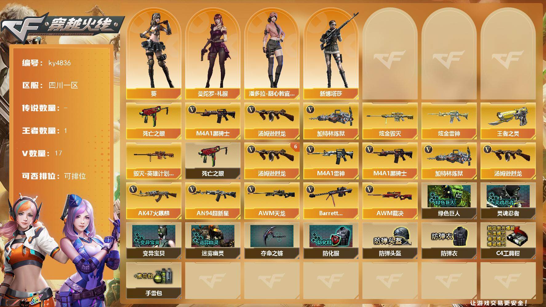 [16761958]四川一区-17V-1王者-2炫金 【热门武器】:死亡之眼,M4A1-黑骑士,汤姆逊-烈龙*6,加特林-炼狱 【王者炫金武器】:王者之灵,炫金雷神,炫金毁灭 【皮肤】:毁灭-英雄计划 皮肤 【角色】:葵,曼陀罗-礼服,潘多拉-甜心教官,新娜塔莎 【暴走生化】:死亡之眼 【英雄级武器】:AK47-火麒麟*2,M4A1-雷神,M4A1-黑骑士,AN94-超新星,AWM-天龙,Barrett-毁灭,AWM-裁决,加特林-炼狱,汤姆逊-烈龙*6 【道具】:绿色巨人,灵魂忍者,变异宝贝,迷雾幽灵,夺命之镰,防化服*2,防弹头盔*3,防弹衣*5,C4工具钳*3,手雷包*3 【特殊枪械】:1黑骑士,6烈龙,1炼狱