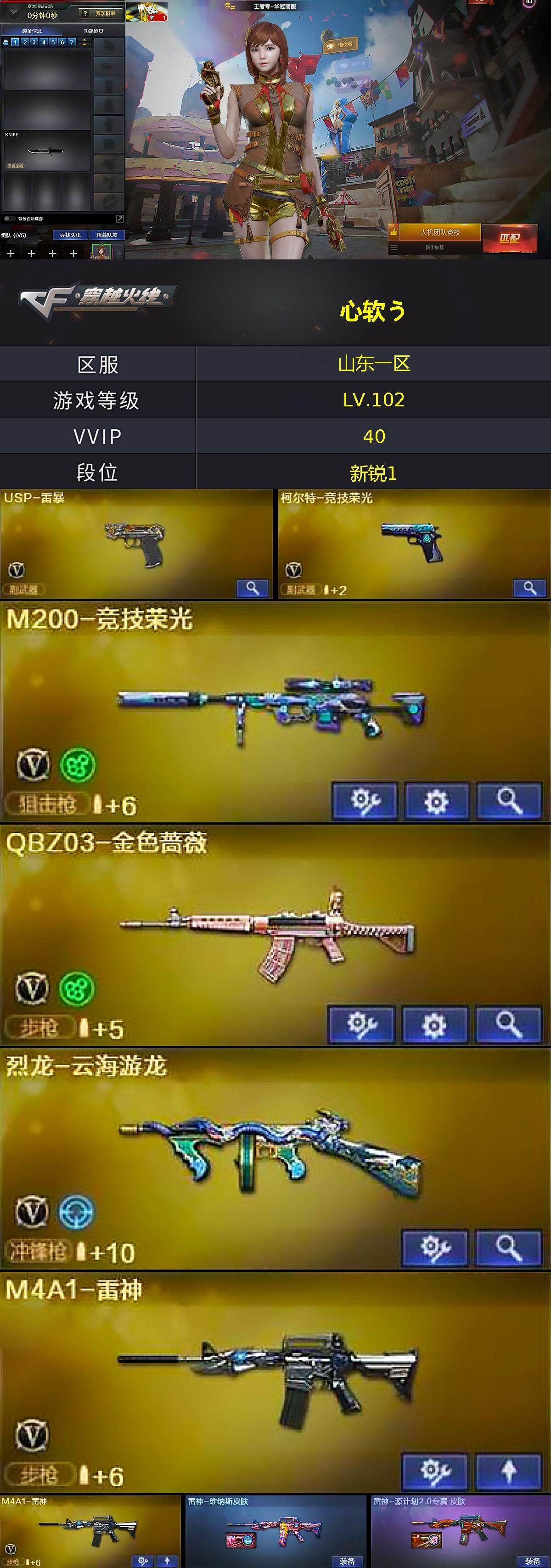 【热门武器】:QBZ03-金色蔷薇,M200-竞技荣光,炼狱-迷你小钢,M4A1-黑骑士,USP-雷暴,沙鹰-修罗*2