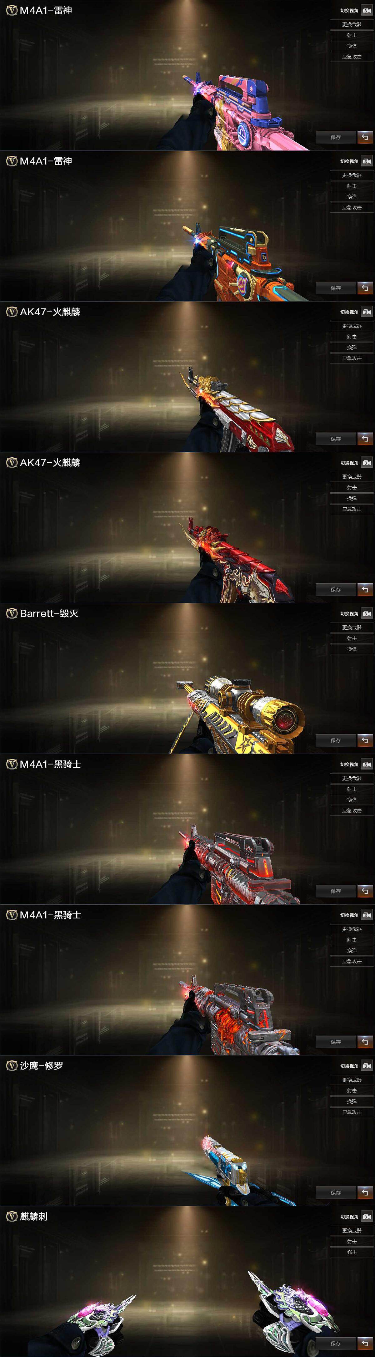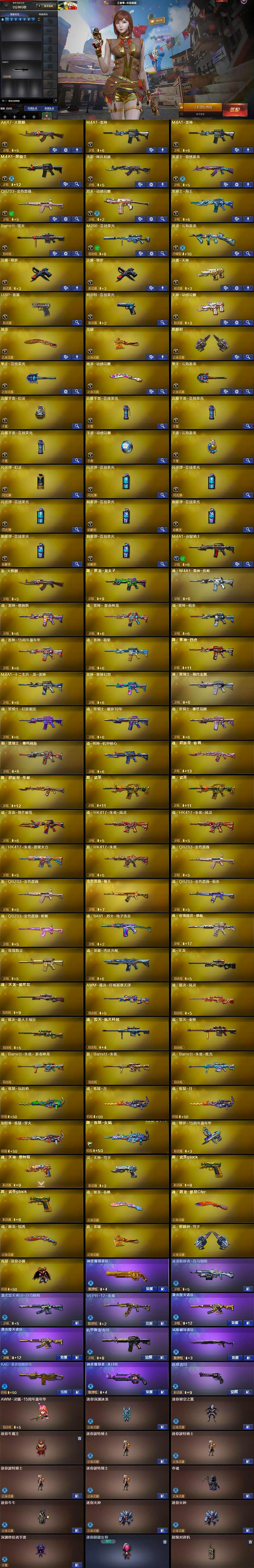 【英雄级武器】:AK47-火麒麟,M4A1-雷神*2,M4A1-黑骑士,无影-神兵利器,黑武士-锦绣游龙,QBZ03-金色蔷薇,烈火-动感闪耀,黑骑士-海王,Barrett-毁灭,M200-竞技荣光,烈龙-云海游龙,沙鹰-修罗*2,沙鹰-天神,USP-雷暴,柯尔特-竞技荣光,天神-动感闪耀,屠龙,龙啸,麒麟刺,擎天-竞技荣光,屠龙-动感闪耀,擎天-云海游龙,高爆手雷-幻灵,高爆手雷-竞技荣光*3,手雷-动感闪耀,手雷-云海游龙,闪光弹-幻灵,闪光弹-竞技荣光*3,烟雾弹-竞技荣光*4,M4A1-赤狱骑士