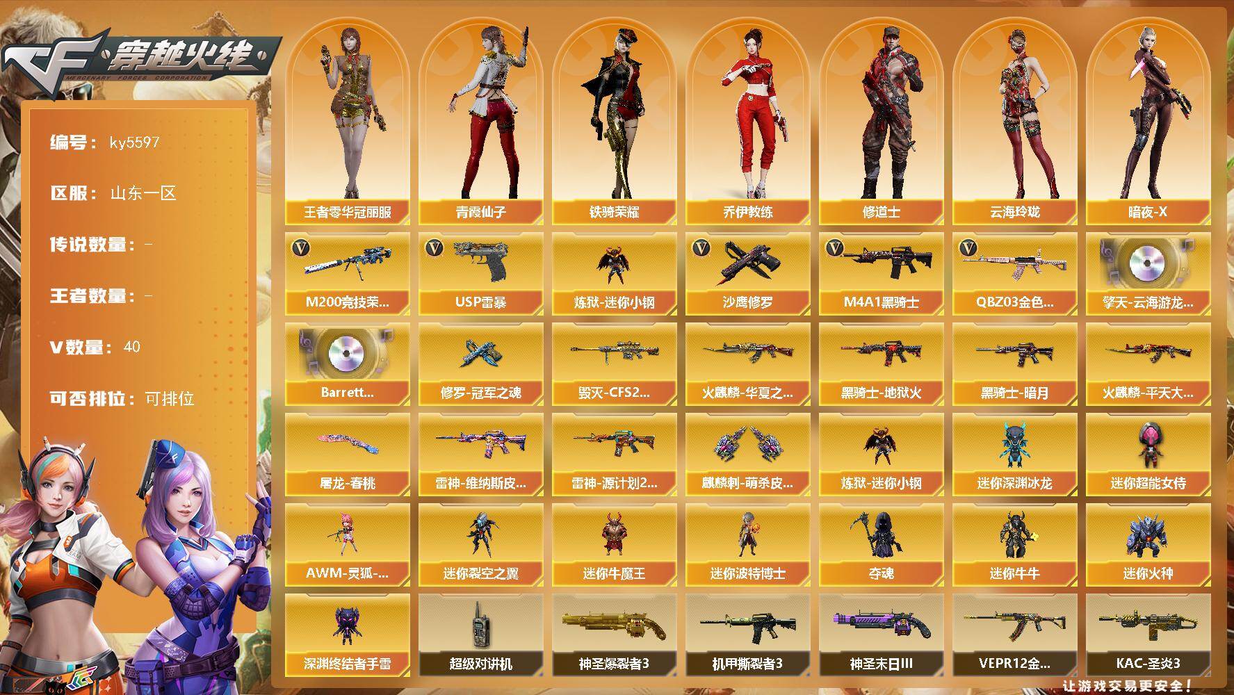 [16844379]山东一区-45V-0王者武器数-0炫金武器数 【热门武器】:QBZ03-金色蔷薇,M200-竞技荣光,炼狱-迷你小钢,M4A1-黑骑士,USP-雷暴,沙鹰-修罗*2 【音效卡】:擎天-云海游龙音效卡,Barrett-碧霄极光音效卡 【皮肤】:雷神-维纳斯皮肤,雷神-源计划2.0专属 皮肤,火麒麟-华夏之心,火麒麟-平天大圣,毁灭-CFS2020,黑骑士-暗月*2,黑骑士-地狱火,修罗-冠军之魂,屠龙-春桃 皮肤,麒麟刺-萌杀皮肤 【角色】:王者零-华冠丽服,乔伊教练,修道士,云海玲珑,暗夜-X,初恋灵狐,电竞少女,芳心审判者,飞虎队-X,风暴女,虎妞,嘉年华灵狐,娟娟,灵狐-花神,灵狐者-X,麻雀,曼陀罗-X,曼陀罗-礼服,萌儿,潘多拉-X,青霞仙子,斯沃特-X,铁骑荣耀,兔囡囡,维纳斯,新娜塔莎,雪莉杨-摸金校尉,夜玫瑰-幻能朋克,樱-战斗天使,影武者-X,游珑儿 【人偶武器】:炼狱-迷你小钢,AWM-灵狐-15周年嘉年华,迷你深渊冰龙,迷你裂空之翼,迷你牛魔王,迷你波特博士*4,夺魂,迷你牛牛,迷你火种*2,深渊终结者手雷,迷你超能女侍 【暴走生化】:超级对讲机 【挑战大师】:神圣爆裂者III,冰龙粉碎者-白马银枪,激光毁灭者III-白马银枪,VEPR-12-金魔,激光毁灭者III*2,机甲撕裂者III,试炼破坏者III,KAC-圣炎切割者III,神圣爆裂者-末日III,惩戒者III 【英雄级武器】:AK47-火麒麟,M4A1-雷神*2,M4A1-黑骑士,无影-神兵利器,黑武士-锦绣游龙,QBZ03-金色蔷薇,烈火-动感闪耀,黑骑士-海王,Barrett-毁灭,M200-竞技荣光,烈龙-云海游龙,沙鹰-修罗*2,沙鹰-天神,USP-雷暴,柯尔特-竞技荣光,天神-动感闪耀,屠龙,龙啸,麒麟刺,擎天-竞技荣光,屠龙-动感闪耀,擎天-云海游龙,高爆手雷-幻灵,高爆手雷-竞技荣光*3,手雷-动感闪耀,手雷-云海游龙,闪光弹-幻灵,闪光弹-竞技荣光*3,烟雾弹-竞技荣光*4,M4A1-赤狱骑士 【道具】:BS战队炫彩背包,CFS限定背包,云海游龙炫彩背包,亚洲杯纪念炫彩背包,全能枪王背包,女皇终结者-背包,超级背包,黄金曼提柯尔的背包,黄金超能特工背包,女皇终结者-魔龙之吻,绿色巨人,灵魂忍者*2,变异宝贝,迷雾幽灵*2,生化弹匣,夺命之镰,防化服*3,金色流光-枪王排