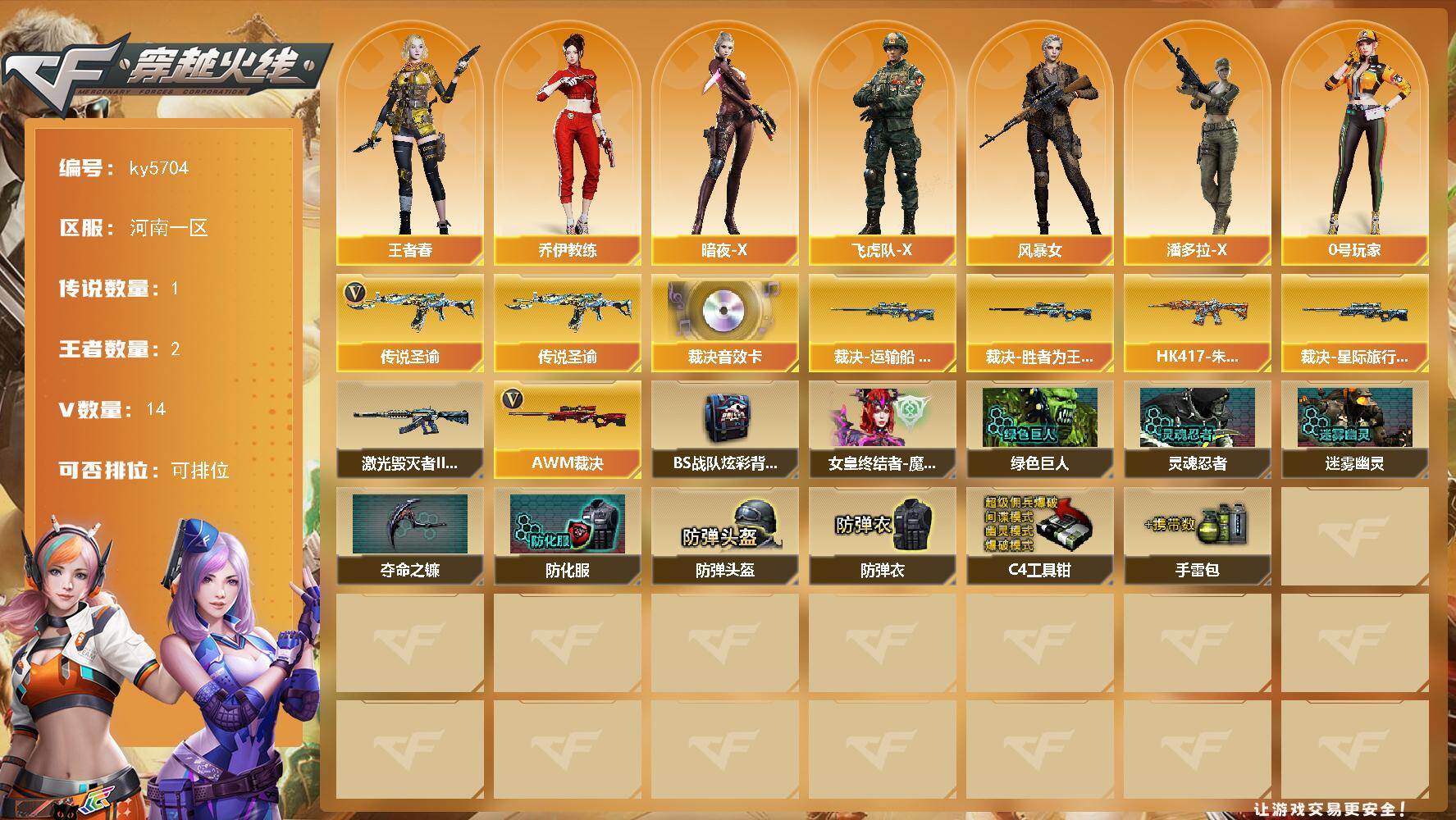 [16802358]河南一区-18V-2王者武器数-0炫金武器数 【传说武器】:传说圣谕 【热门武器】:传说圣谕 【音效卡】:AWM-裁决音效卡 【皮肤】:裁决-运输船 皮肤,裁决-胜者为王 皮肤,裁决-星际旅行 皮肤,HK417-朱雀-掌火灵橙 皮肤 【角色】:王者春,乔伊教练,暗夜-X,飞虎队-X,风暴女,0号玩家,潘多拉-X 【挑战大师】:激光毁灭者III-白马银枪 【英雄级武器】:AWM-裁决 【道具】:BS战队炫彩背包,女皇终结者-魔龙之吻,绿色巨人,灵魂忍者,迷雾幽灵,夺命之镰,防化服*3,防弹头盔*3,防弹衣*3,C4工具钳*3,手雷包*3 【特殊枪械】: