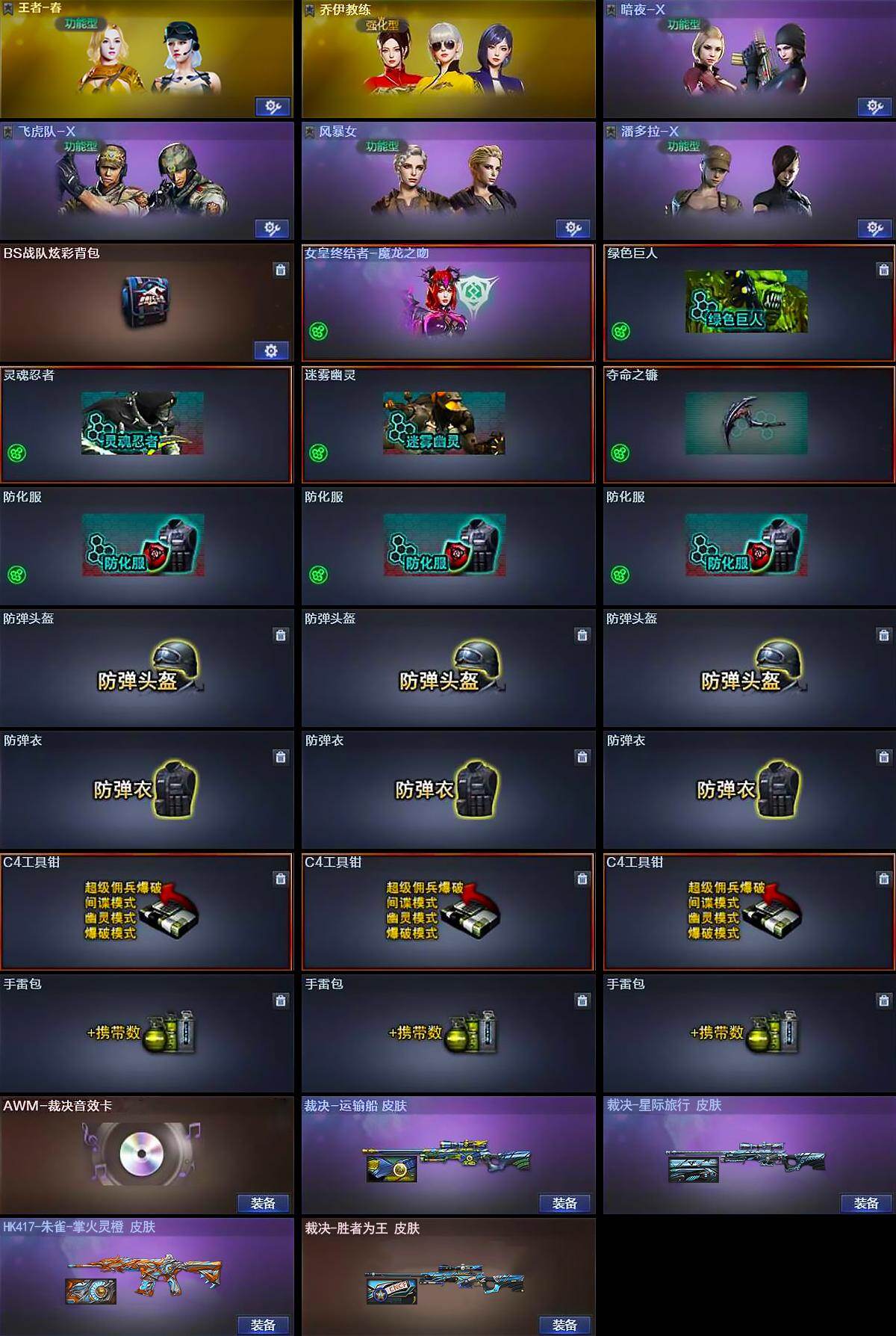 【道具】:BS战队炫彩背包,女皇终结者-魔龙之吻,绿色巨人,灵魂忍者,迷雾幽灵,夺命之镰,防化服*3,防弹头盔*3,防弹衣*3,C4工具钳*3,手雷包*3