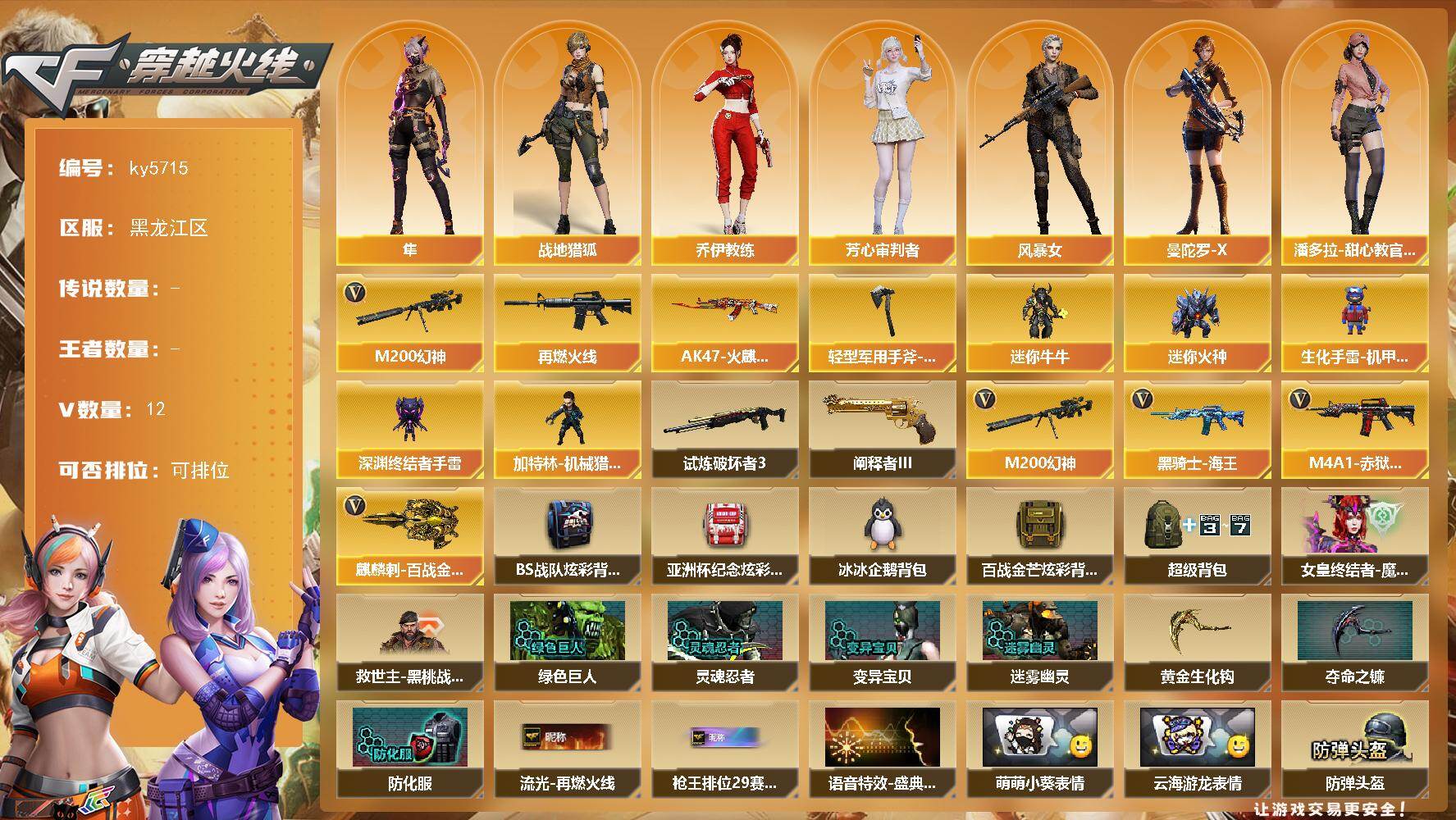 [16768351]黑龙江区-17V-0王者武器数-0炫金武器数 【热门武器】:M200-幻神 【皮肤】:M4A1-再燃火线,AK47-火麒麟-百城23冠军皮肤,轻型军用手斧-再燃火线 【角色】:隼,战地猎狐,乔伊教练,芳心审判者,风暴女,曼陀罗-X,潘多拉-甜心教官,新娜塔莎 【人偶武器】:加特林-机械猎手,迷你牛牛,迷你火种,生化手雷-机甲核心*2,深渊终结者手雷 【挑战大师】:试炼破坏者III,阐释者III 【英雄级武器】:黑骑士-海王,M200-幻神,麒麟刺-百战金芒,M4A1-赤狱骑士 【道具】:BS战队炫彩背包,亚洲杯纪念炫彩背包,冰冰企鹅背包,百战金芒炫彩背包,超级背包,女皇终结者-魔龙之吻,救世主-黑桃战神,黄金生化钩,绿色巨人,灵魂忍者*2,变异宝贝,迷雾幽灵*2,夺命之镰*2,防化服*3,流光-再燃火线,枪王排位29赛季金色流光,语音特效-盛典烟火,萌萌小葵表情,云海游龙表情,防弹头盔*3,防弹衣*3,C4工具钳*3,手雷包*3 【特殊枪械】: