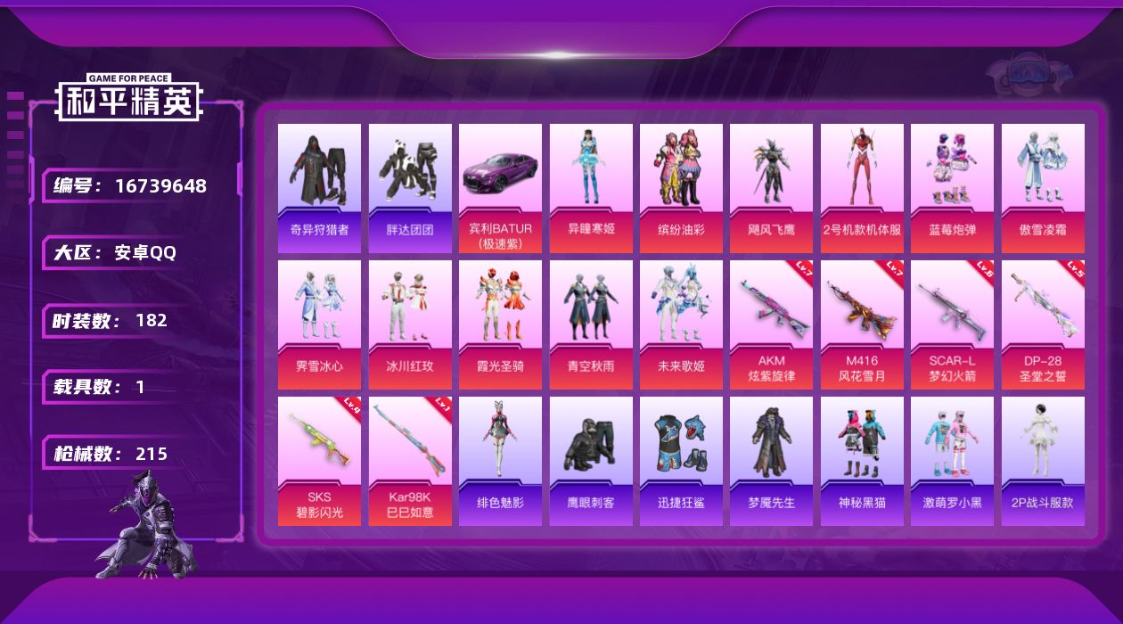 [16739648]可二次【店主推荐捡漏号!可直接换绑】/素材身法号 安卓 手Q-11粉装-6特效枪-1载具-1粉色飞行器-7.1w热力值-13王牌印记-182套装-215枪皮【热门品类】:粉装-缤纷油彩,套装-奇异狩猎者,套装-胖达团团,角色-2P战斗服款,套装-龟仙人【粉色载具】:宾利BATUR(极速紫)【粉色套装】:粉装-缤纷油彩,粉装-飓风飞鹰,角色-2号机款机体服,粉装-蓝莓炮弹,粉装-傲雪凌霜,粉装-霁雪冰心,粉装-冰川红玫,粉装-霞光圣骑,粉装-青空秋雨,粉装-未来歌姬,角色-异瞳寒姬【粉色枪皮等级】:AKM-炫紫旋律(七级),SCAR-L-梦幻火箭(六级),M416-风花雪月(七级),Kar98K-巳巳如意(一级),SKS-碧影闪光(四级),DP-28-圣堂之誓(五级)【粉色飞行器】:绒雪飘舞飞行器