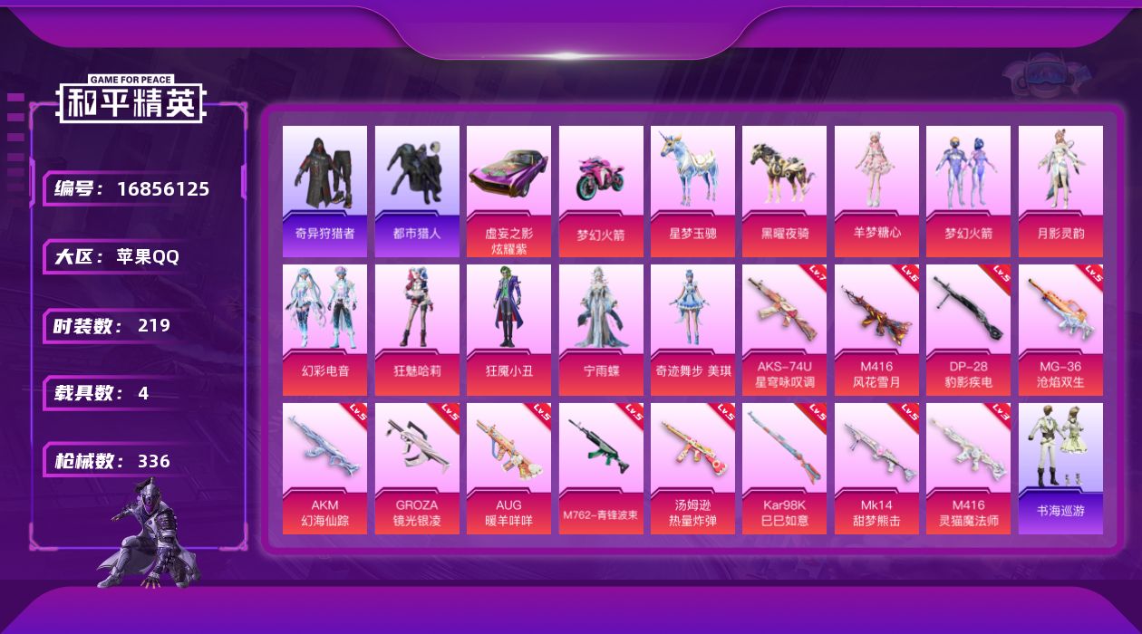 苹果 手Q-8粉装-12特效枪-4载具-4粉色飞行器-101788热力值-12王牌印记-219套装-336枪皮