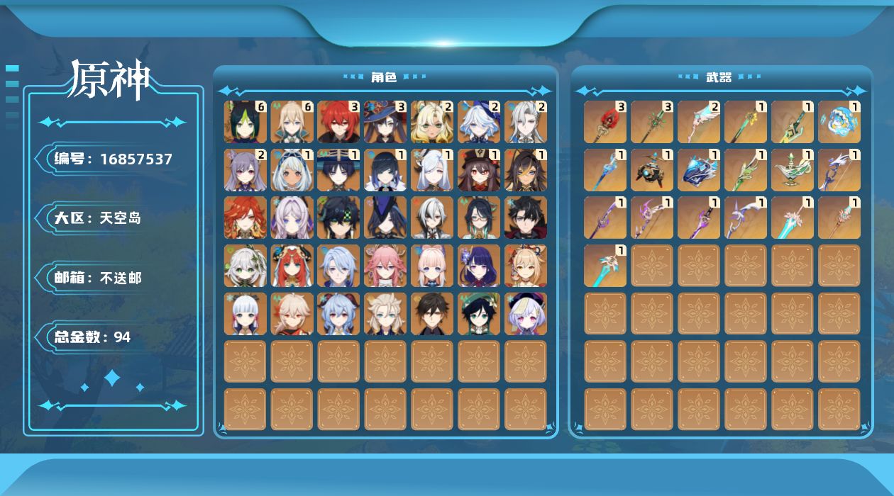 0命克洛琳德,0命阿蕾奇诺,0命闲云,2命芙宁娜,0命莱欧斯利,2命那维莱特,1命迪希雅,1命流浪者,0命纳西妲,0命妮露,满命提纳里,1命夜兰,0命神里绫人,0命八重神子,1命申鹤,0命雷电将军,0命枫原万叶,0命神里绫华,0命钟离,1命胡桃,0命甘雨,0命宵宫,0命温迪,0命阿贝多,0命珊瑚宫心海,2命刻晴,0命七七,满命琴,3命莫娜,3命迪卢克,0命基尼奇,2命希诺宁,1命玛拉妮,0命玛薇卡,0命茜特菈莉,0命菈乌玛,精1静水流涌之辉,精1金流监督,精1万世流涌大典,精1裁叶萃光,精1千夜浮梦,精1若水,精1薙草之稻光,精1飞雷之弦振,精1雾切之回光,精3护摩之杖,精3和璞鸢,精1天空之脊,精2天空之翼,精1阿莫斯之弓,精1天空之刃,精1天空之傲,精1岩峰巡歌,精1山王长牙,精1冲浪时光,精1纺夜天镜