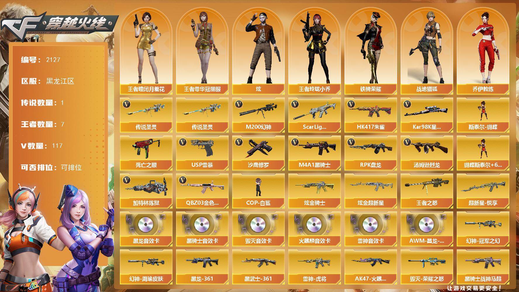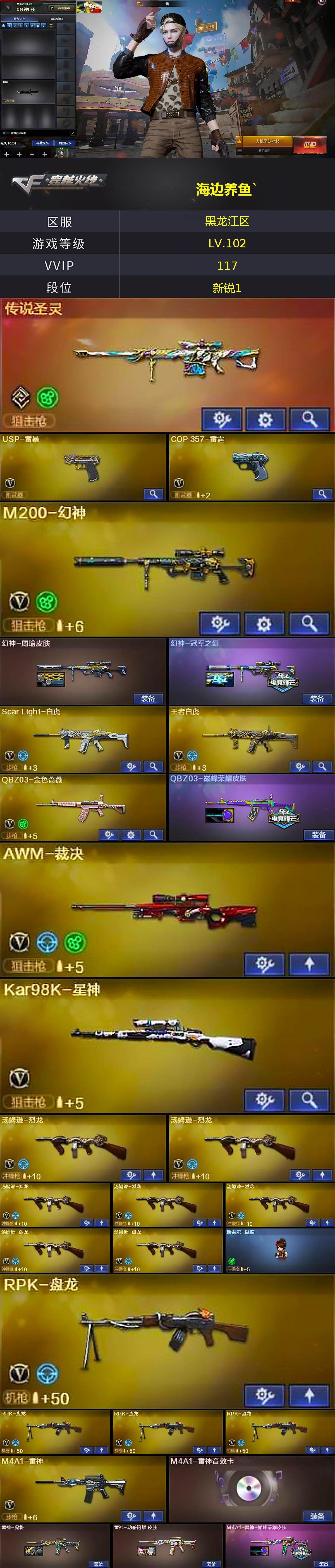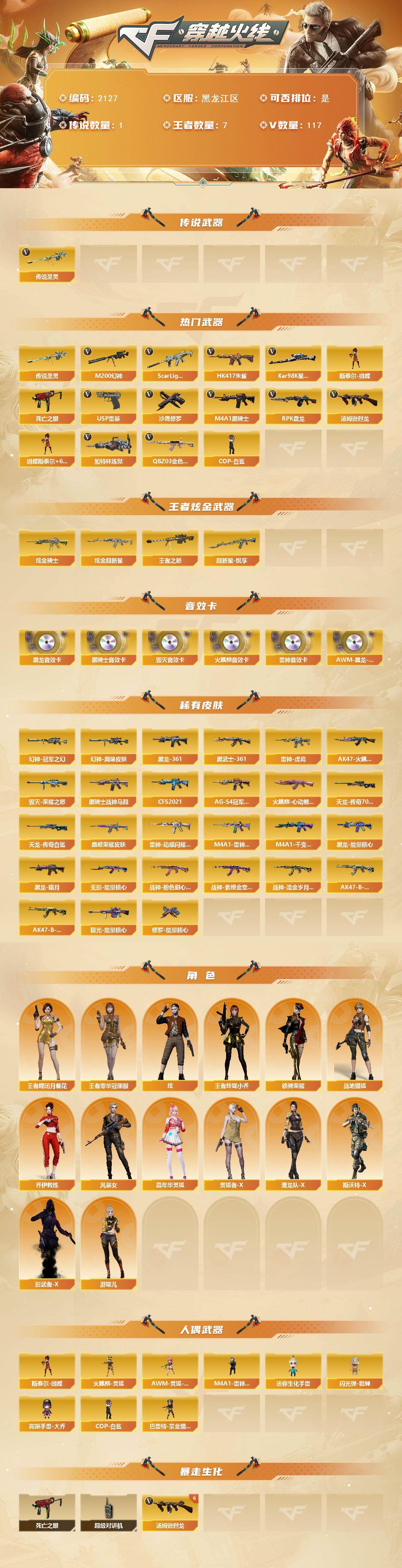 [16901310]黑龙江区-122V-7王者武器数-2炫金武器数 【传说武器】:传说圣灵 【热门武器】:传说圣灵,QBZ03-金色蔷薇,Scar Light-白虎,HK417-朱雀,M200-幻神,死亡之眼,Kar98K-星神,M4A1-黑骑士,汤姆逊-烈龙*7,RPK-盘龙*4,加特林-炼狱*2,斯泰尔-蝴蝶,COP-白鲨,USP-雷暴,沙鹰-修罗*3 【王者炫金武器】:超新星-悦享,王者之怒,炫金骑士,炫金超新星 【音效卡】:AK47-火麒麟音效卡,M4A1-雷神音效卡,M4A1-黑龙音效卡,M4A1-黑骑士音效卡,Barrett-毁灭音效卡,AWM-昌龙-怀旧音效卡 【皮肤】:幻神-周瑜皮肤,幻神-冠军之幻,QBZ03-巅峰荣耀皮肤,雷神-虎将,雷神-动感闪耀 皮肤,M4A1-雷神-巅峰荣耀皮肤,AK47-火麒麟-传奇EVEN,火麒麟-心动糖果,毁灭-荣耀之怒,M4A1-千变-孔明皮肤,黑龙-能量核心,黑龙-暗月,M4A1-黑龙-361,黑骑士-战神马超,黑骑士-CFS2021,黑骑士-AG-S4冠军典藏,无影-能量核心,AK47-黑武士-361,战神-粉色甜心皮肤,战神-紫绶金章皮肤,战神-流金岁月皮肤,AK47-B-常胜将军-刘备,AK47-B-常胜将军-孙权,AWM-天龙-传奇70KG,AWM-天龙-传奇白鲨,极光-能量核心,修罗-能量核心 【角色】:炫,战地猎狐,王者-瞳-闭月羞花,王者零-华冠丽服,王者玲珑-小乔,乔伊教练,风暴女,嘉年华灵狐,灵狐者-X,潜龙队-X,斯沃特-X,铁骑荣耀,影武者-X,游珑儿 【人偶武器】:COP-白鲨,火麒麟-灵狐,M4A1-雷神-精英刀锋,斯泰尔-蝴蝶,AWM-灵狐-15周年嘉年华,迷你生化手雷,闪光弹-貂蝉,高爆手雷-大乔,巴雷特-赏金猎人 【暴走生化】:死亡之眼,超级对讲机 【挑战大师】:神圣爆裂者III,激光毁灭者III,神圣爆裂者-末日III 【英雄级武器】:AK47-火麒麟*2,M4A1-黑龙*2,M4A1-雷神,M4A1-黑骑士,AK47-无影,M4A1-死神,AK47-黑武士*3,AK12-天启,M4A1-武圣*3,AK47-黑鲨,M4A1-龙血*2,M4A1-雷霆,AK47-雷暴,HK417-朱雀,Scar Light-白虎,无影-神兵利器,黑武士-锦绣游龙,QBZ03-金色蔷薇,烈火-动感闪耀,王者之心-觉醒版,